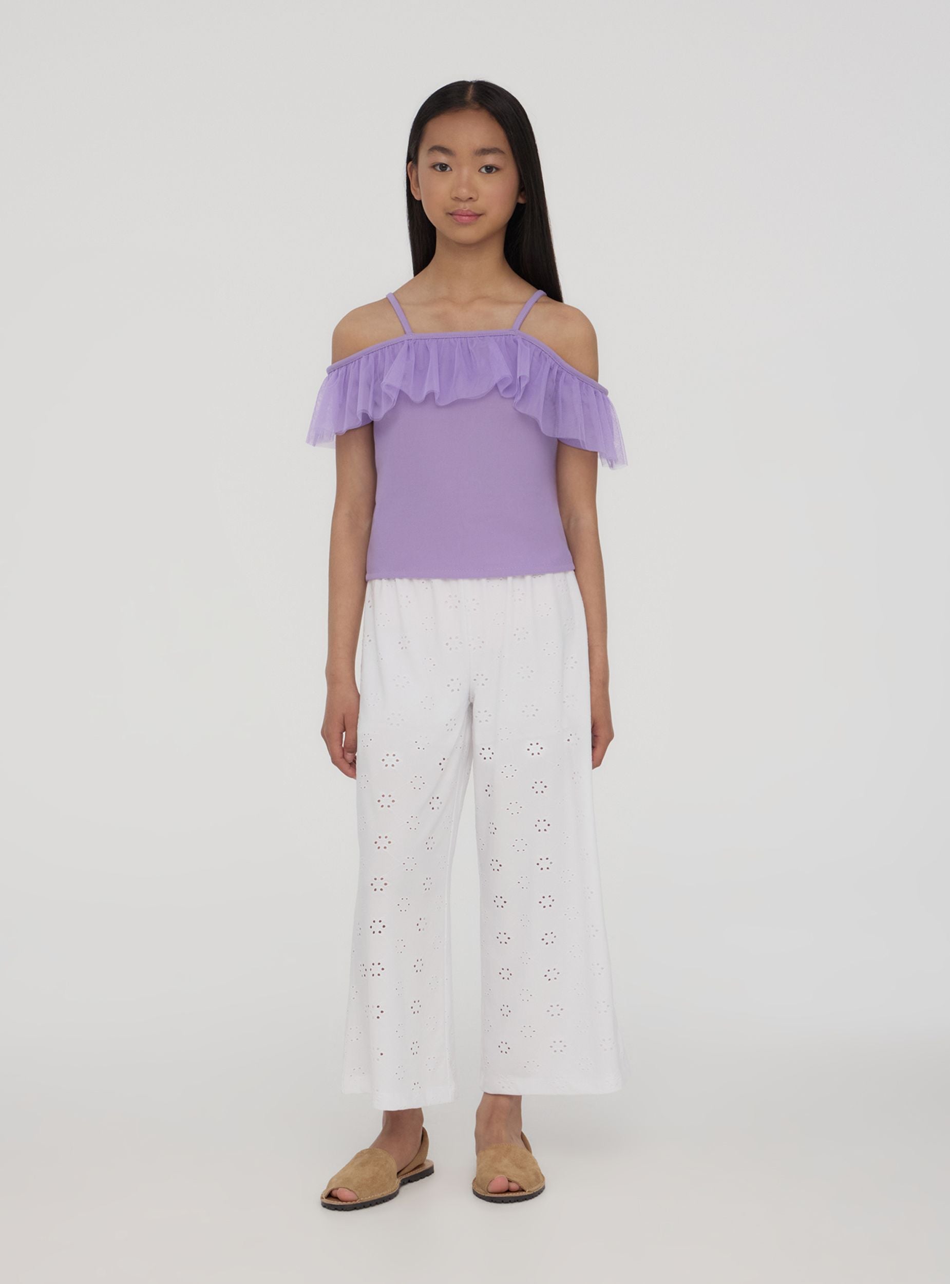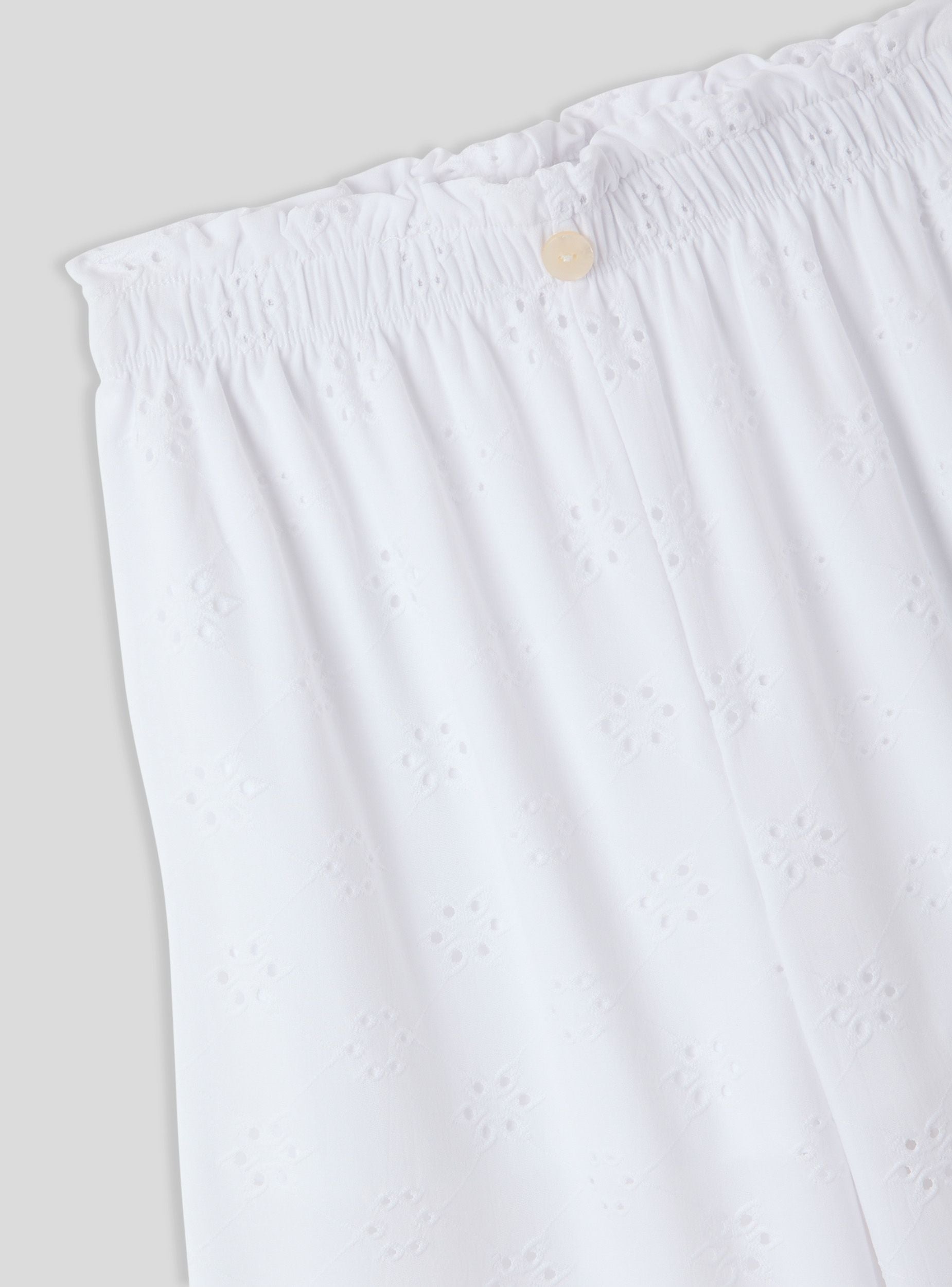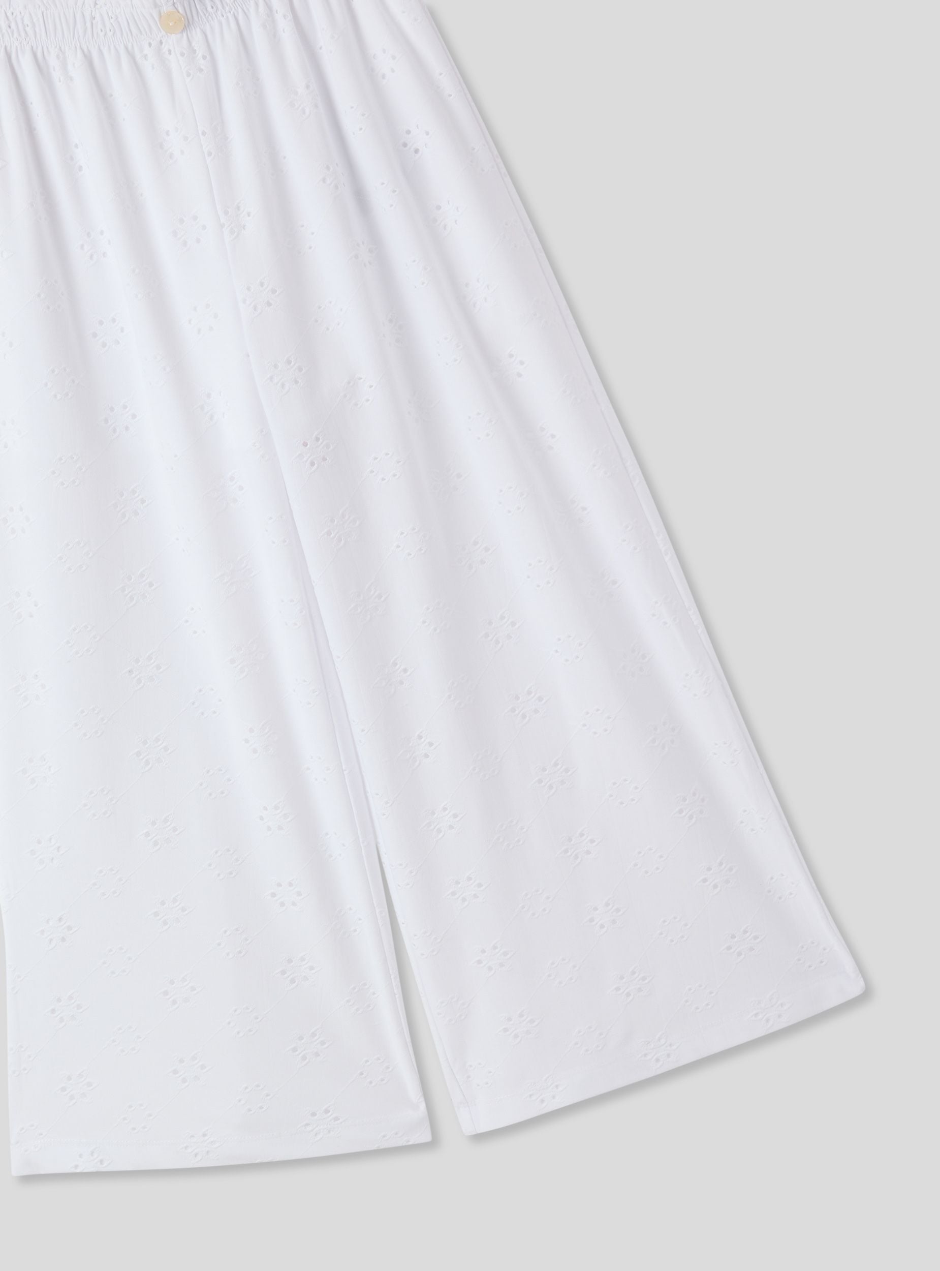 Pantalons longs pour fille au design large, parfaits pour les journées d'été grâce à leur coupe légère et confortable. Le motif broderie anglaise apporte une touche raffinée et délicate, idéale pour créer des looks romantiques et frais. Parfaits avec un blouse et des sandales pour une occasion spéciale ou avec un t-shirt et des baskets pour une tenue quotidienne au charme intemporel.Détails