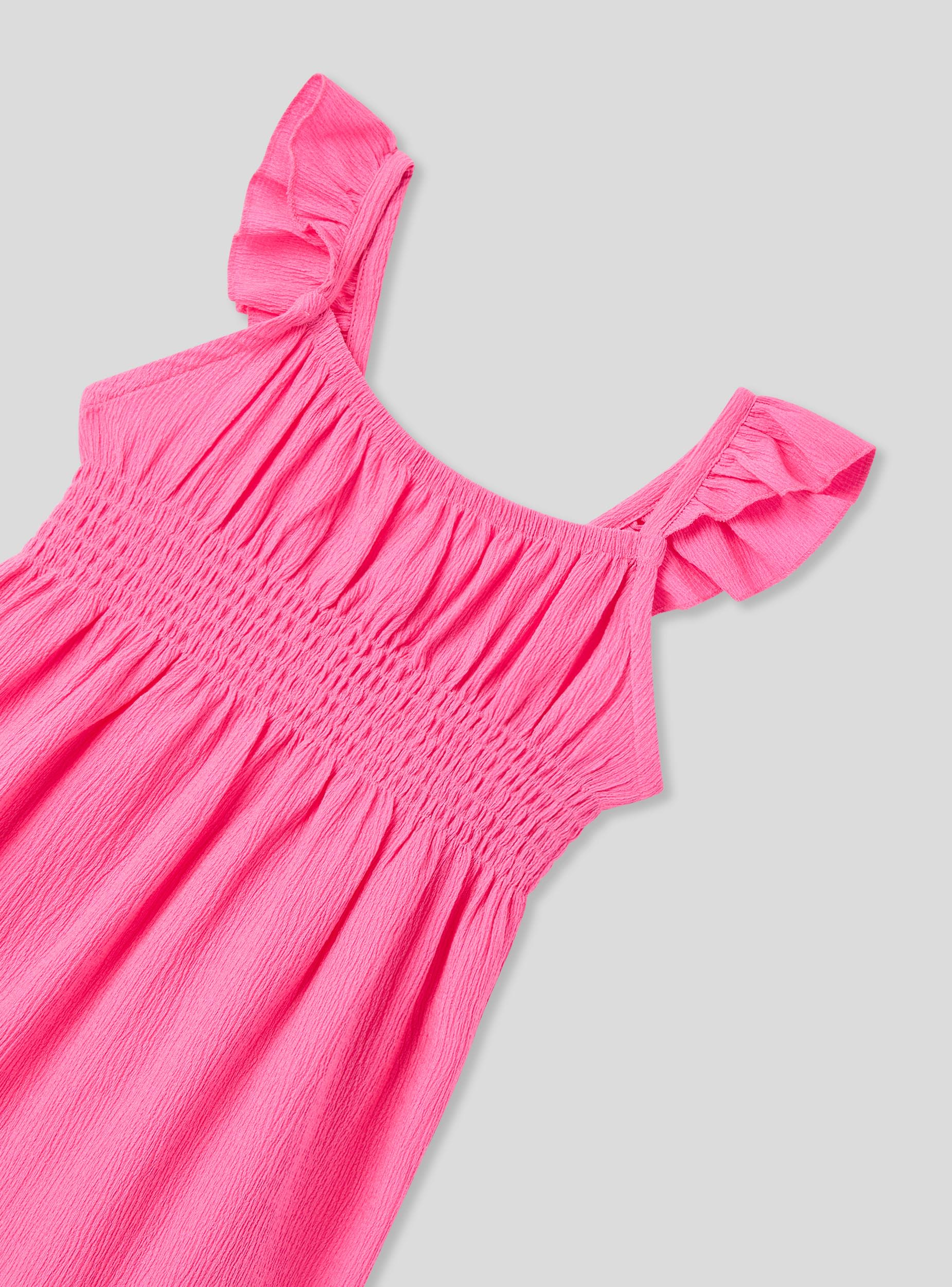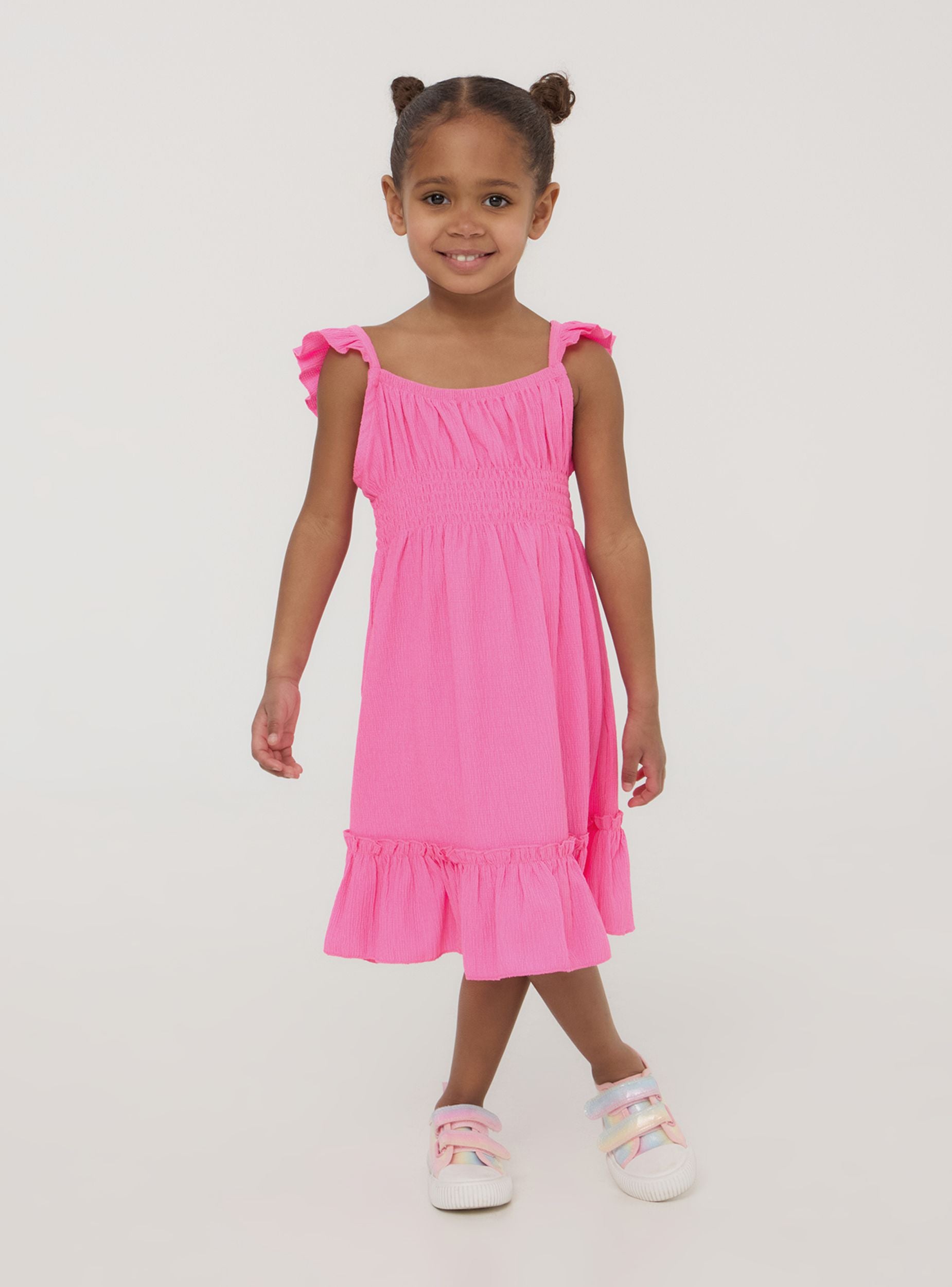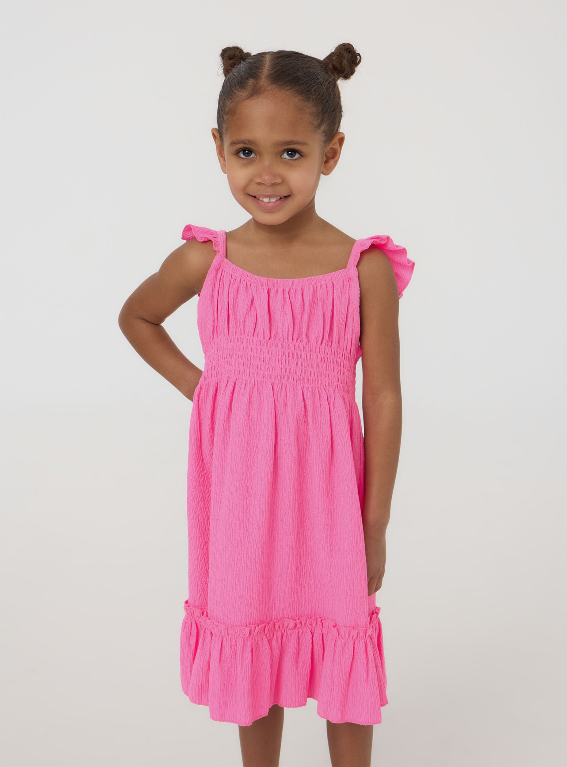 Robe pour fille parfaite pour la belle saison, avec une couleur unie vive et des détails soignés. Les délicates fronces et le smock à la taille donnent à la pièce un look élégant et confortable. Idéale pour chaque occasion, cette robe allie style et praticité, accompagnant les petites filles dans leurs aventures estivales avec une touche d'élégance.