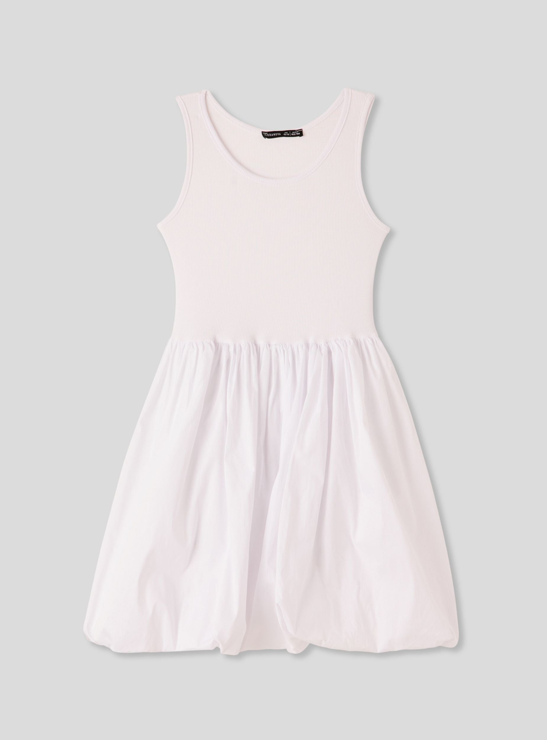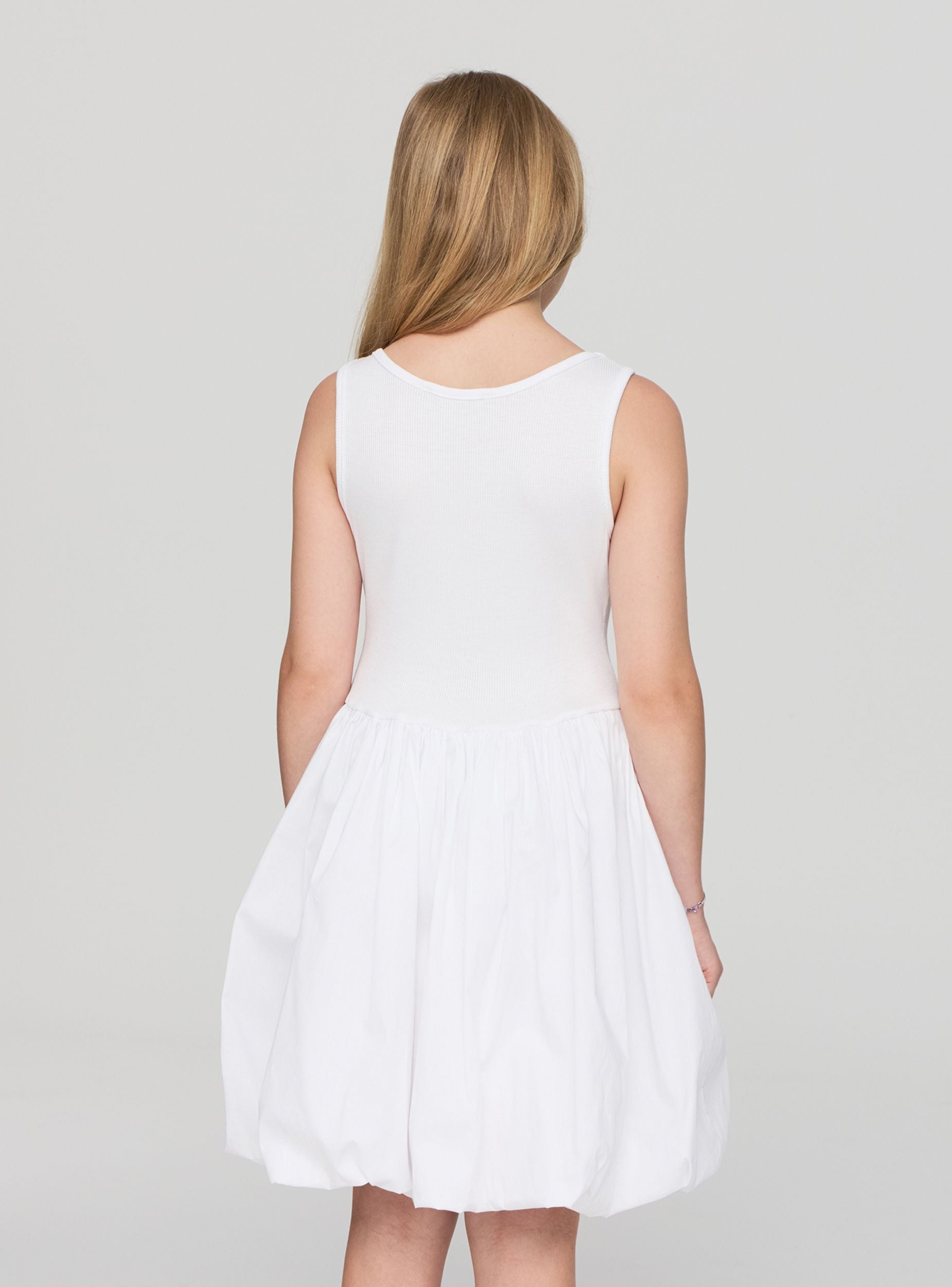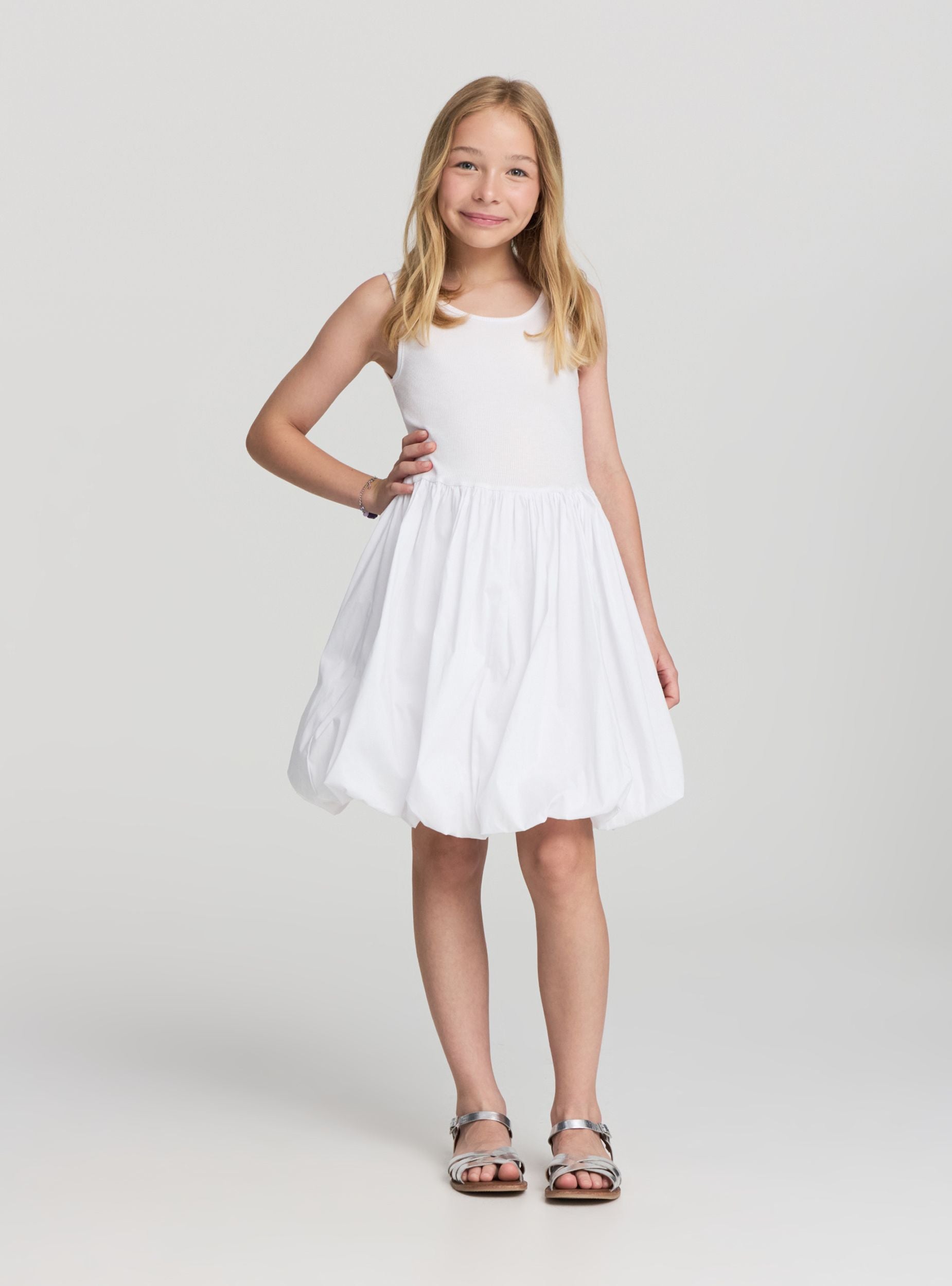Robe pour fille avec silhouette ballon, idéale pour des looks décontractés et polyvalents. Le modèle présente une partie supérieure en tissu côtelé avec un col rond et des bretelles larges, tandis que la jupe ample crée un effet volumineux et moderne. Parfaite pour les journées d'été, elle s'associe facilement à des sandales ou des baskets pour une tenue pratique et à la mode. Design uni, sans manches.Détails