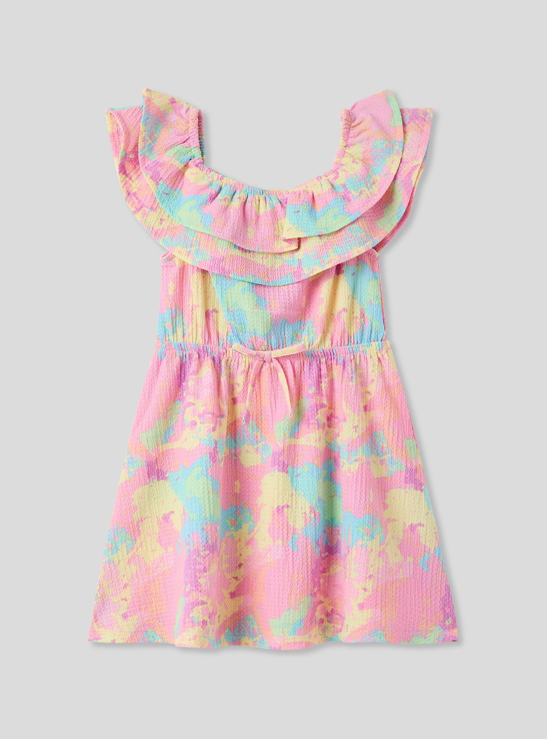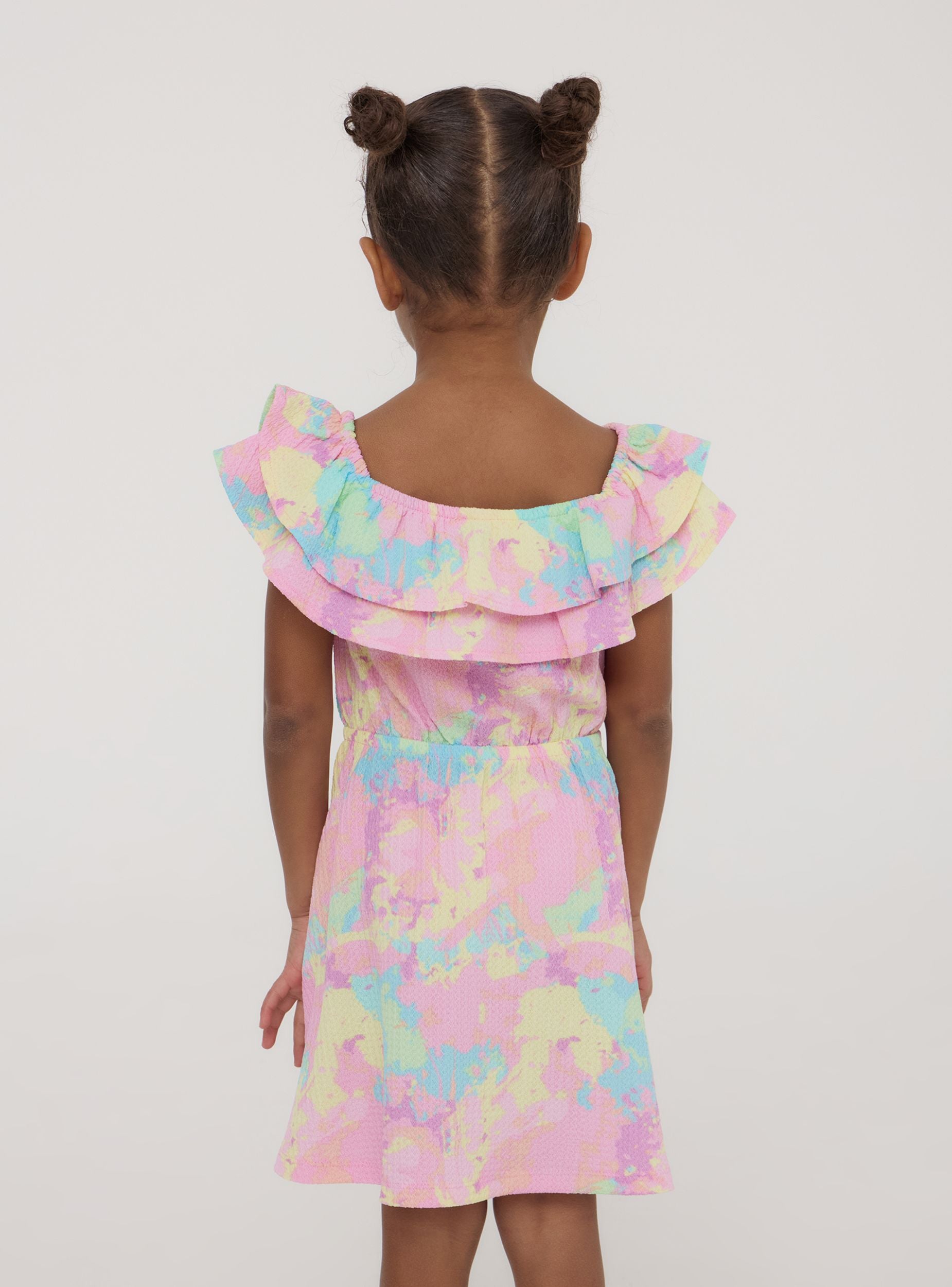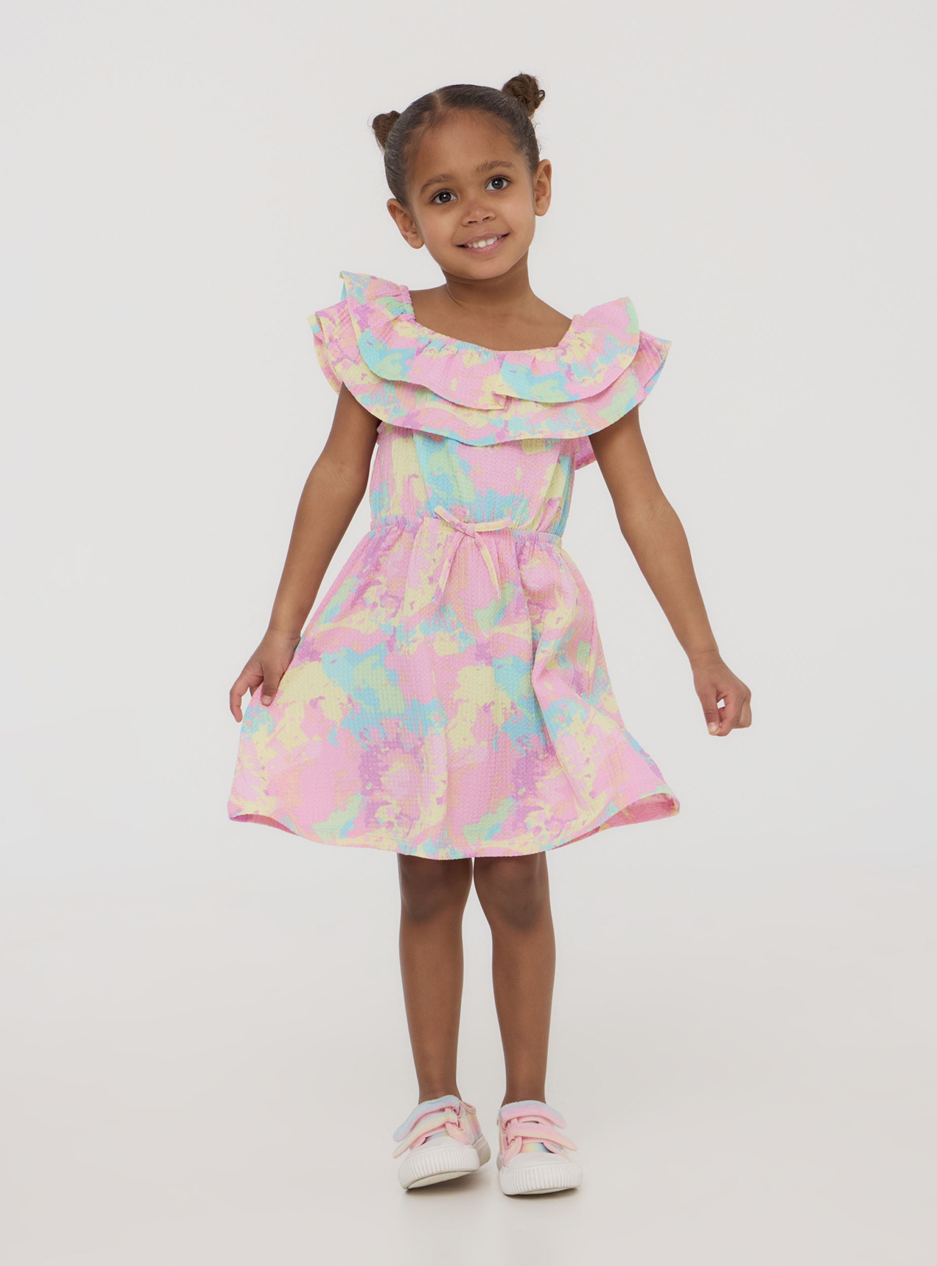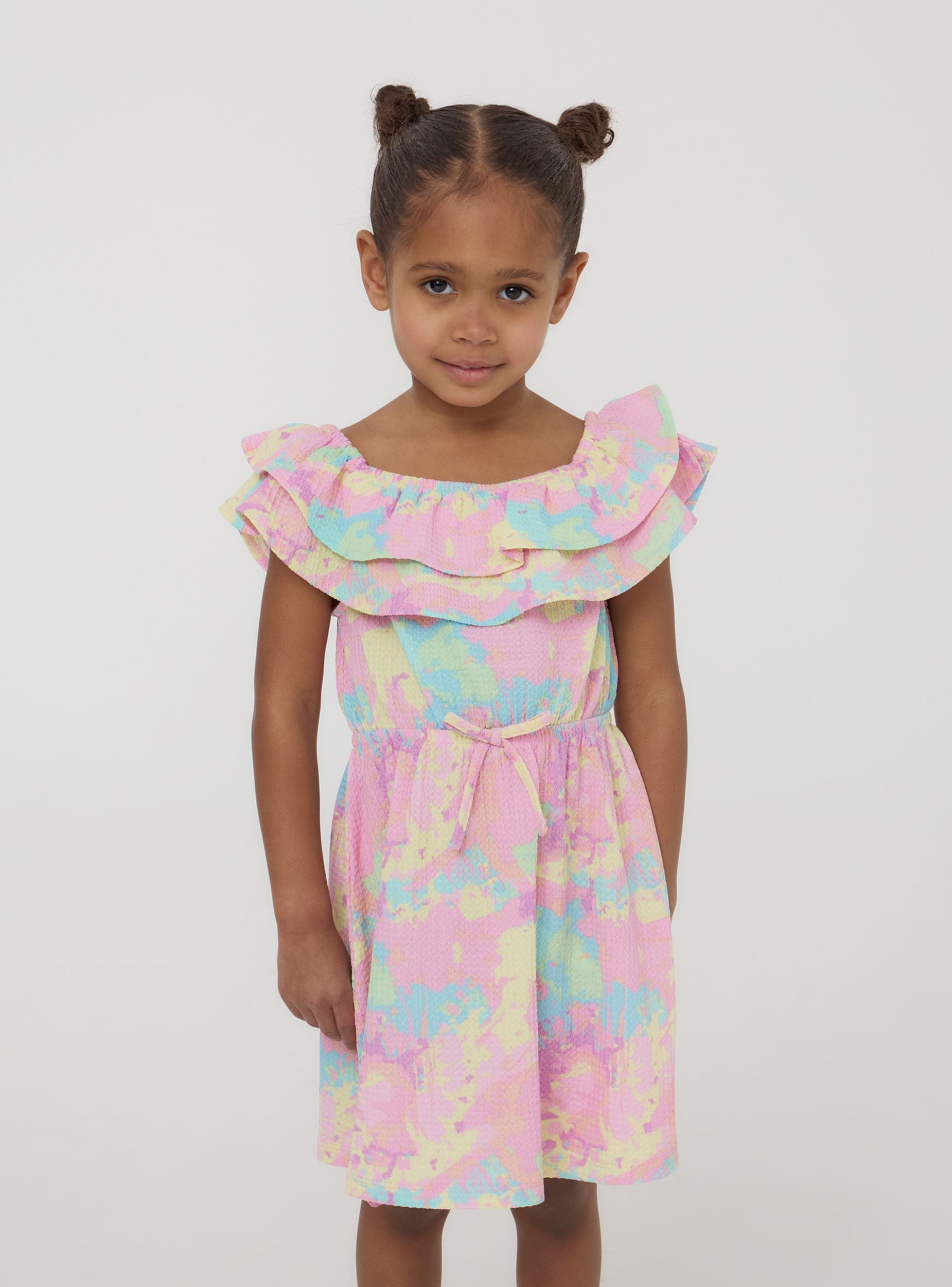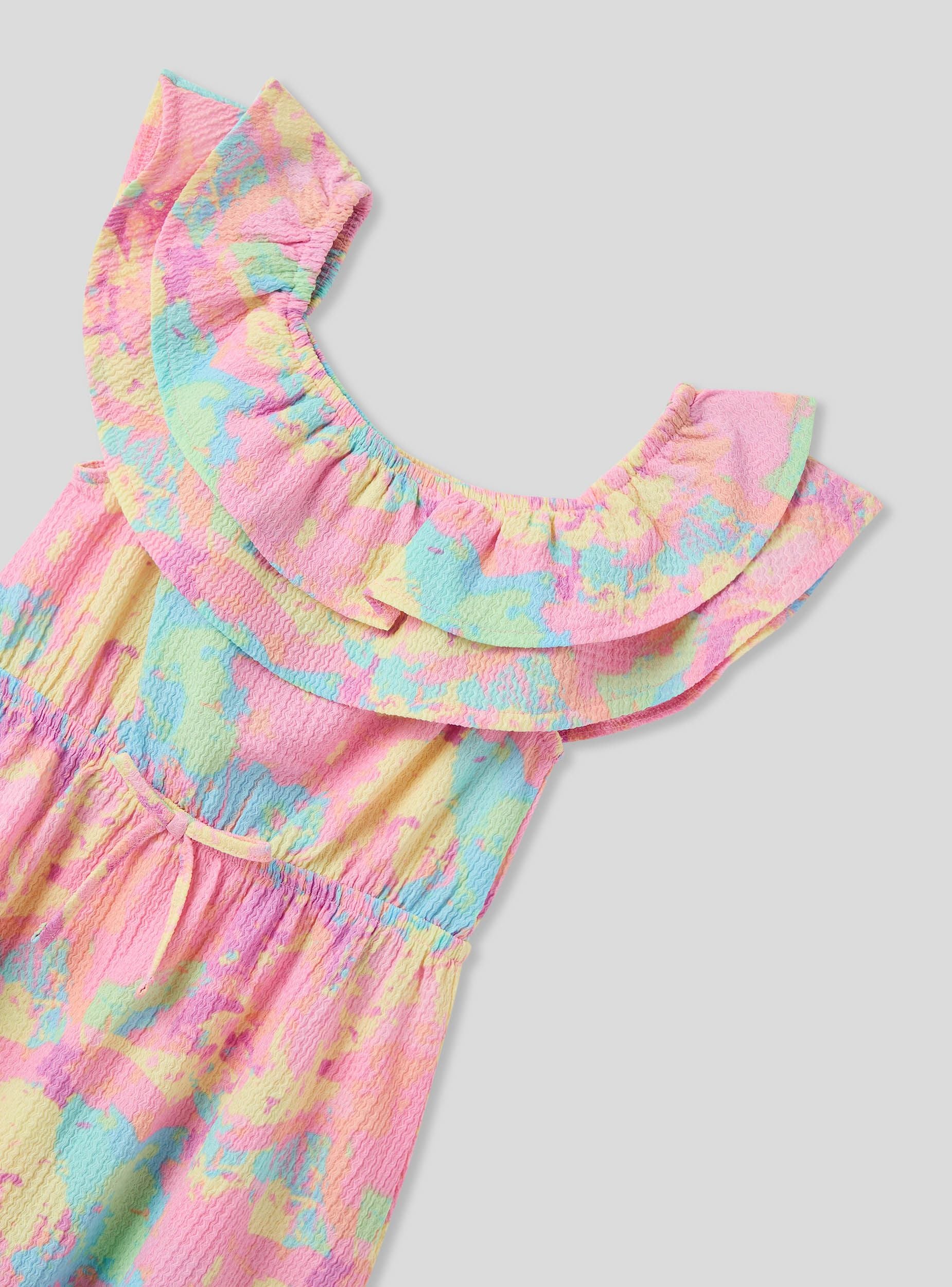 Robe pour fille caractérisée par un motif dégradé qui évoque un jeu de couleurs délicates et harmonieuses. Les volants au col apportent une touche d'élégance ludique, tandis que le design doux et fluide garantit confort et liberté de mouvement. Idéale pour ajouter une touche de gaieté et de légèreté à la garde-robe estivale des petites.