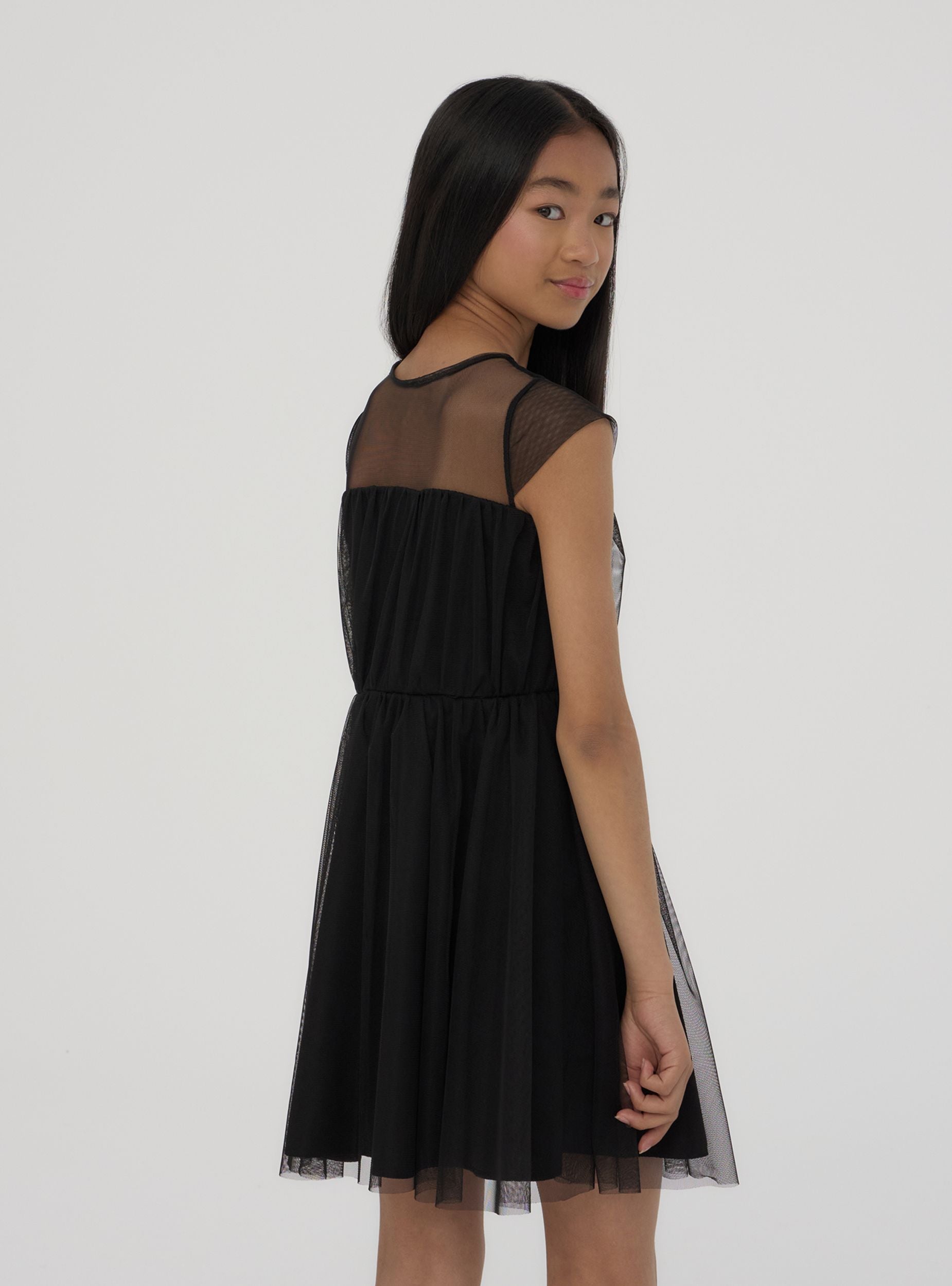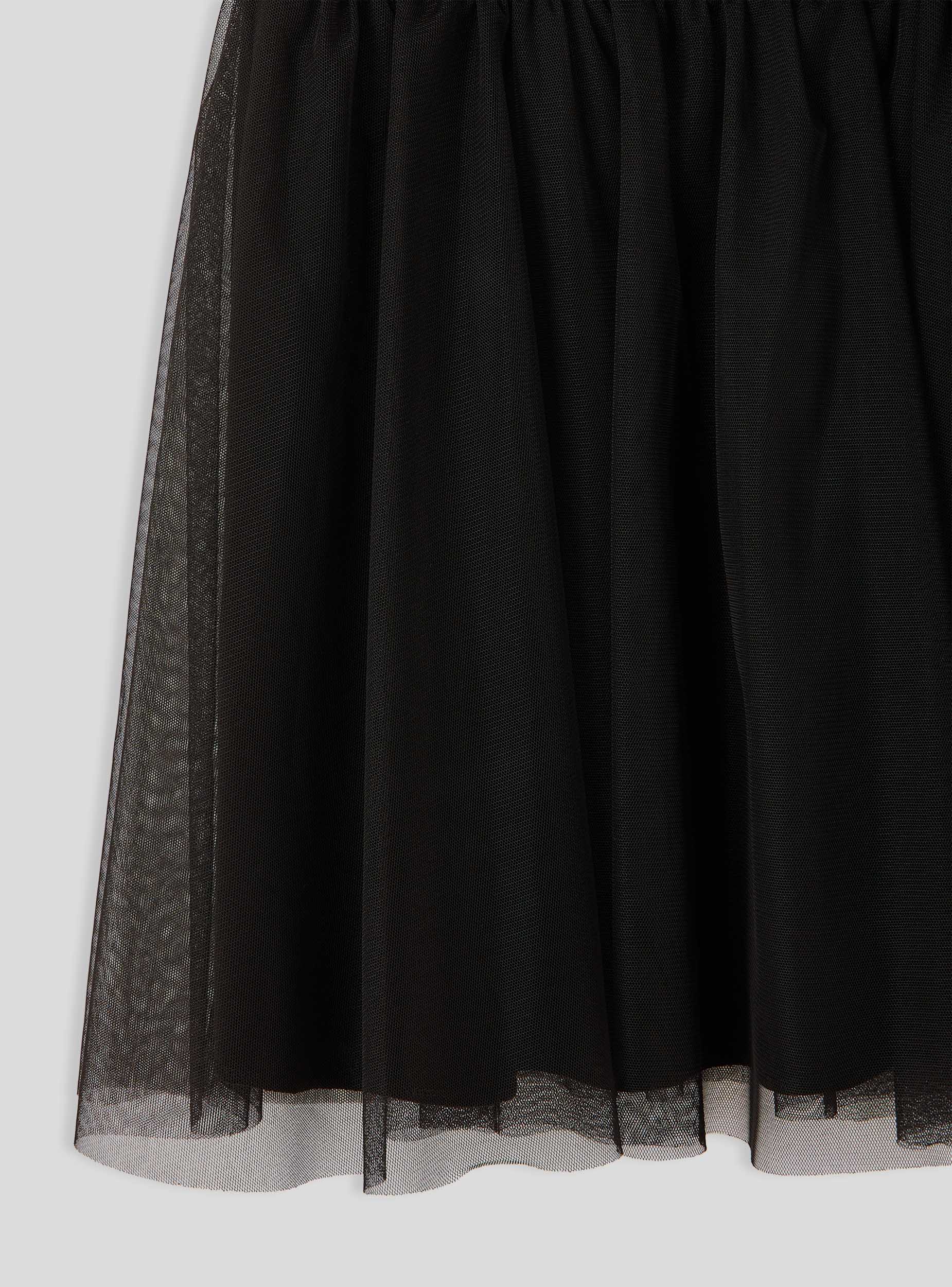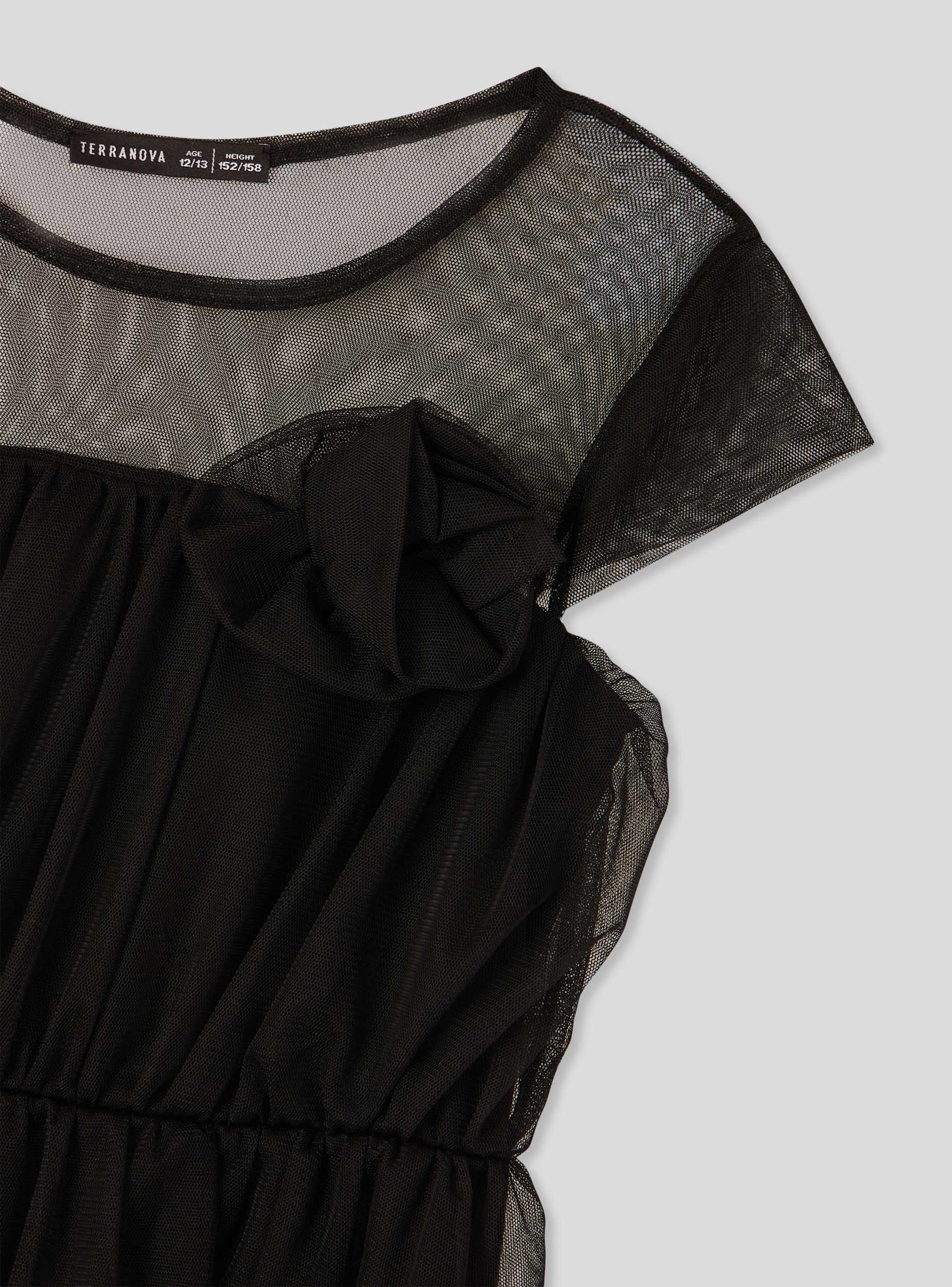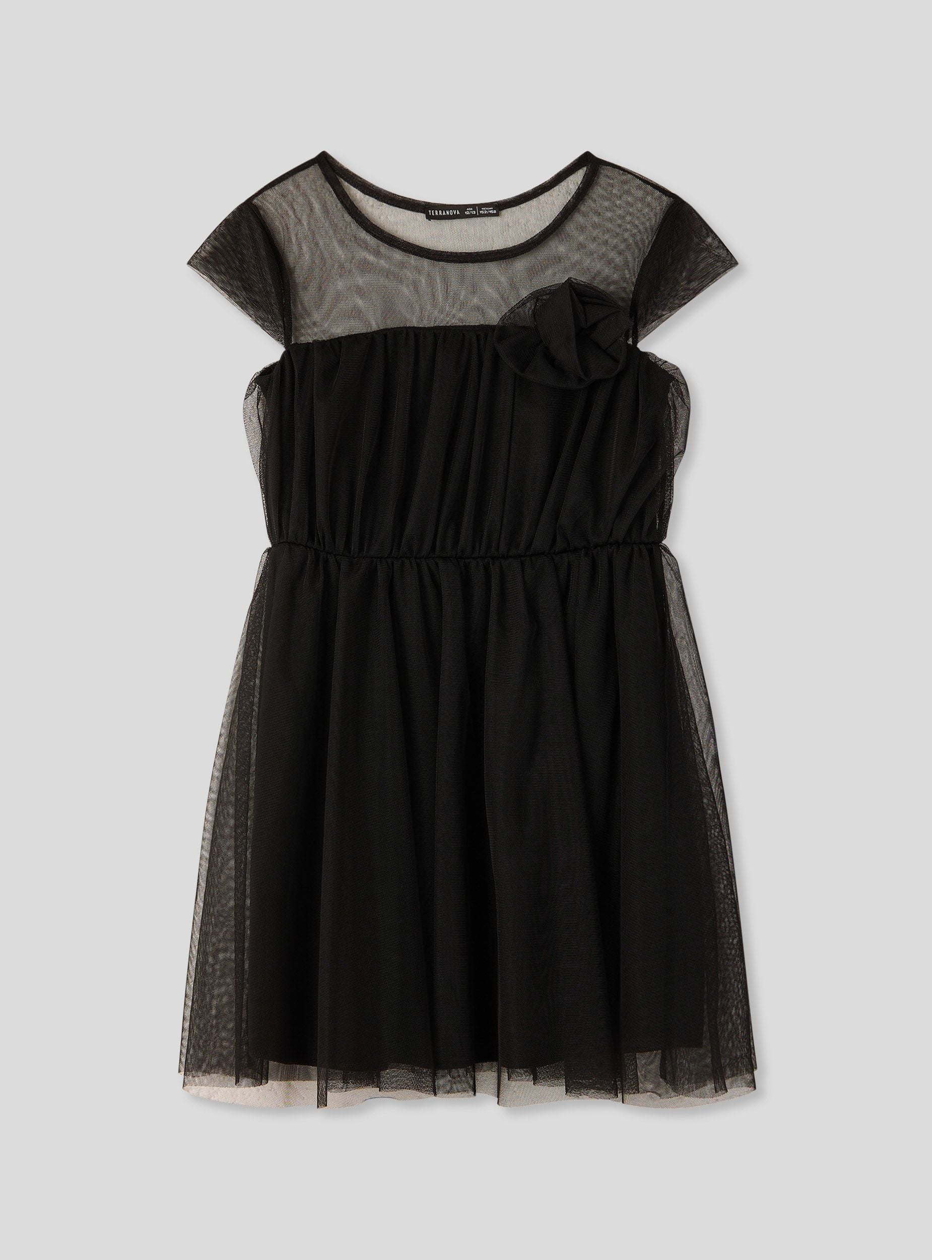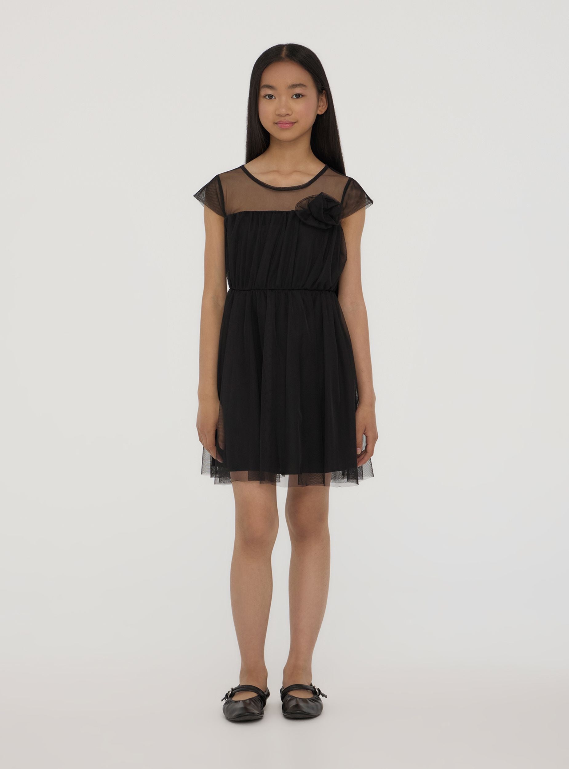 Robe pour fille idéale pour les cérémonies et les occasions spéciales, caractérisée par un design élégant avec une double couche en tulle et une application florale sur le buste. La coupe régulière et la jupe en tulle apportent mouvement et légèreté. Col rond, manches courtes et couleur unie en font un vêtement parfait à associer avec des ballerines ou des sandales pour un look raffiné.Détails