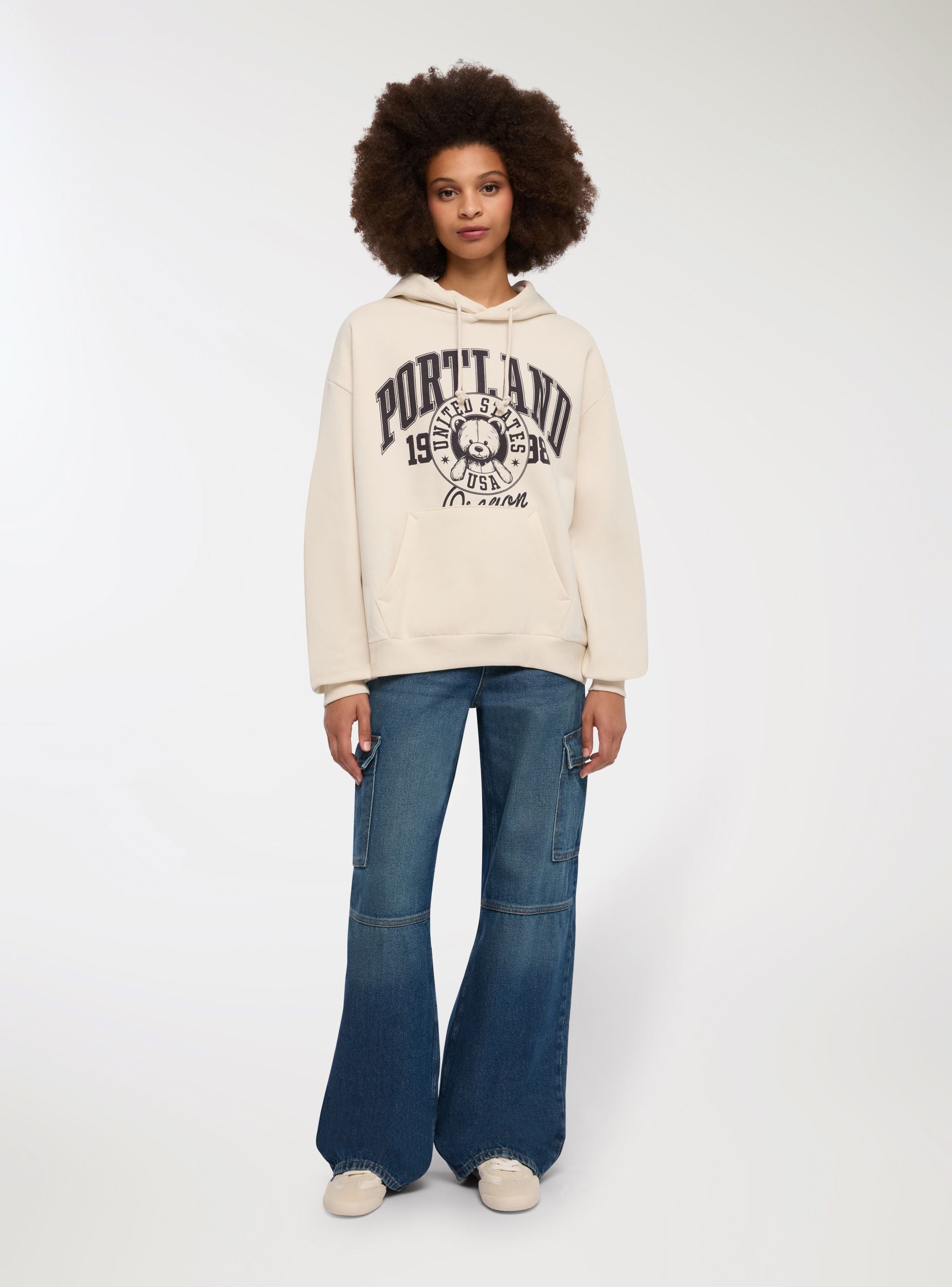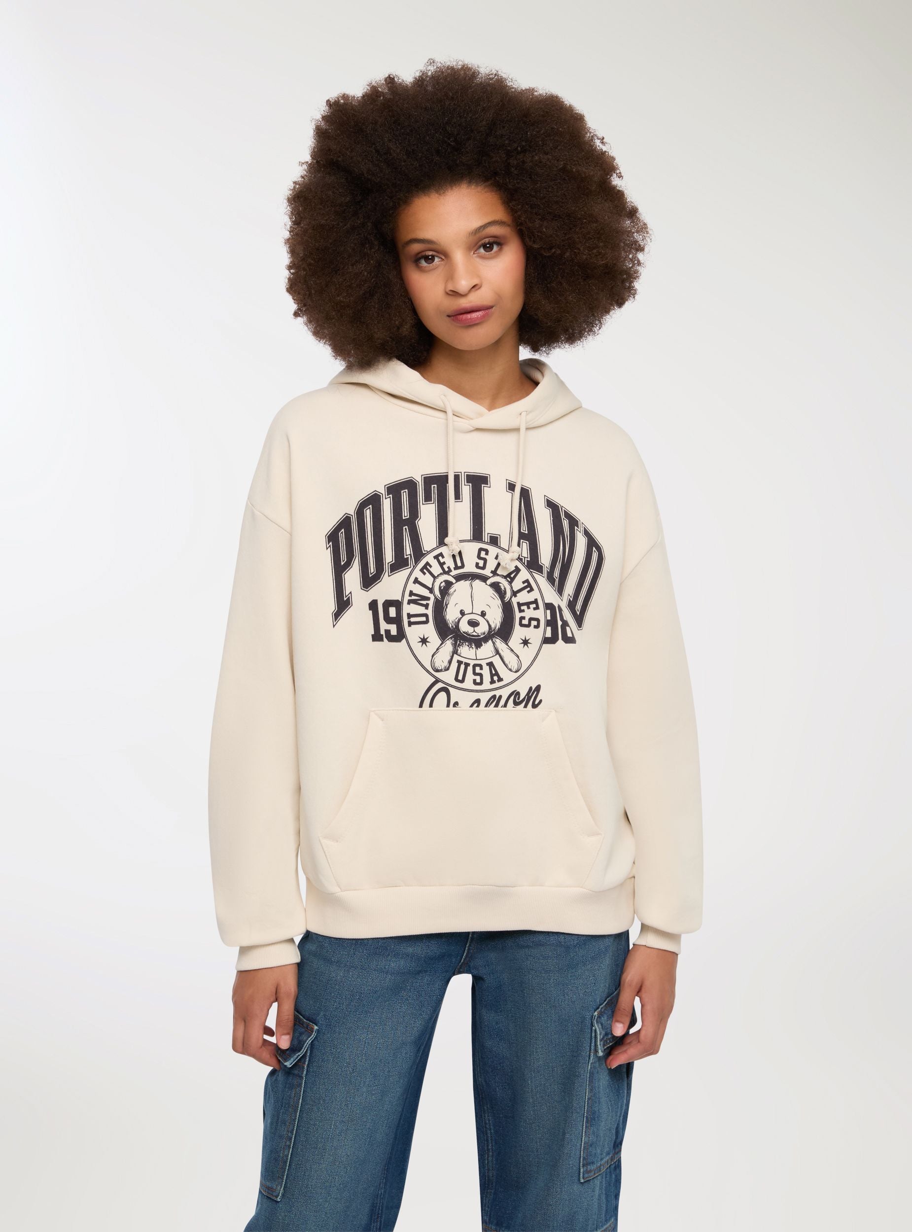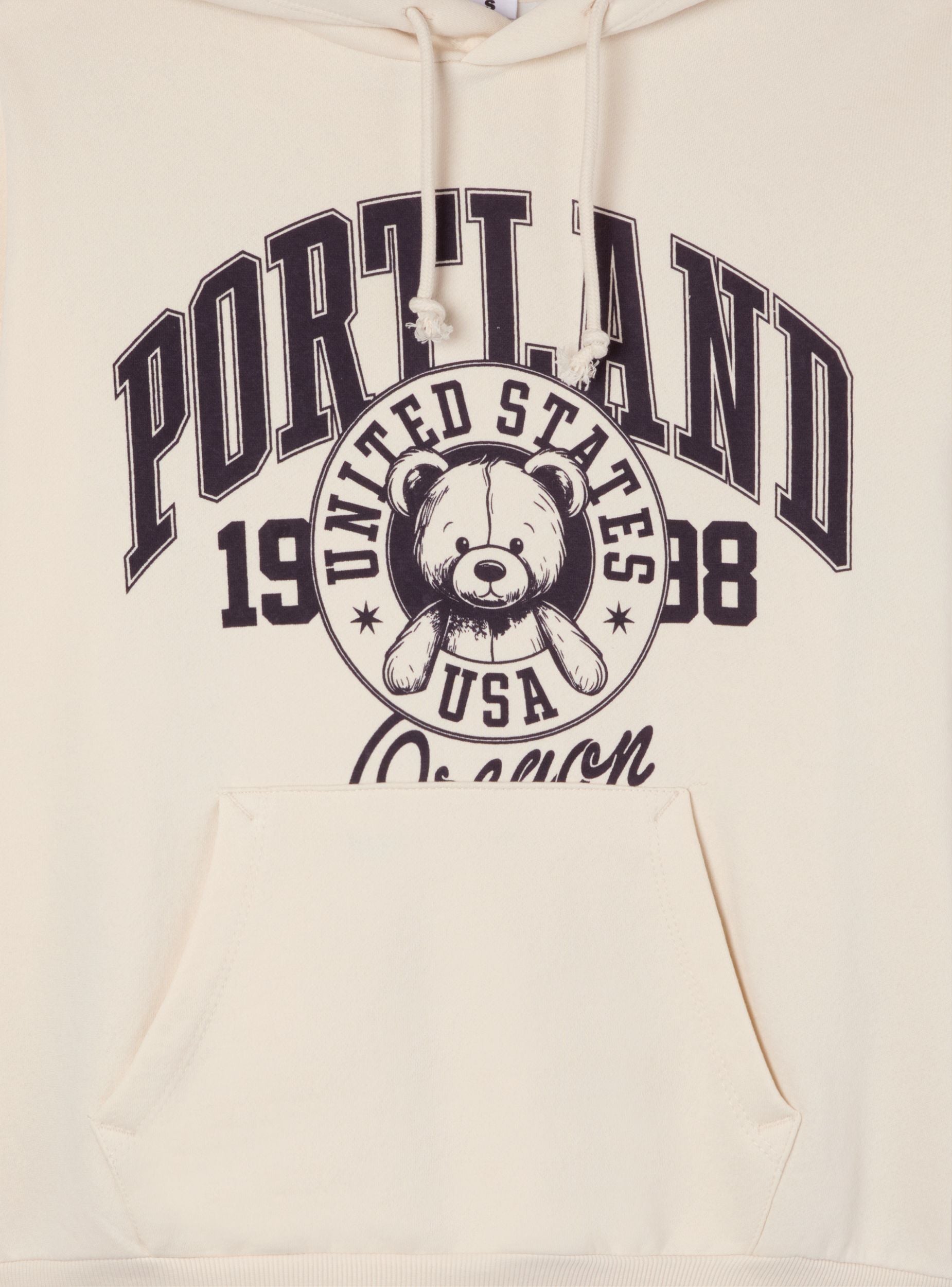 Sweat à capuche femme lourd parfait pour l'hiver, avec cordon de serrage réglable pour un confort sur mesure. Le modèle sans zip est enrichi d'une poche kangourou frontale, idéale pour réchauffer les mains. La maxi impression "Portland Oregon" avec des écritures de style universitaire et un adorable ours central apporte une touche originale et accrocheuse. Idéal pour un look décontracté, urbain ou sportif, à porter tous les jours.Détails