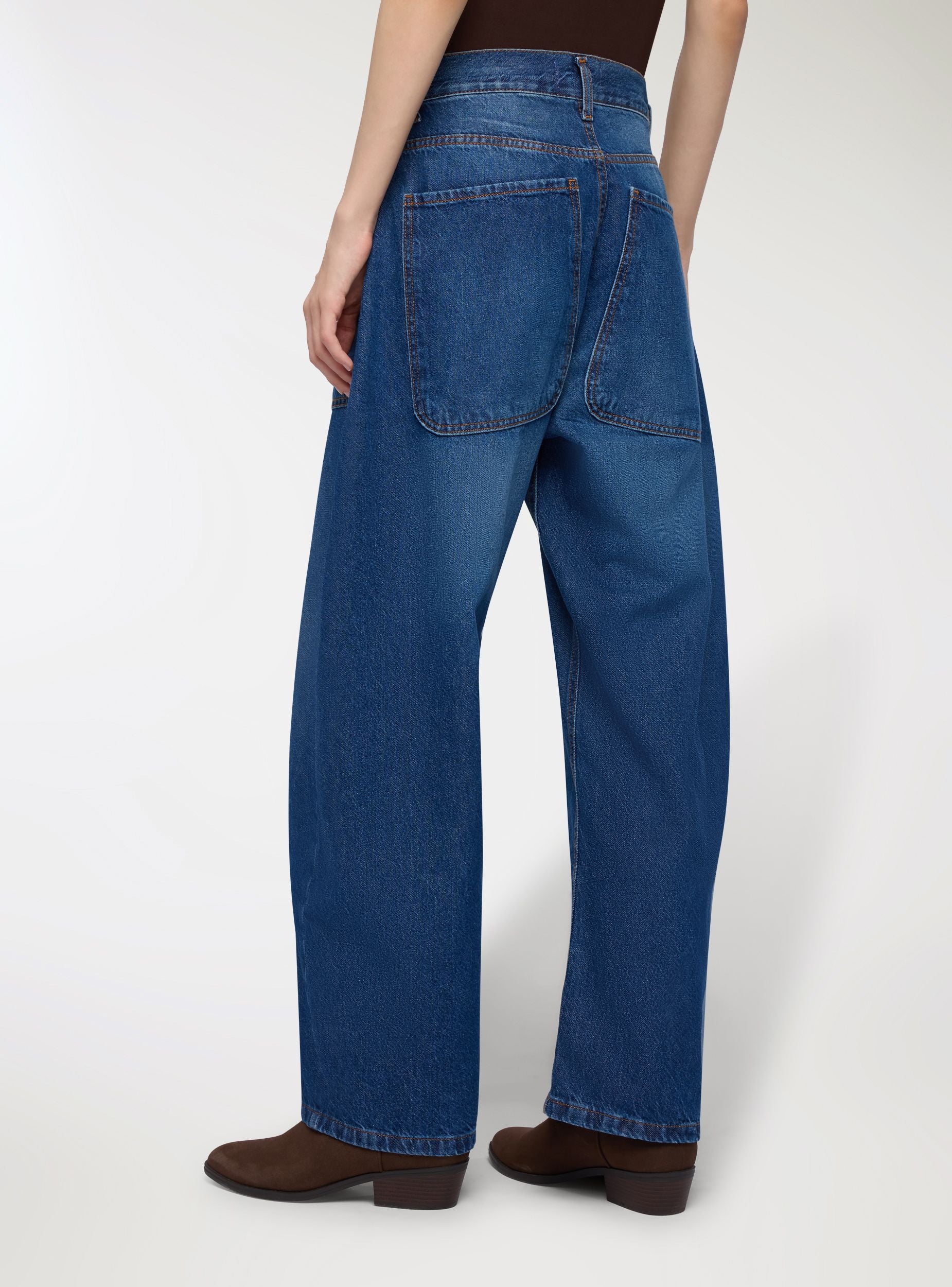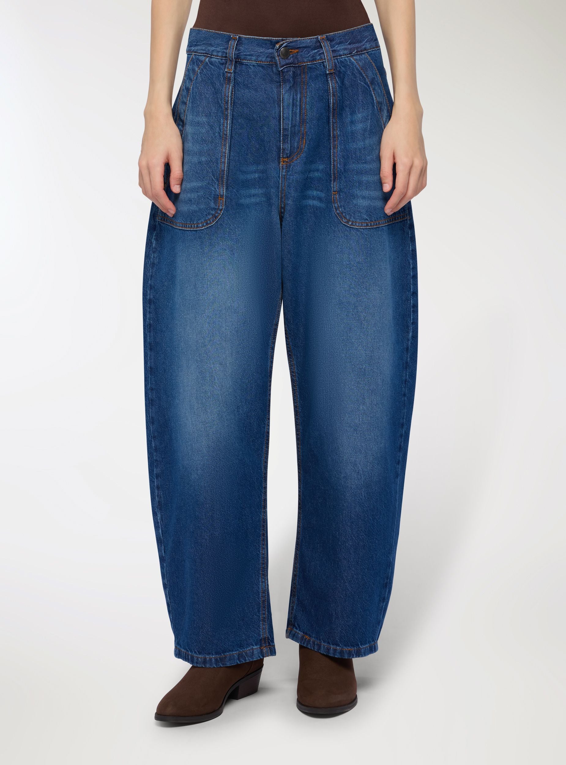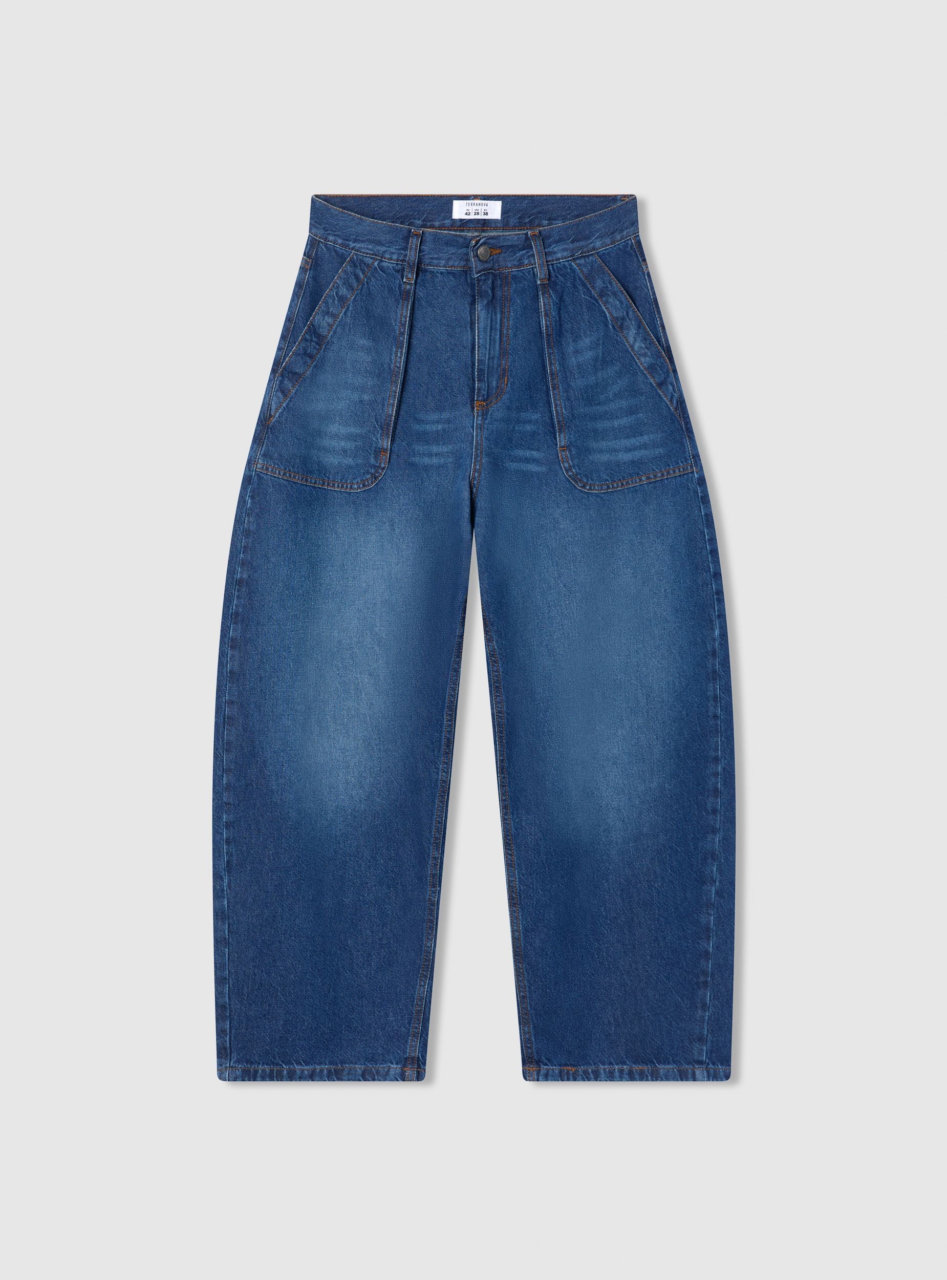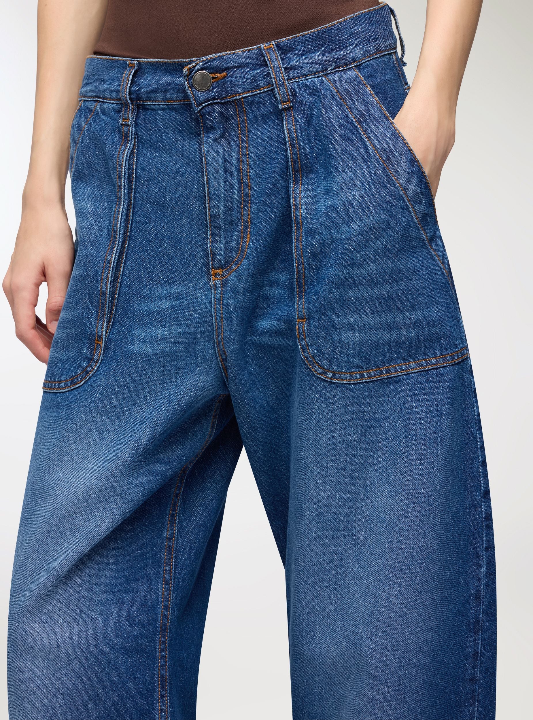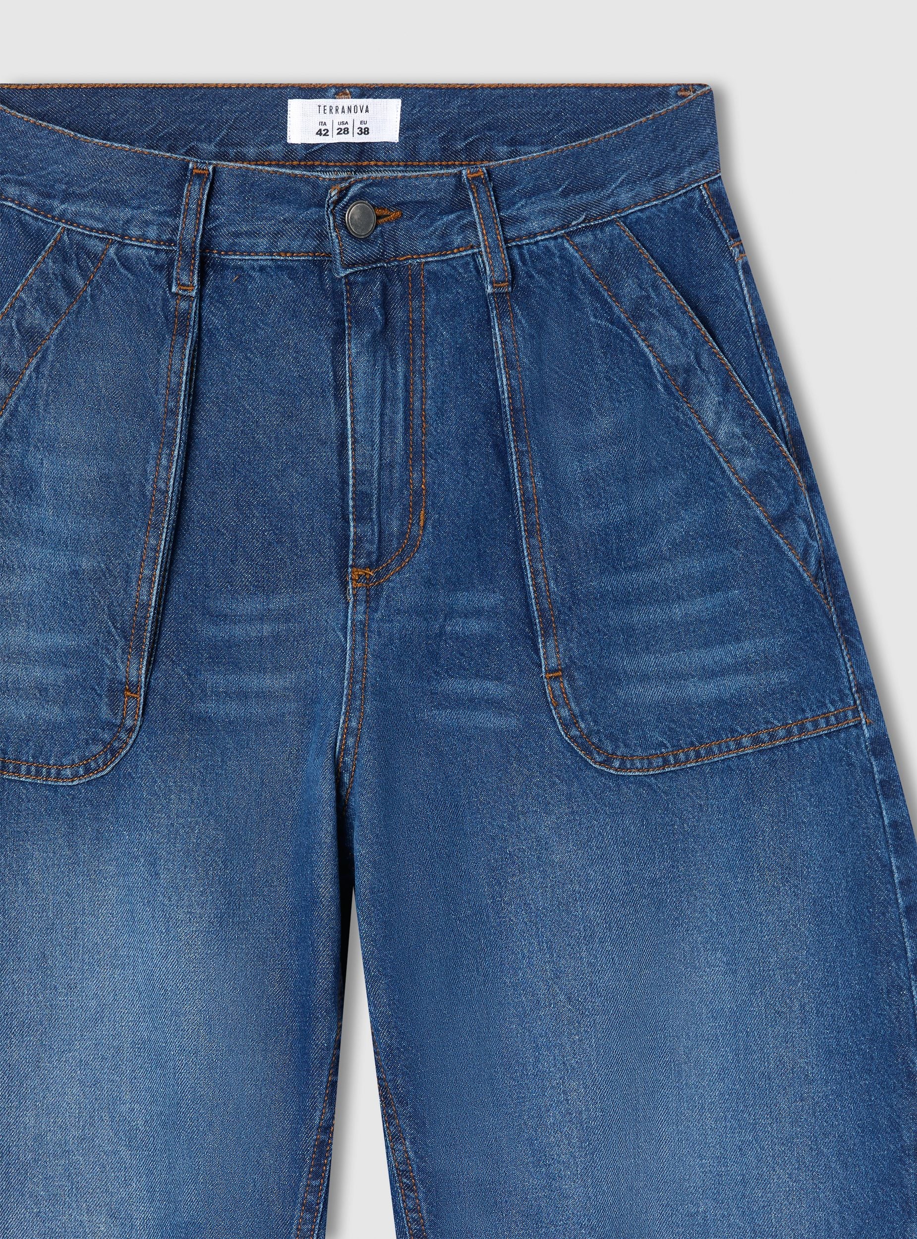 Ženske traperice jednobojne s širokim nogavicama i srednjim strukom. Dugi model s kopčanjem na gumb i patentni zatvarač, prorezi za remen u struku i velikim prednjim džepovima u radničkom stilu. Srednje pranje s blagim nijansama koje ističu dizajn. Idealne za ležeran i urbani izgled, kombinirajte ih s majicama i tenisicama za dan ili s gležnjačama i košuljom za uređeniji outfit.Detalji