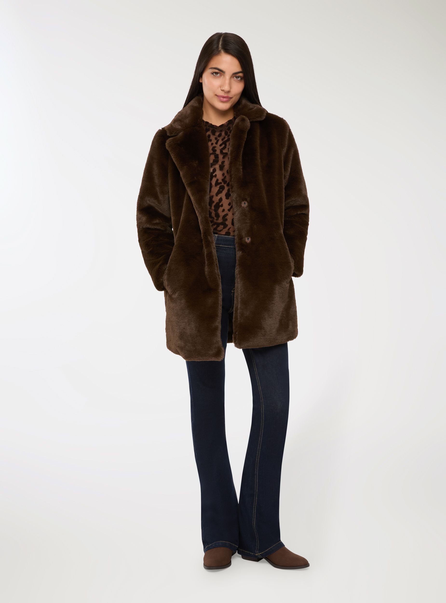 Ženski kaput s reverom, idealan za dodavanje sofisticiranog dodira zimskim izgledima. Srednja dužina i ravni kroj naglašavaju siluetu, dok završna obrada s efektom krzna daje elegantan izgled. Opremljen praktičnim gumbima na pritisak i bočnim džepovima, savršeno se kombinira s palazzo hlačama ili midi haljinama, idealan za formalne prilike ili večeri u gradu.