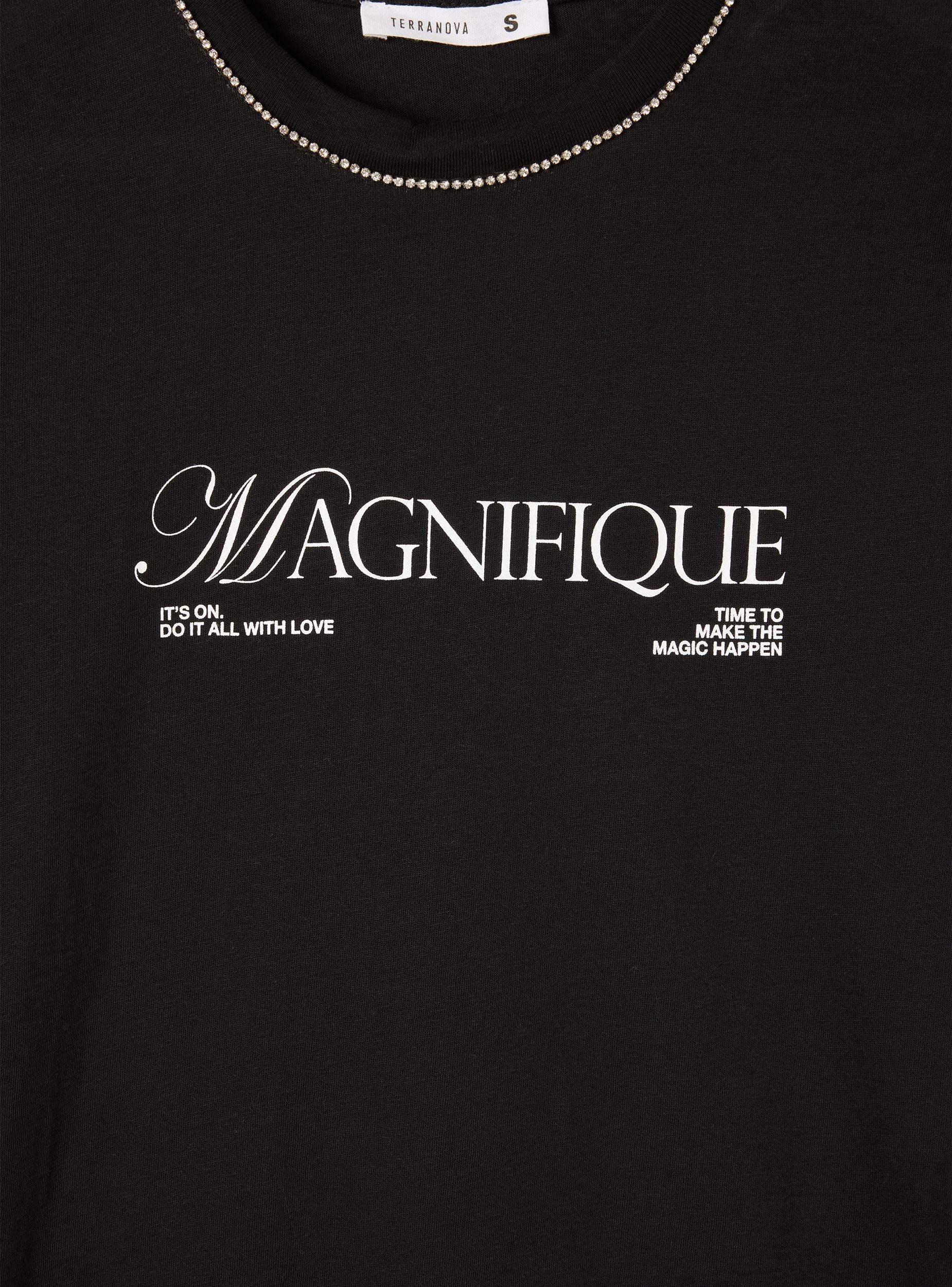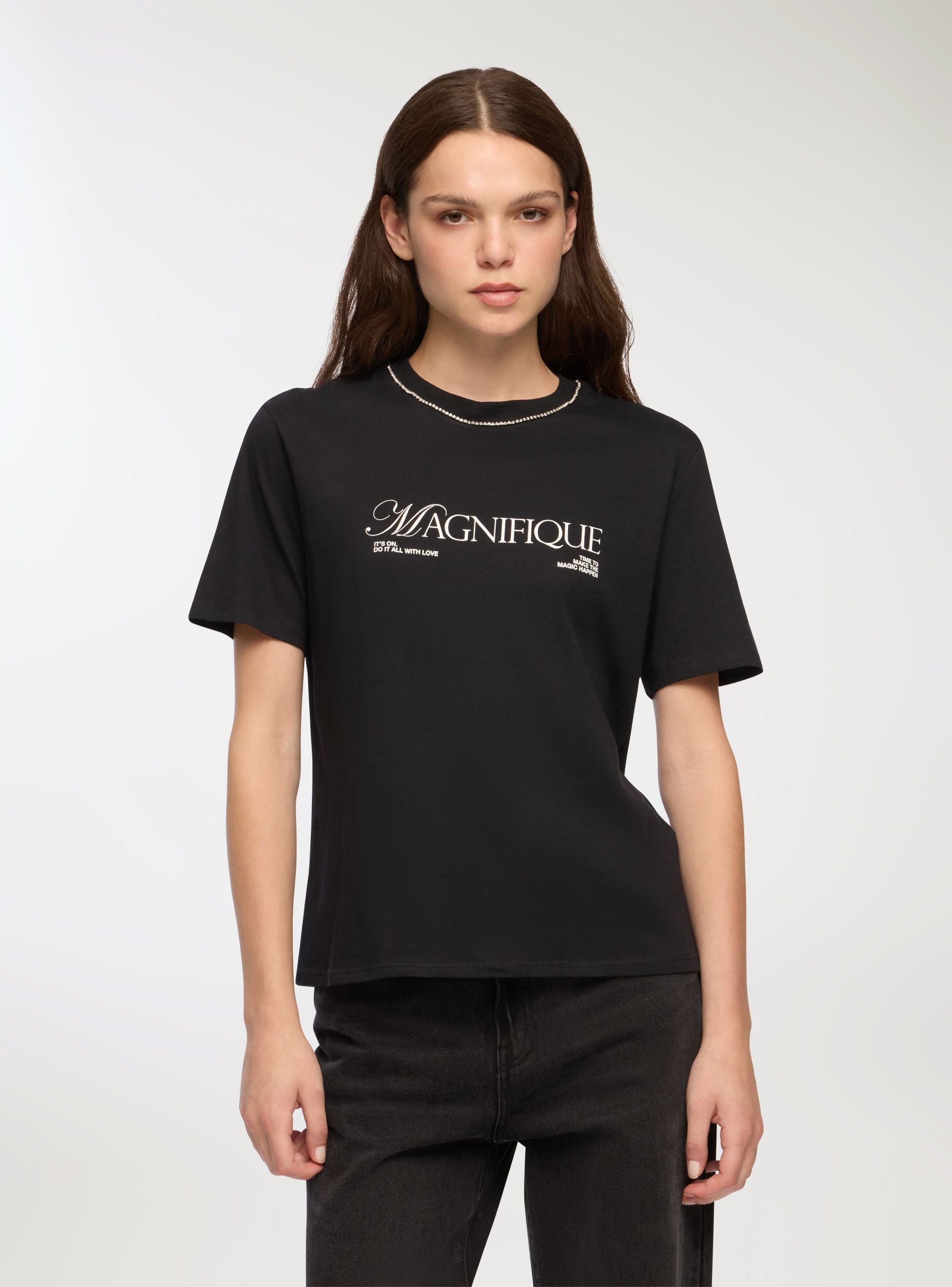Ženska majica ležernog stila, karakterizirana širokim i udobnim krojem. Model ima kratke rukave i okrugli izrez ukrašen redom aplikacija s efektom nakita koje dodaju sjajan dodir. Ispis s natpisom sprijeda čini je idealnom za svakodnevne lookove i kombinacije s trapericama ili suknjama, savršena za izražavanje osobnosti u svakoj neformalnoj prigodi.