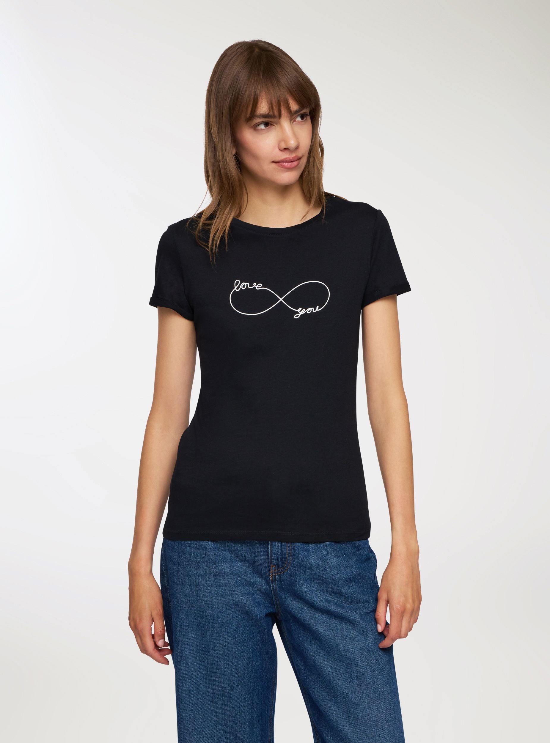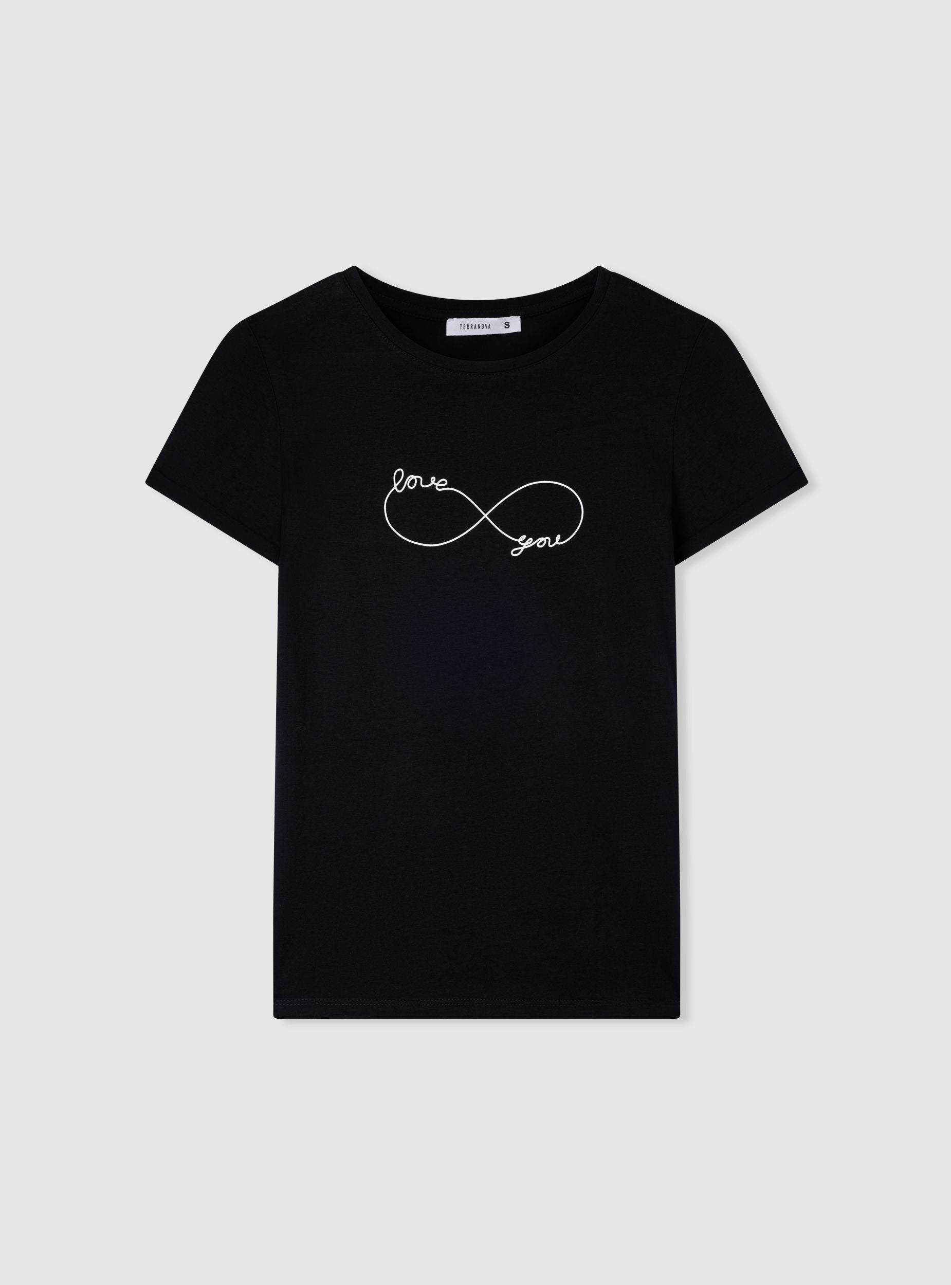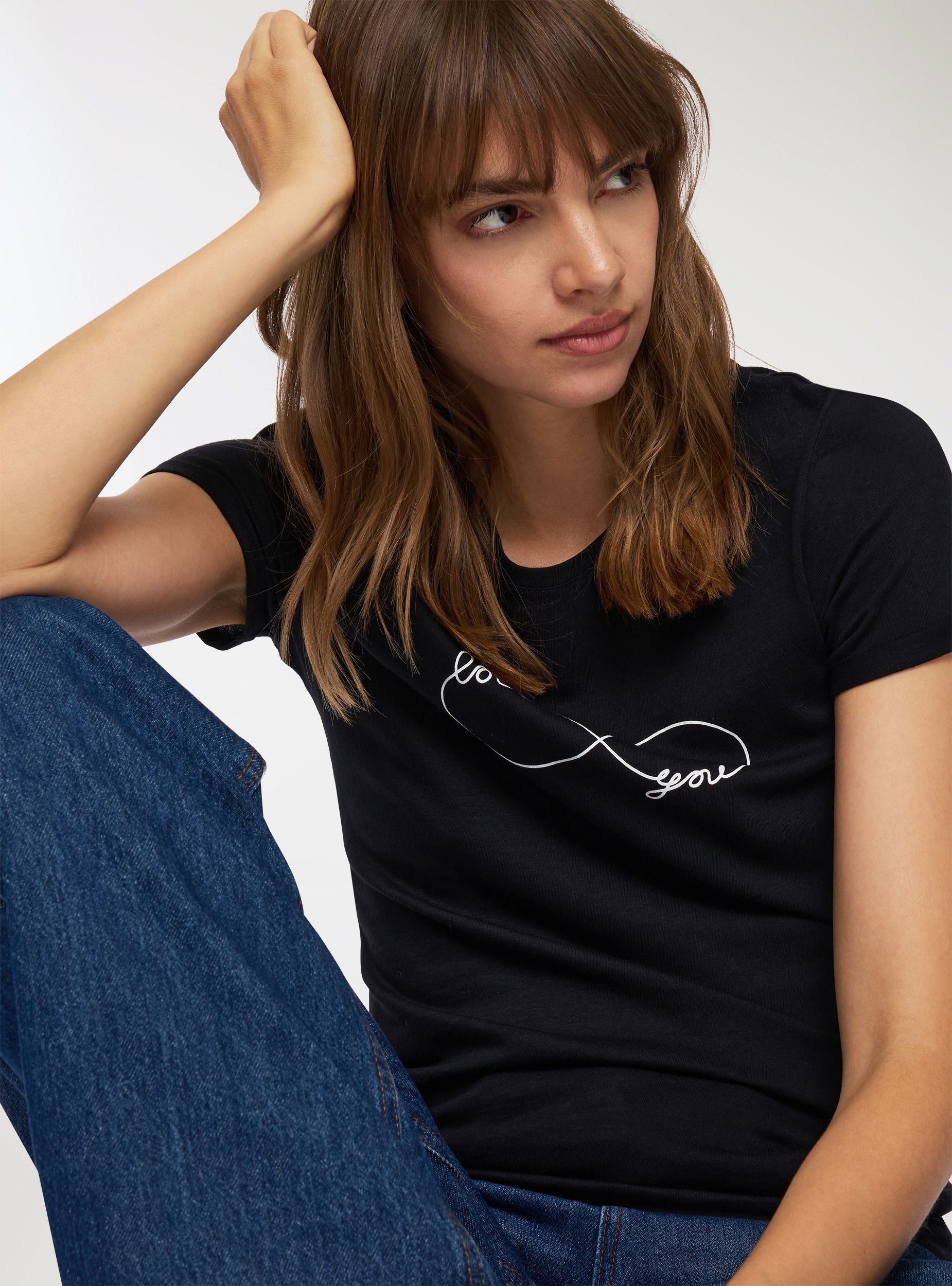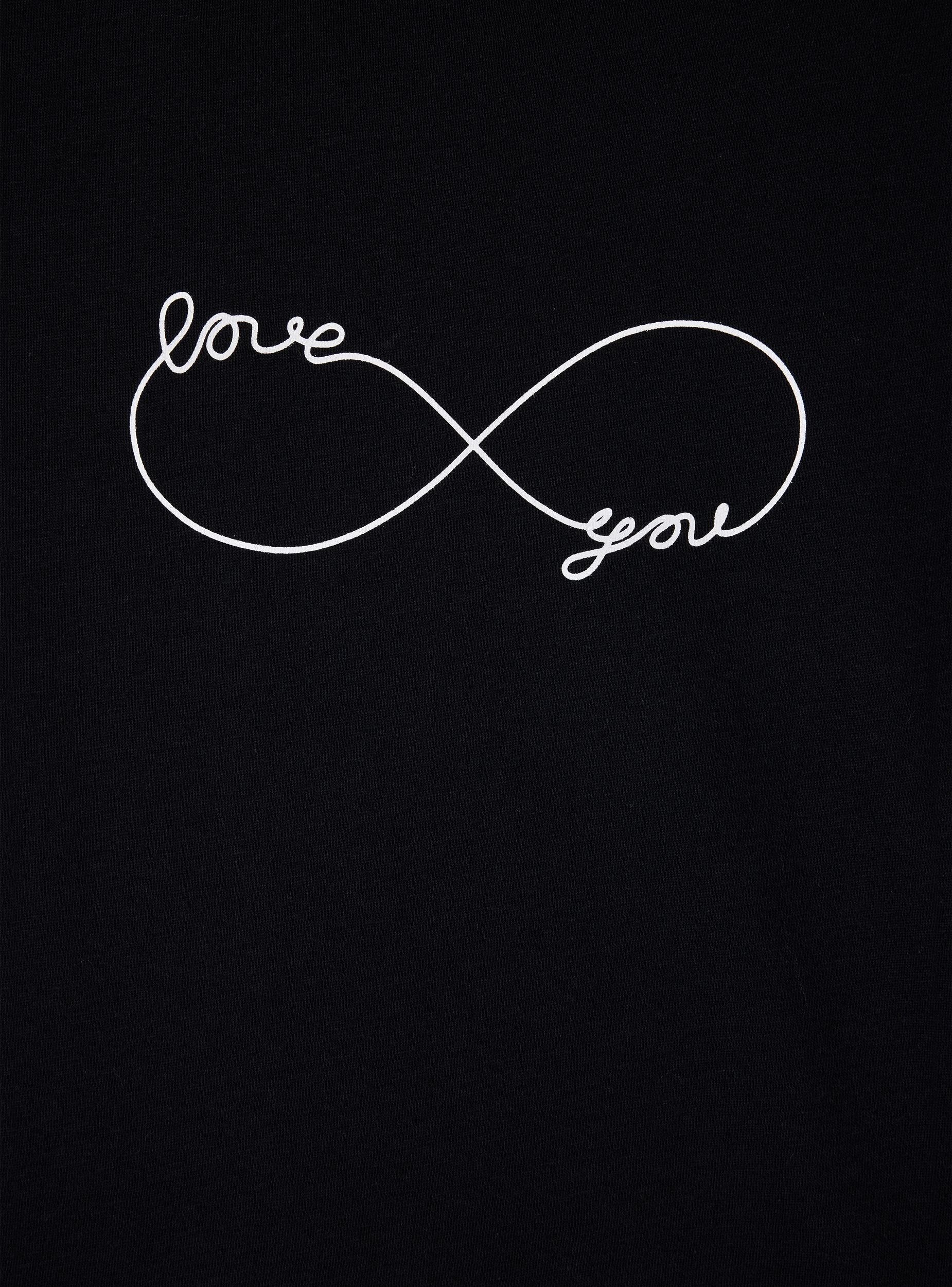 Ženska majica s beskrajnim printom i natpisom "love you", idealna za ležeran i svestran izgled. Savršena za dodavanje romantičnog dodira stilu. Ova majica nudi moderan i udoban dizajn. Uski kroj ističe siluetu, čineći je prikladnom za razne prilike, od slobodnog vremena do neformalnih izlazaka. Osnovni komad za obogaćivanje svakodnevnog garderobera.Detalji