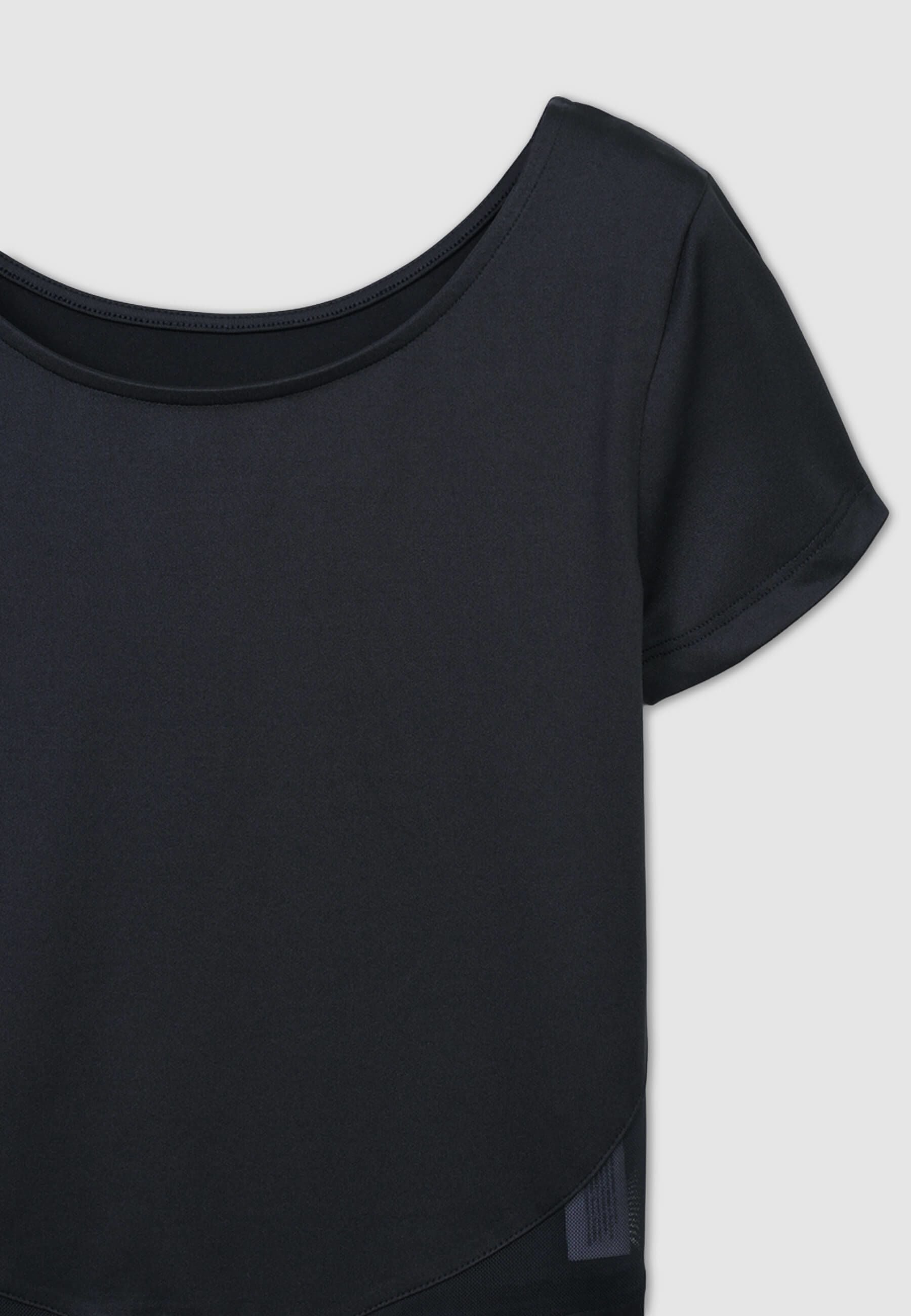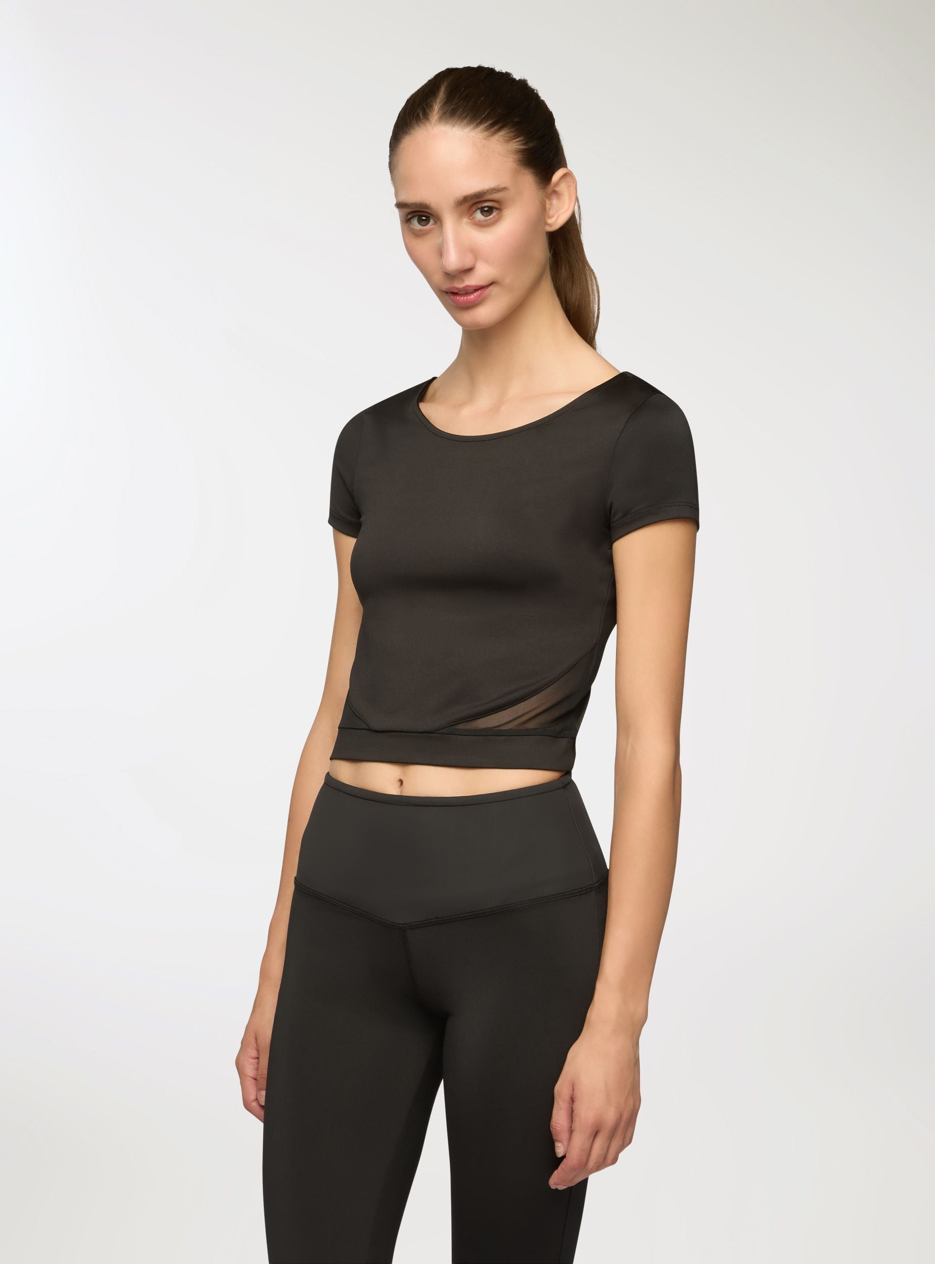 Ženska sportska majica kratkog kroja i uskog fit, idealna za ležerne i dinamične lookove. Minimalistički dizajn u jednoj boji lako se kombinira s tajicama ili sportskim hlačama za svestran stil. Kratki rukavi i široki dekolte ističu siluetu, dok poluprozirni detalj od tila dodaje modernu i ženstvenu notu. Savršena za slobodno vrijeme ili sportske outfite. Active linija.