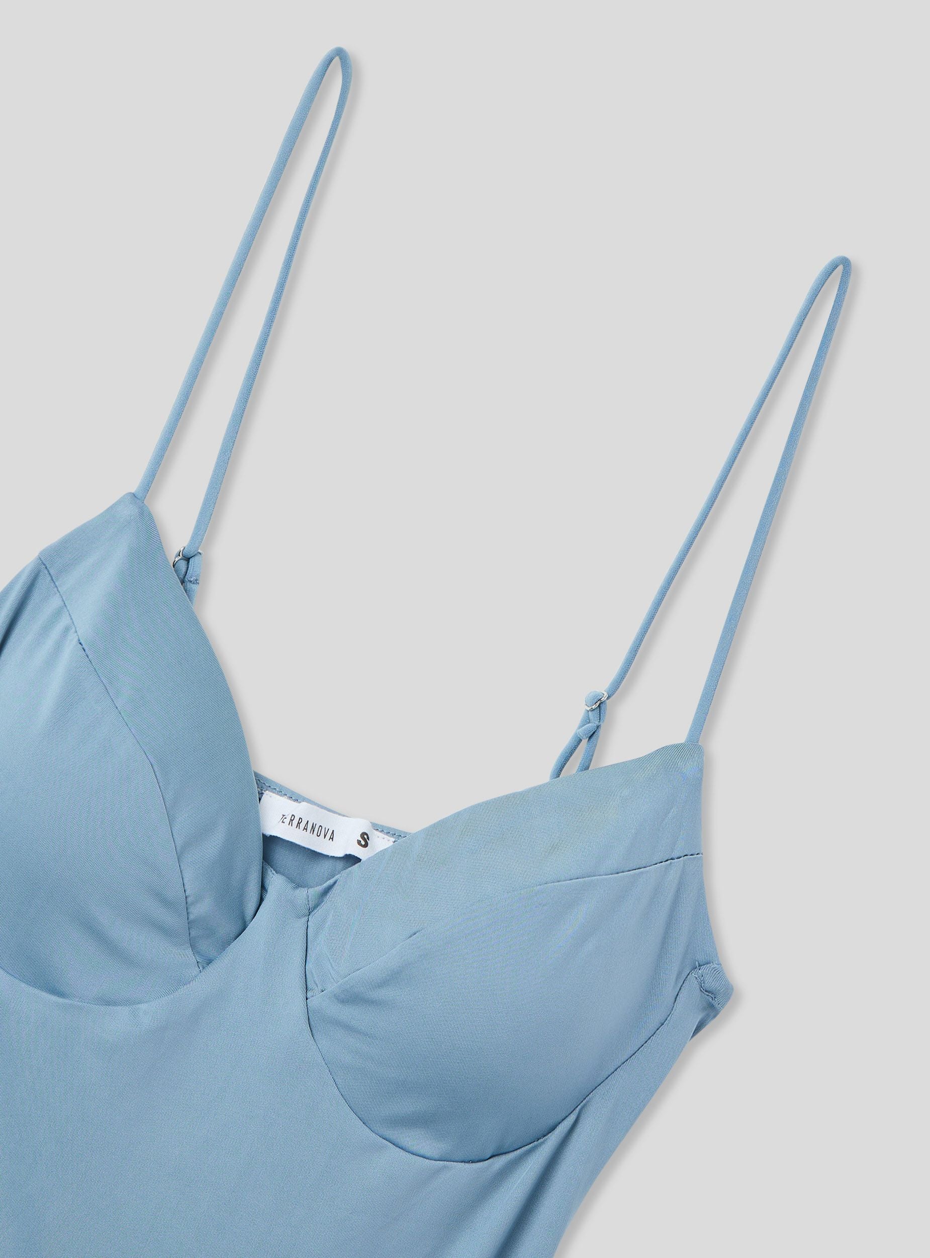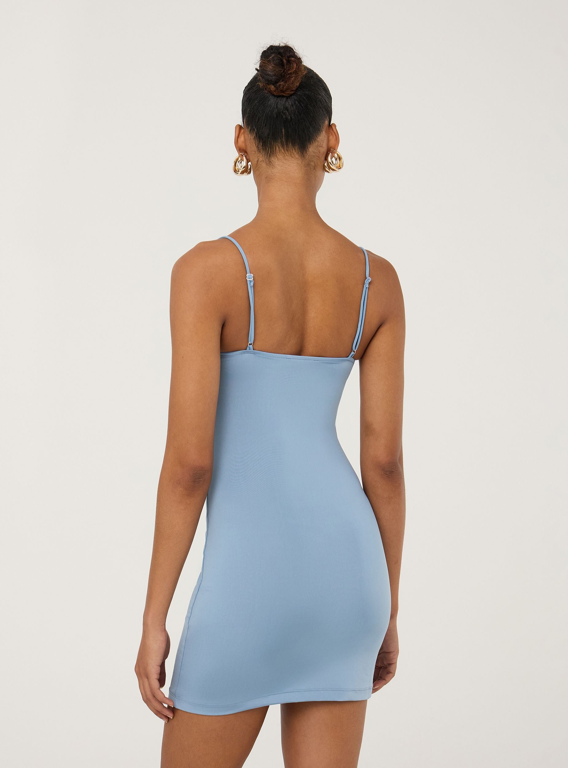 Kratka ženska haljina u jednobojnoj boji, s bodydress dizajnom koji ističe siluetu. Ima strukturirane košarice za optimalnu podršku i tanke podesive naramenice koje nude prilagođenu udobnost. Svestran i rafiniran komad, namijenjen onima koji vole esencijalni, ali upečatljiv stil.Detalji