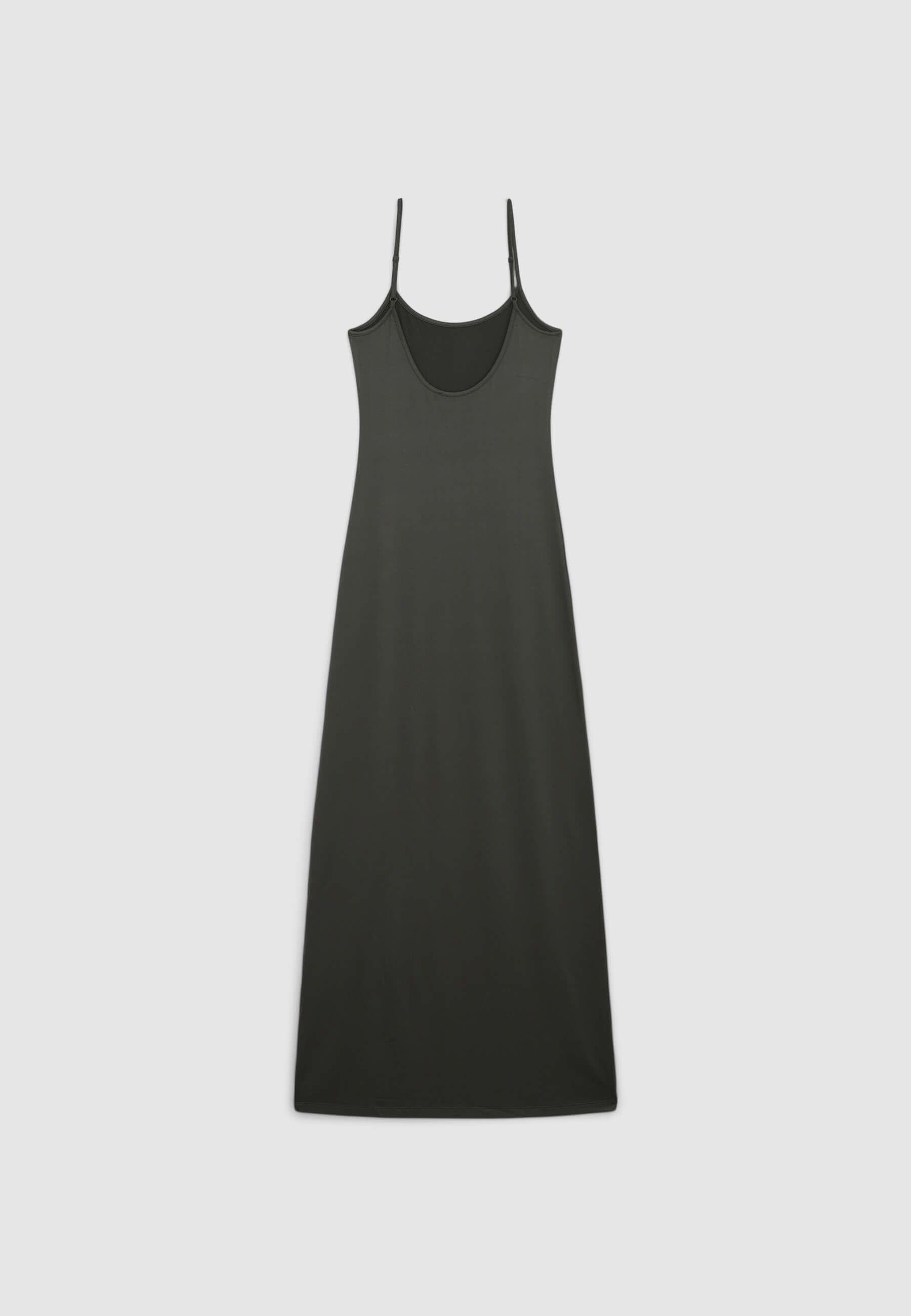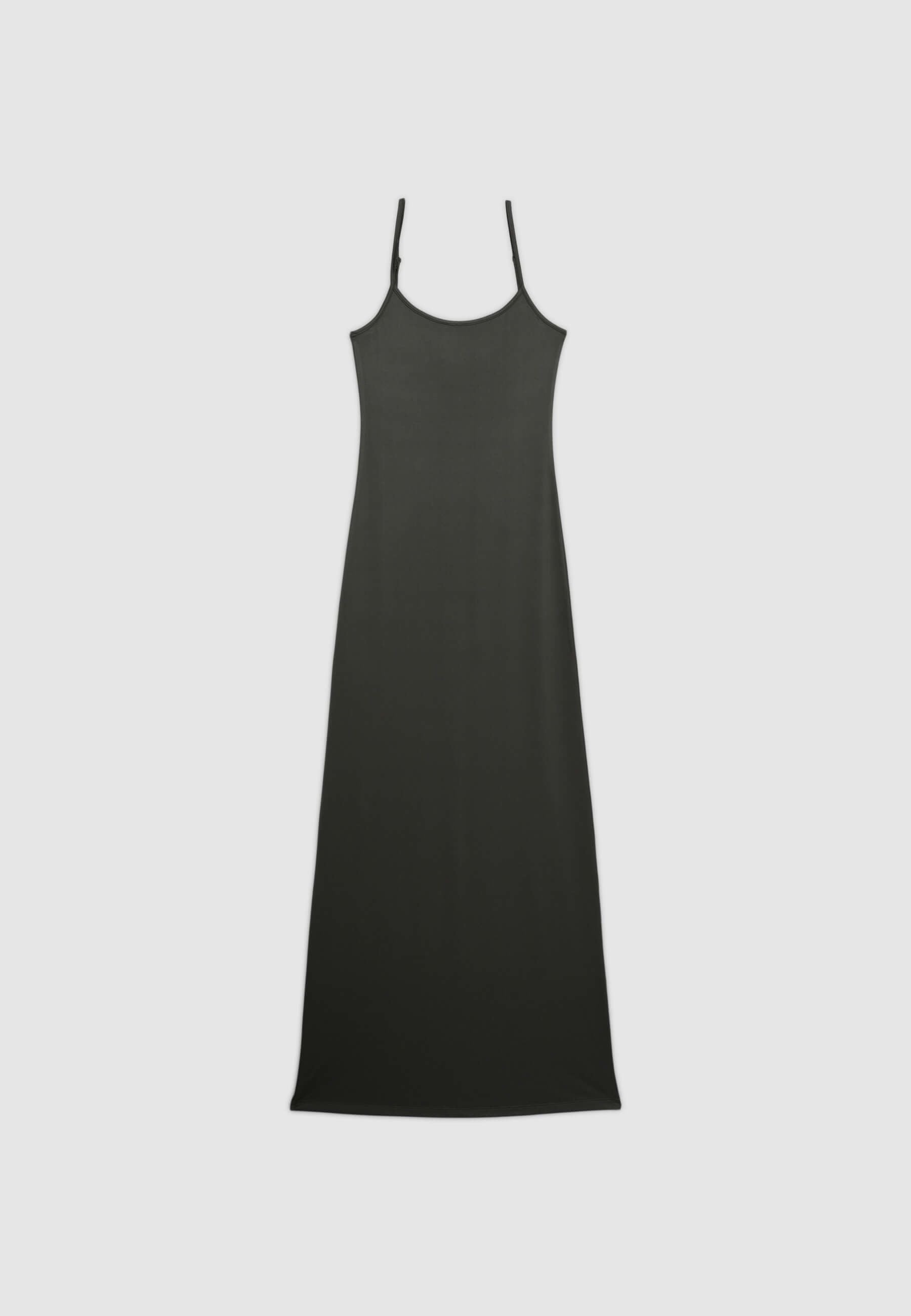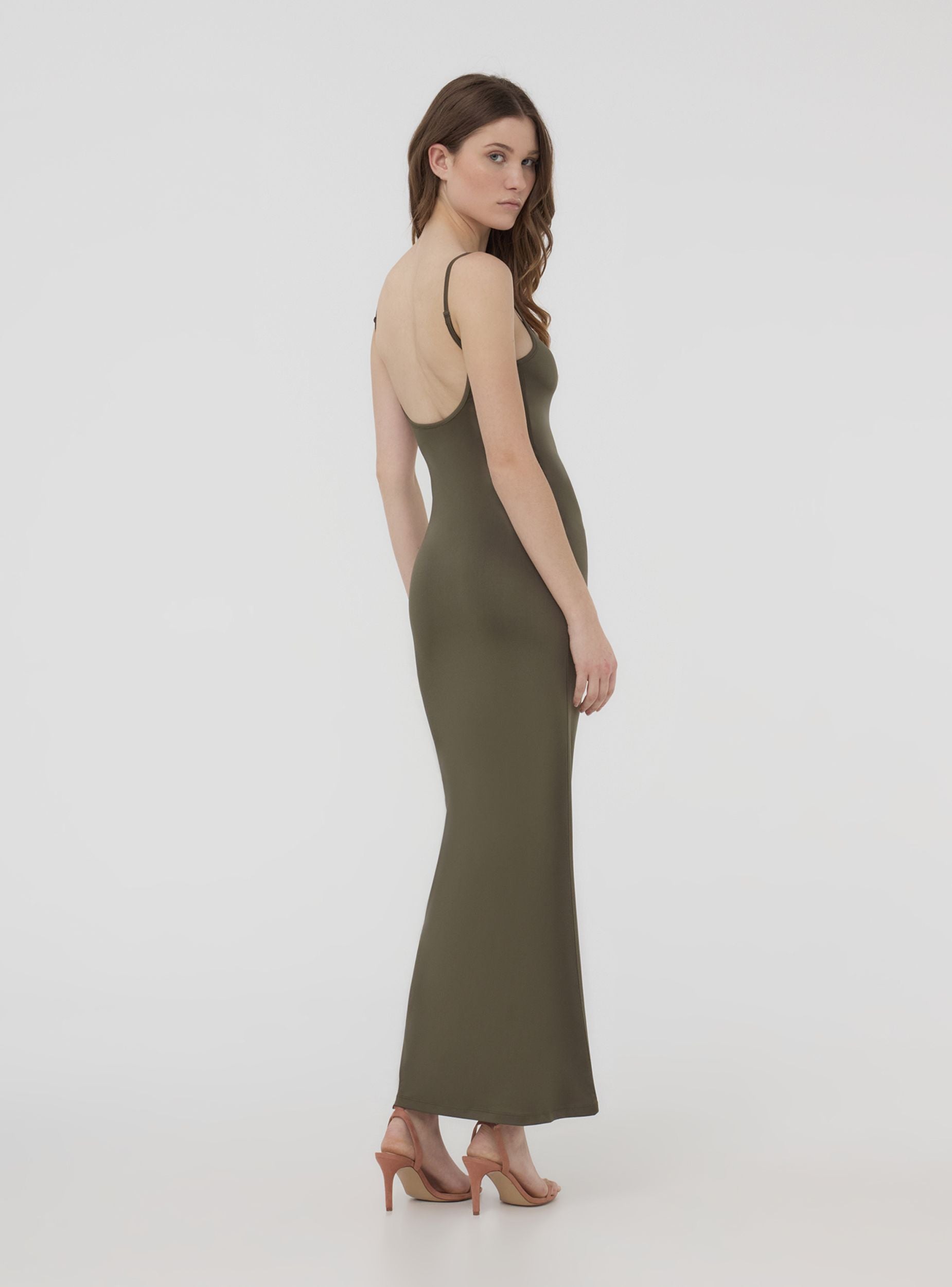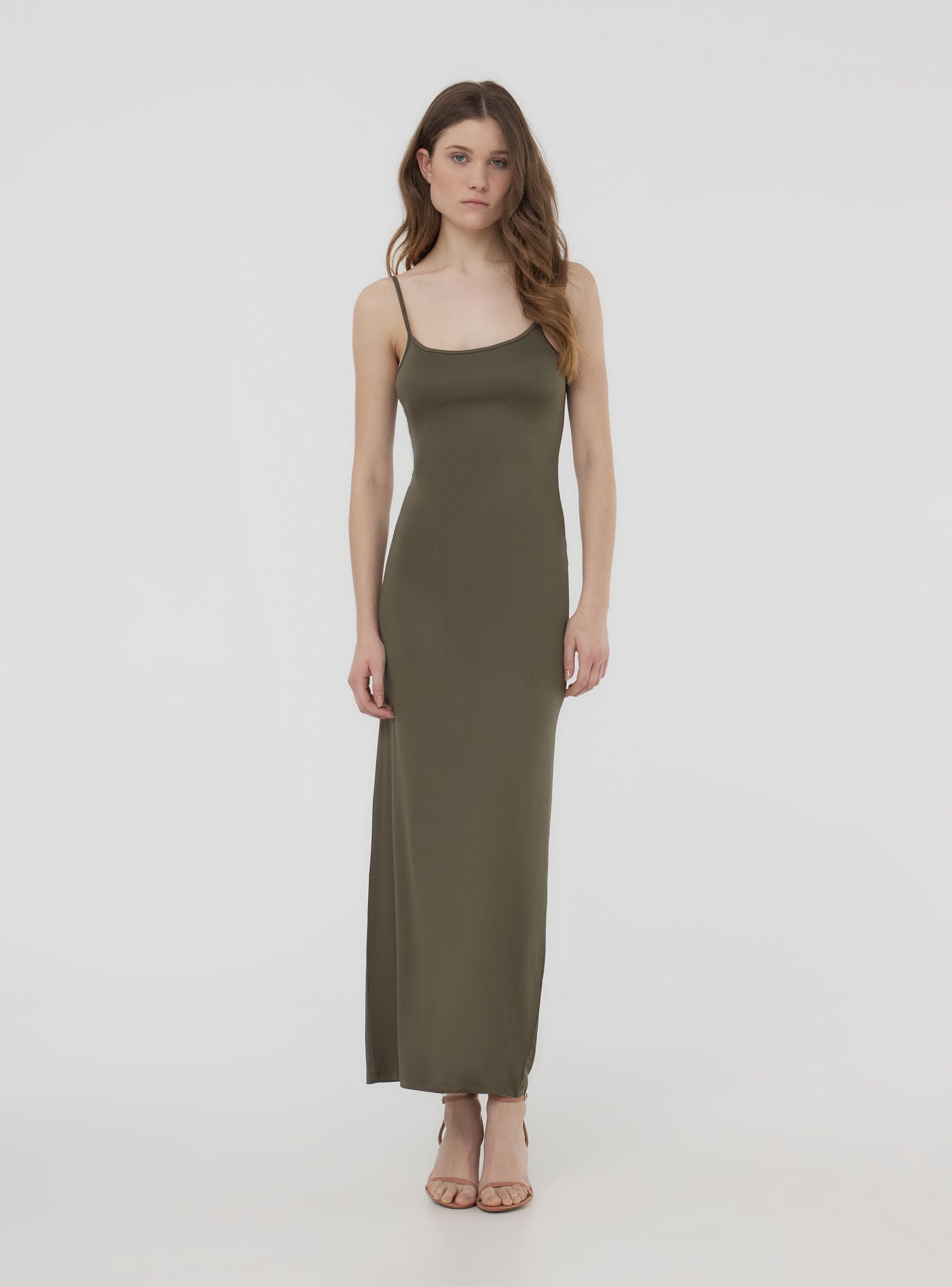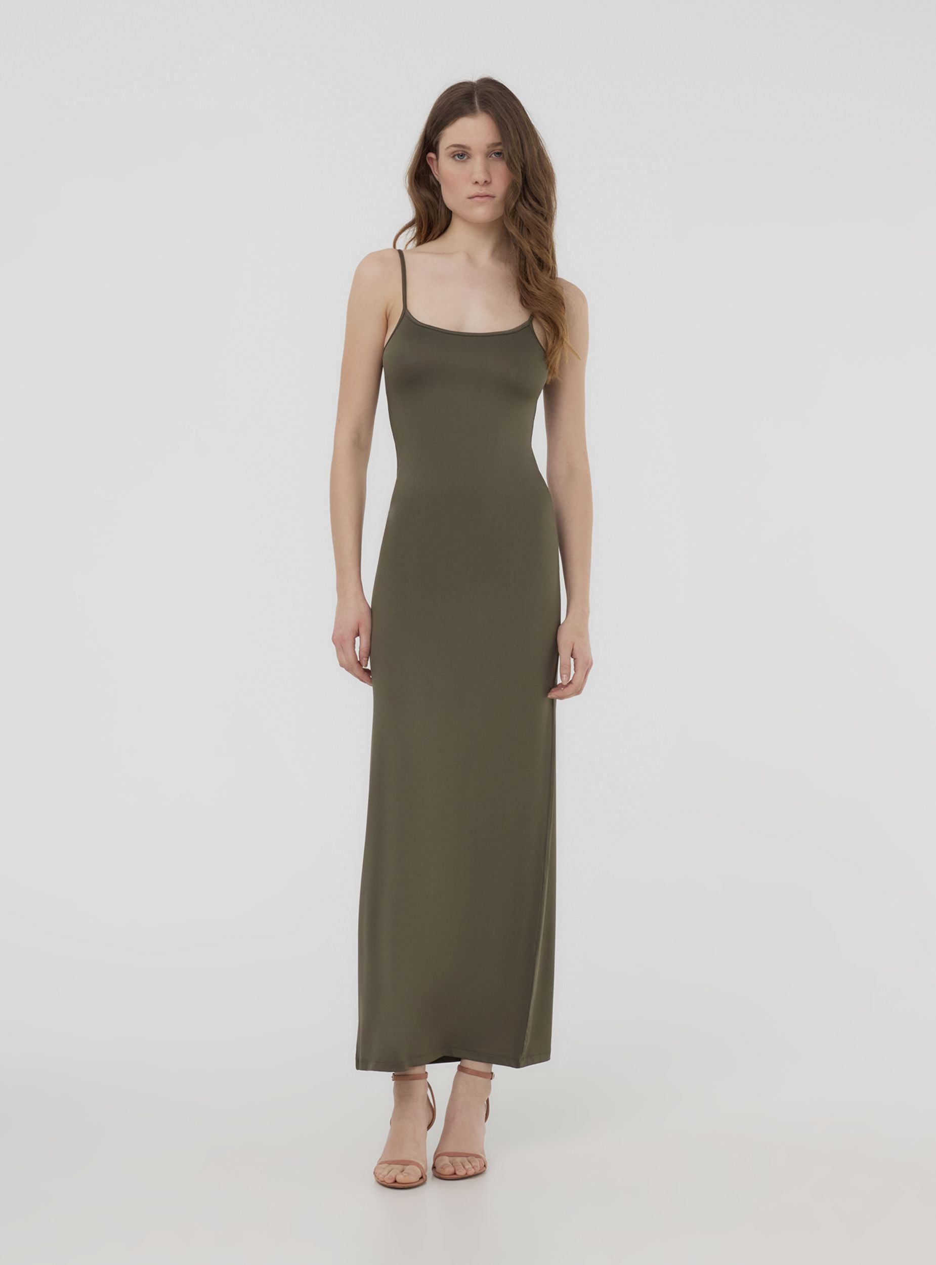 Ženska haljina u jednobojnoj boji, duga i prilagodljiva, s bitno i rafiniranim stilom. Bodydress dizajn naglašava figuru, dok tanke podesive naramenice pružaju savršeno prilagođavanje tijelu, osiguravajući udobnost i praktičnost. Haljina ima jednostavan i delikatan izrez, idealna za kombiniranje s elegantnim dodacima ili casual-chic izgledom. Savršena za ljetne večeri ili elegantne događaje, zahvaljujući svom linearnom i uskom kroju koji diskretno i elegantno ističe prirodne linije tijela.Detalji