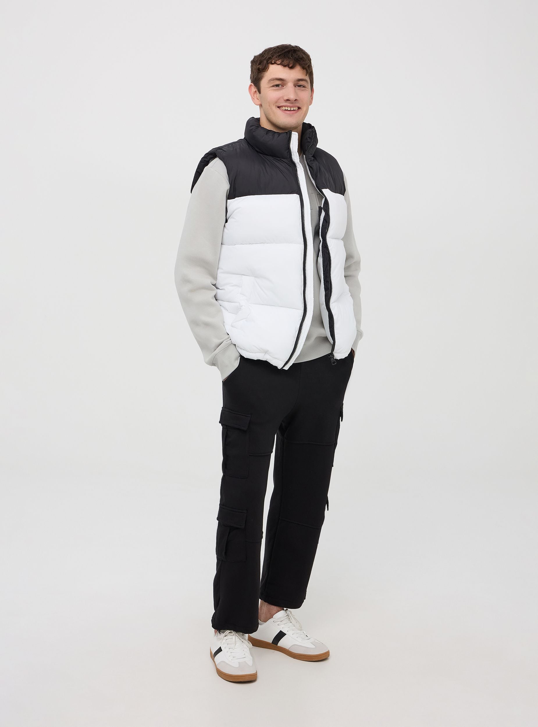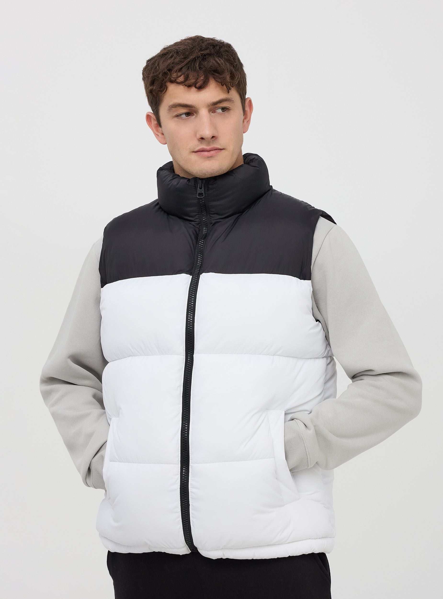 Muški jakna blok boje od nylonu, model prsluka bez rukava s visokim ovratnikom i prednjim zatvaranjem na zip, opremljena bočnim džepovima s gumbom na pritisak i malim unutarnjim džepom. Donji rub ima vezicu i stopper za prilagodbu kroja. Horizontalno quiltanje daje prsluku moderan i sportski izgled, dok je punjenje od sintetičkog materijala savršeno za održavanje topline tijekom hladnih dana i osigurava maksimalnu udobnost bez opterećenja. Prsluk s punjenjem je svestran i funkcionalan komad, savršen za prijelazna godišnja doba. Dizajn bez rukava omogućuje veliku slobodu kretanja, čineći ga idealnim za aktivnosti na otvorenom ili za ležeran i dinamičan izgled.