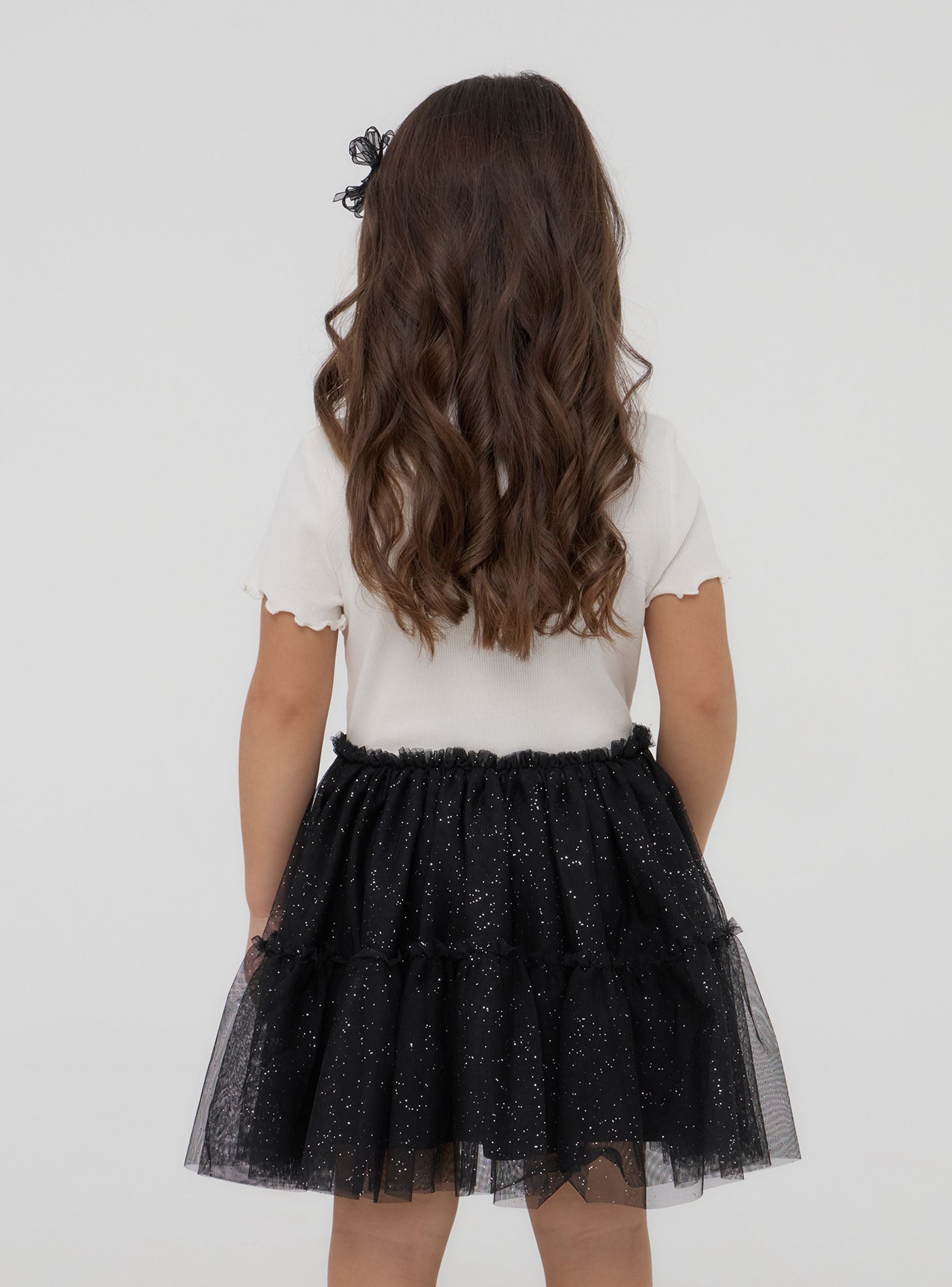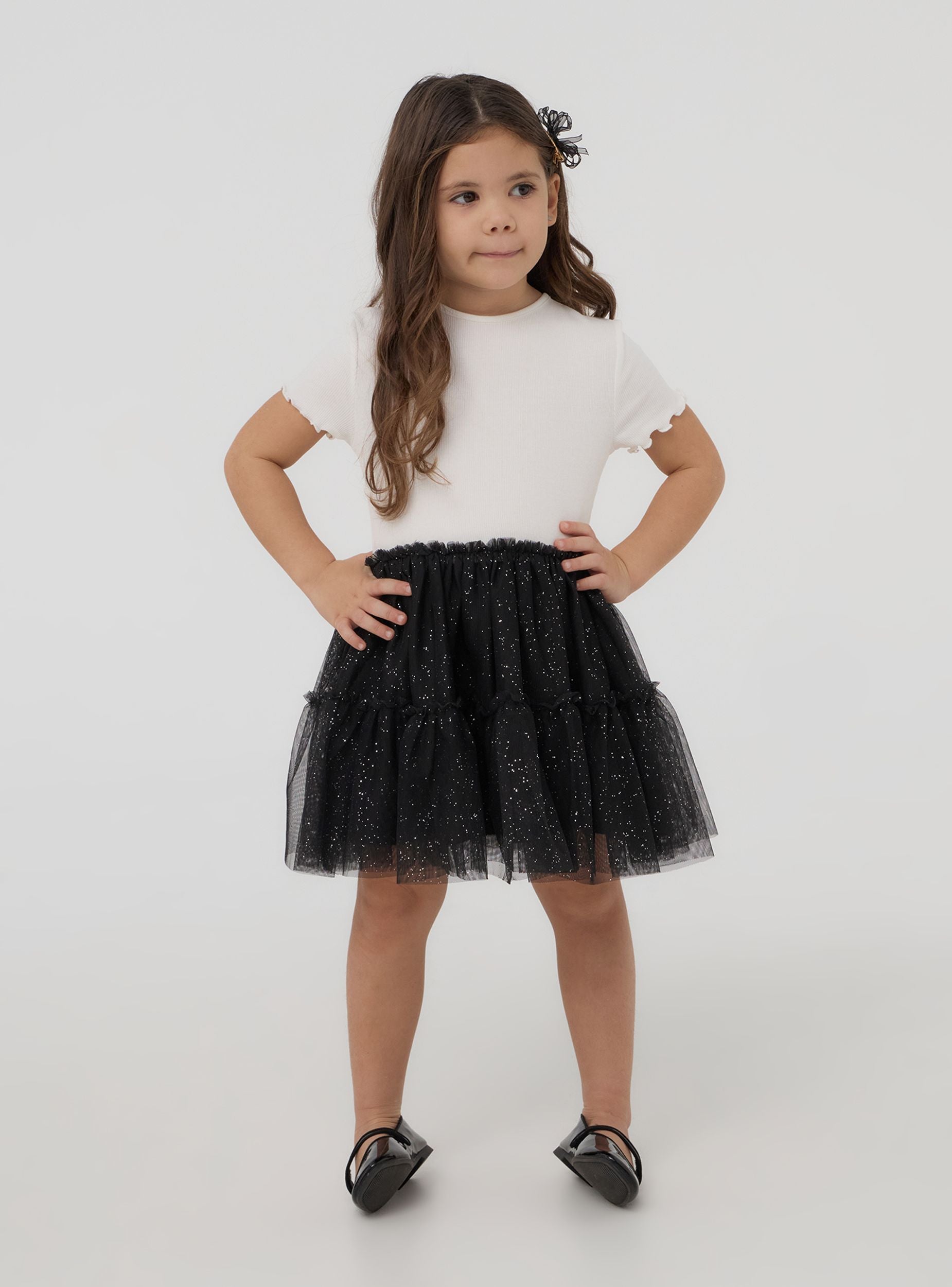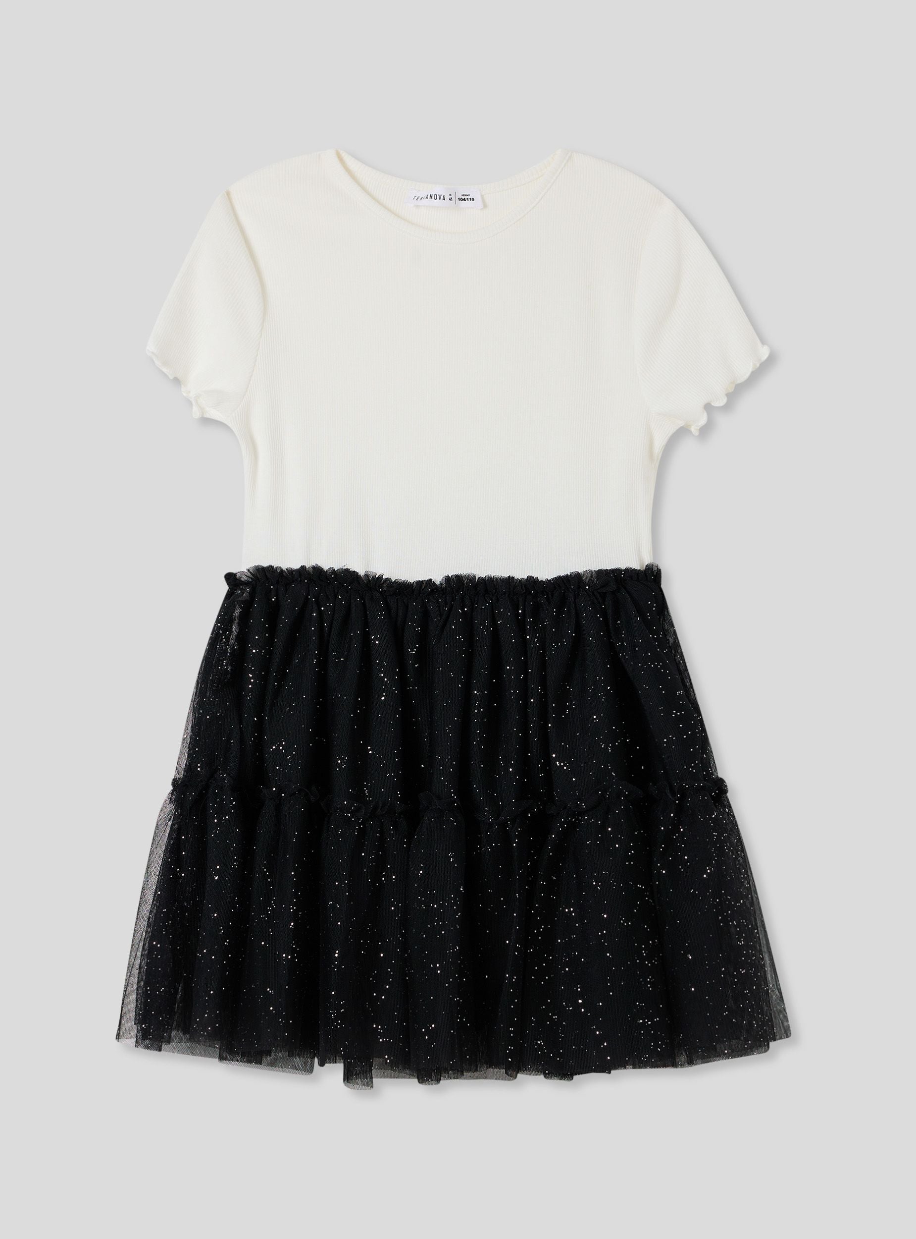 Haljina za djevojčice s dvobojnim izgledom i glamuroznim efektom. Ova haljina od dva materijala savršena je za one koji vole blistave detalje, zahvaljujući volanima od tila ukrašenim dodirom glittera koji je čine magičnom i idealnom za posebne prigode. Kratki rukavi i razigrani dizajn čine je udobnom i stilskom, savršeno se prilagođavajući ukusima malih djevojčica. Vesela i svestrana odjeća, osmišljena da svaka djevojčica osjeća kao pravu protagonistkinju.Detalji