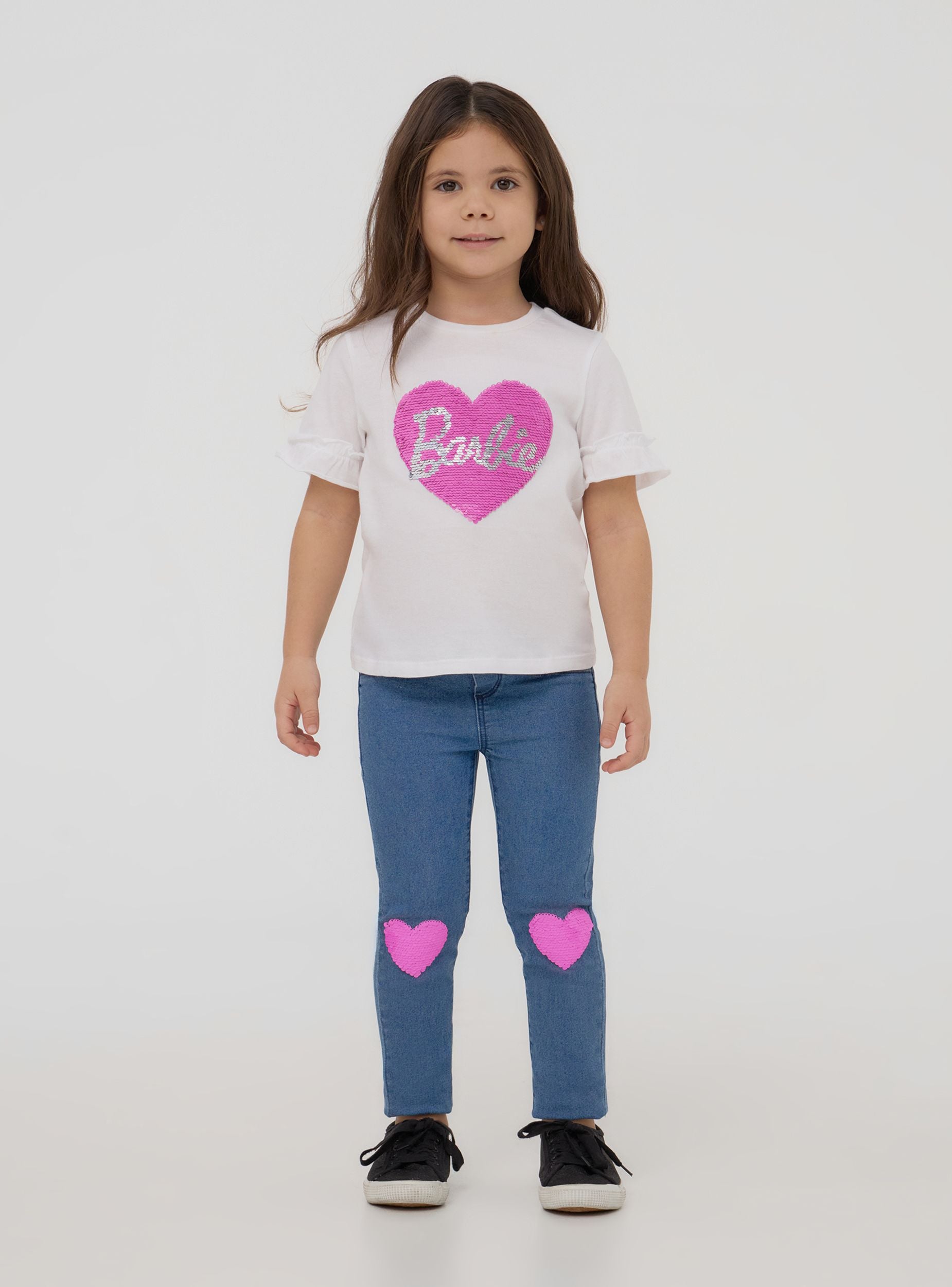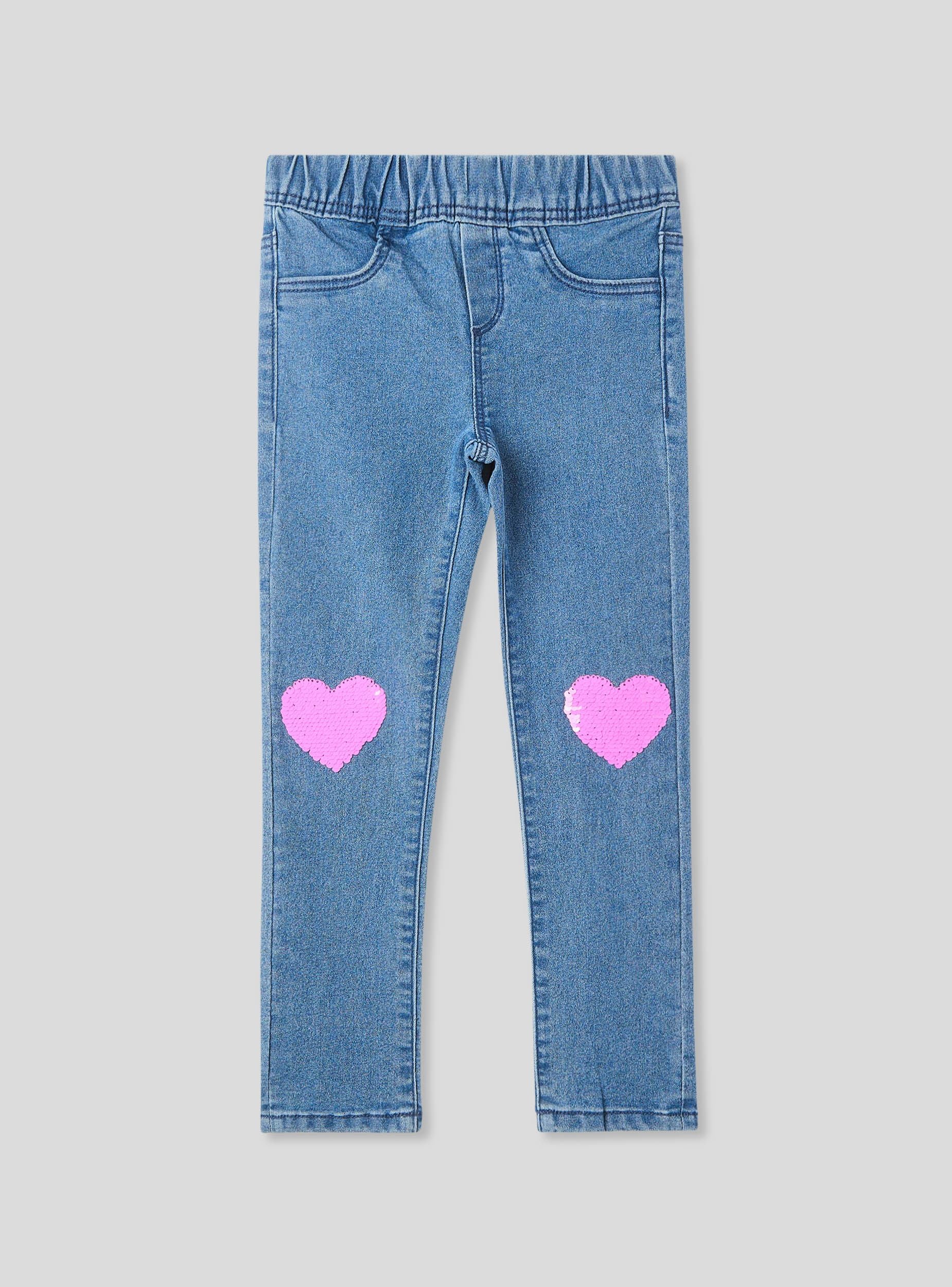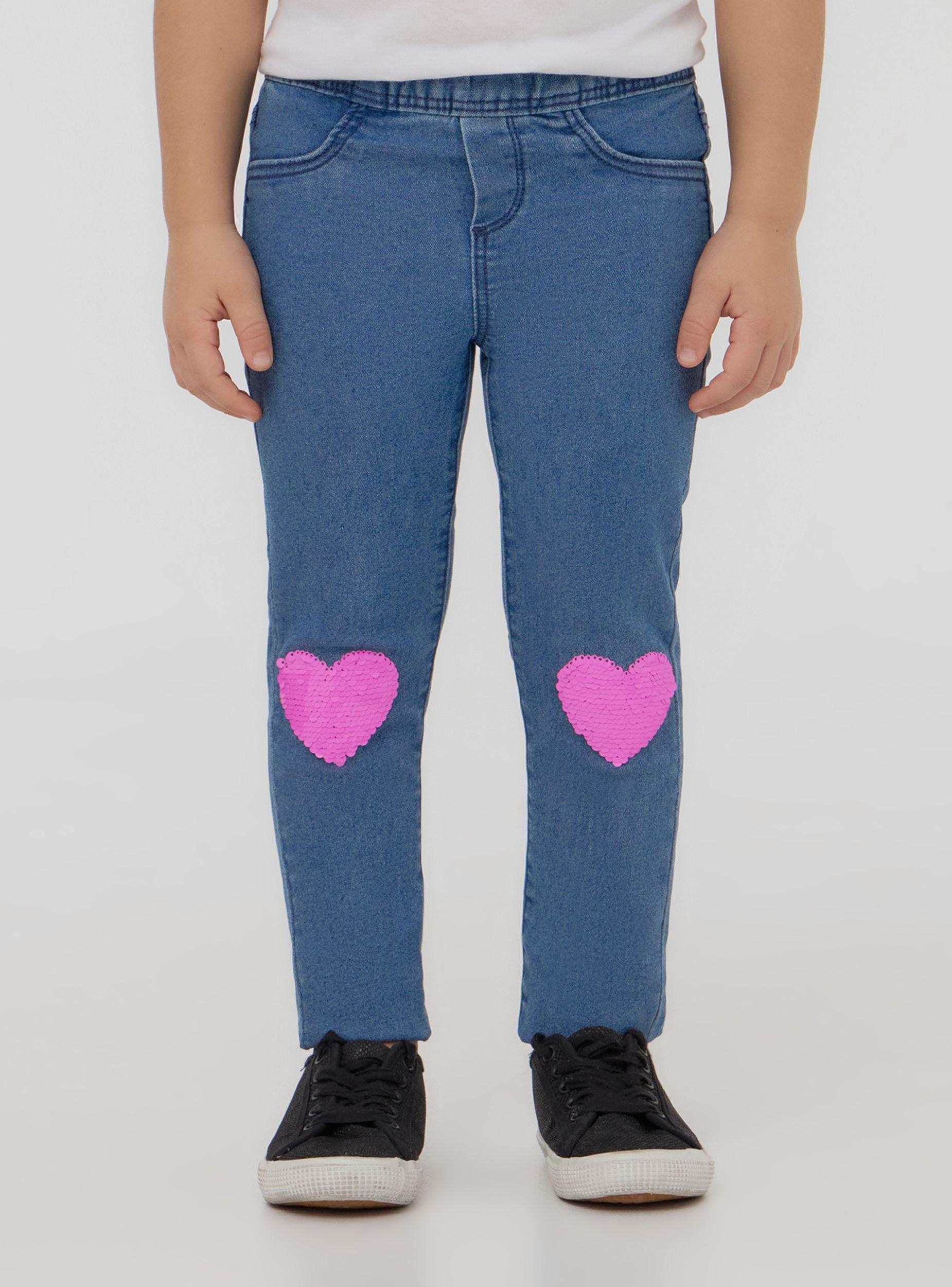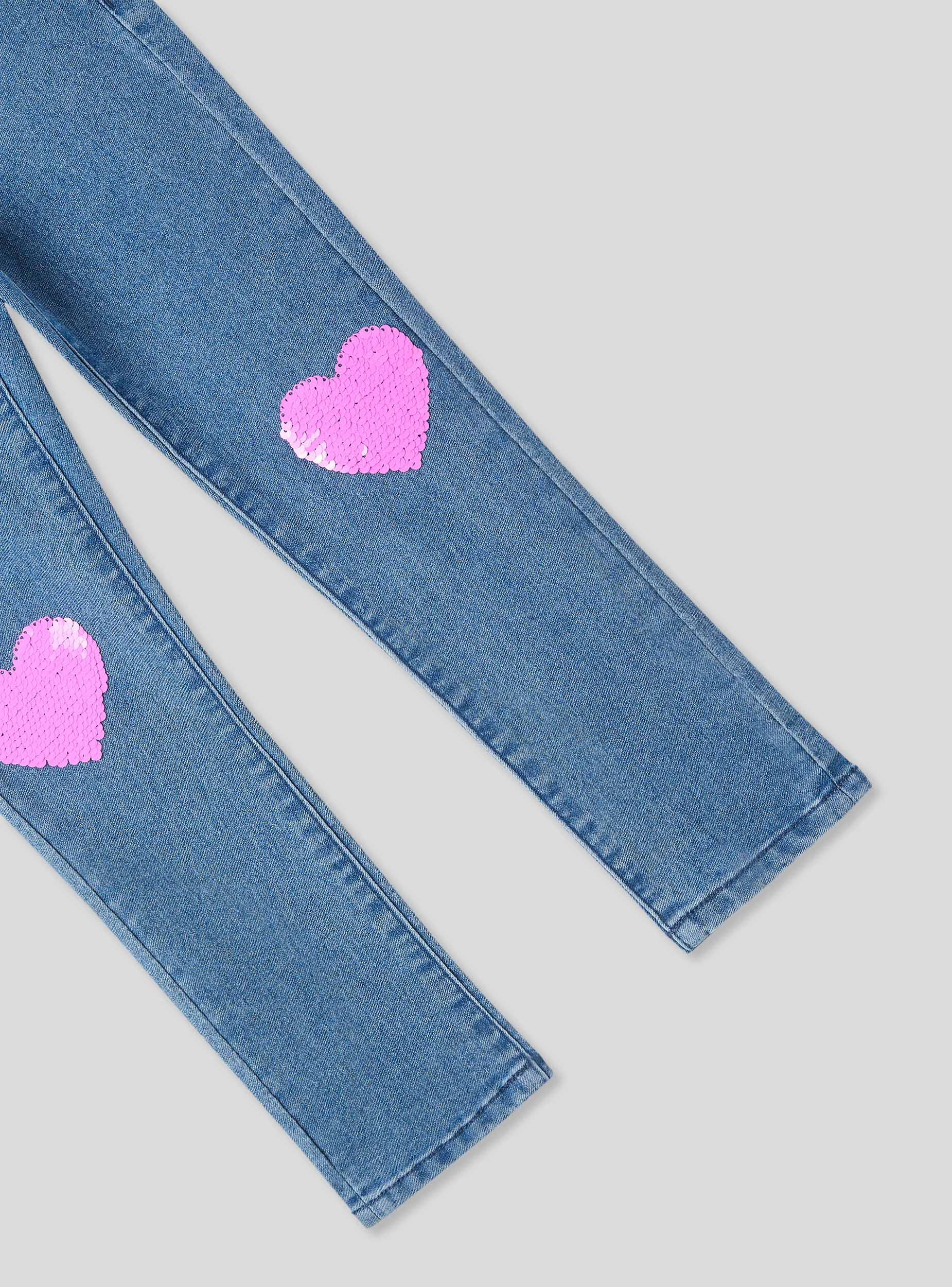 Jegginsi za djevojčice, savršeni za veseli i moderni izgled. Karakterizirani su aplikacijama od šljokica u obliku srca na koljenima, što im daje razigran i sjajan dodir. Udoban kroj čini ih idealnima za slobodno vrijeme i dane igranja. Savršeni su za kombiniranje s šarenim majicama i tenisicama za dinamičan outfit ili s džemperima i balerinkama za romantičniji izgled.Detalji