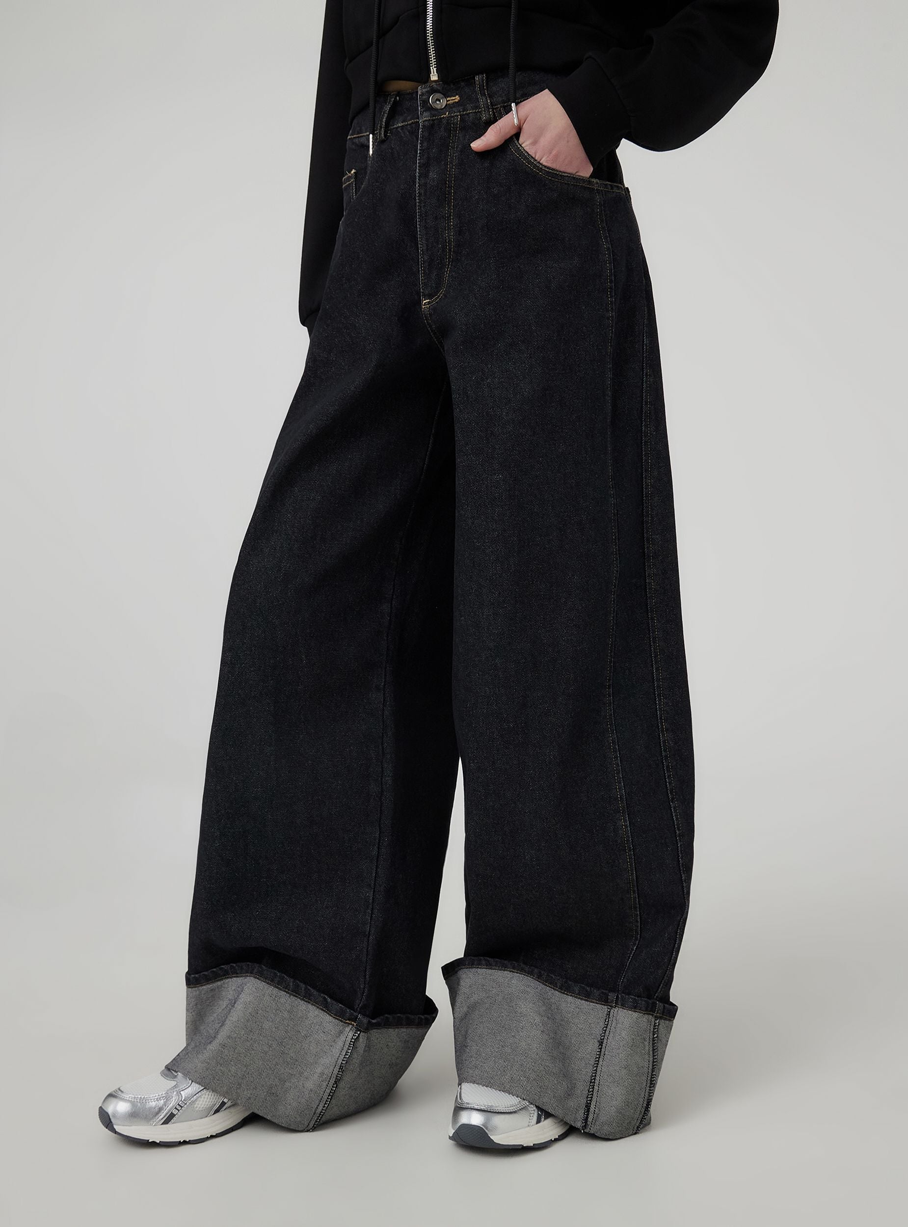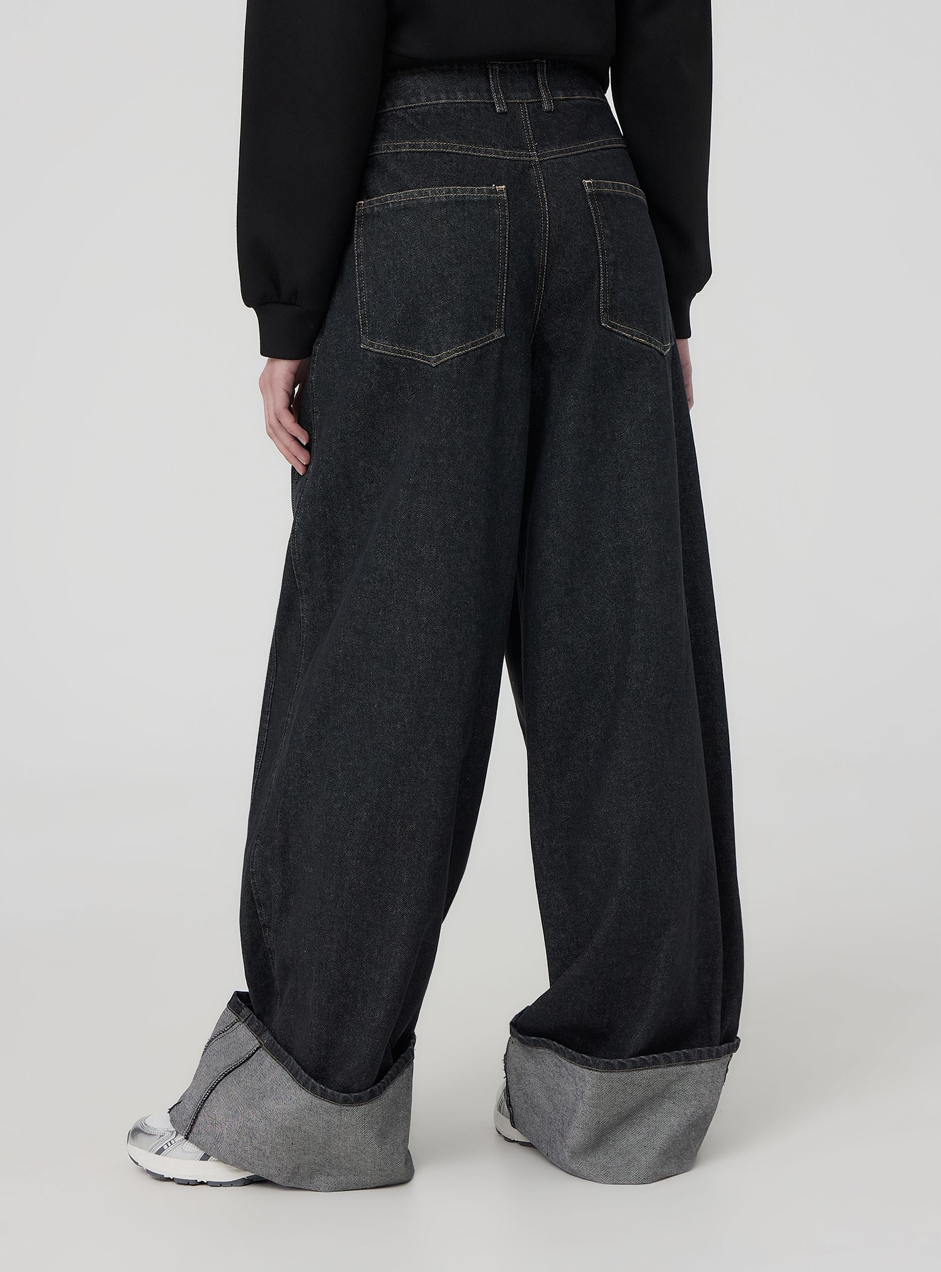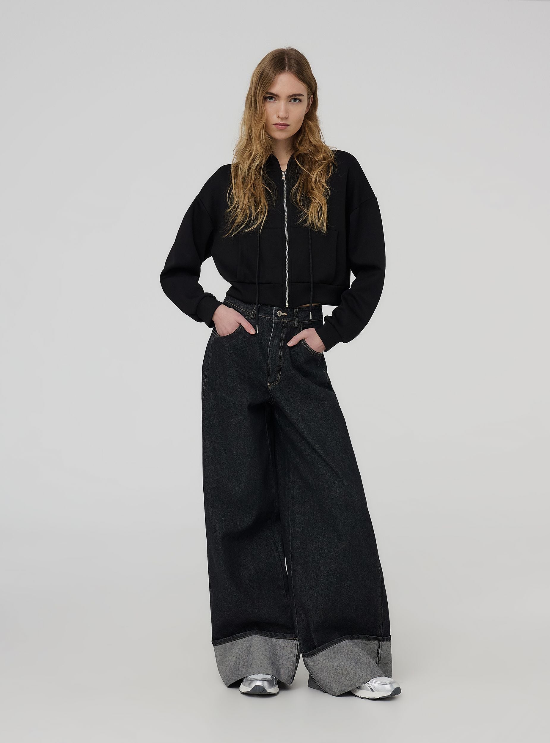 Ženske traperice modernog stila s širokim krojem koje osiguravaju trendi i udoban izgled. Detalj preklopa dodaje originalan dodir, savršen za upotpunjavanje ležernih outfita s twistom. Praktične i svestrane, idealne su za kombiniranje s crop topovima ili uskim majicama za suvremeni i odlučan stil.Detalji