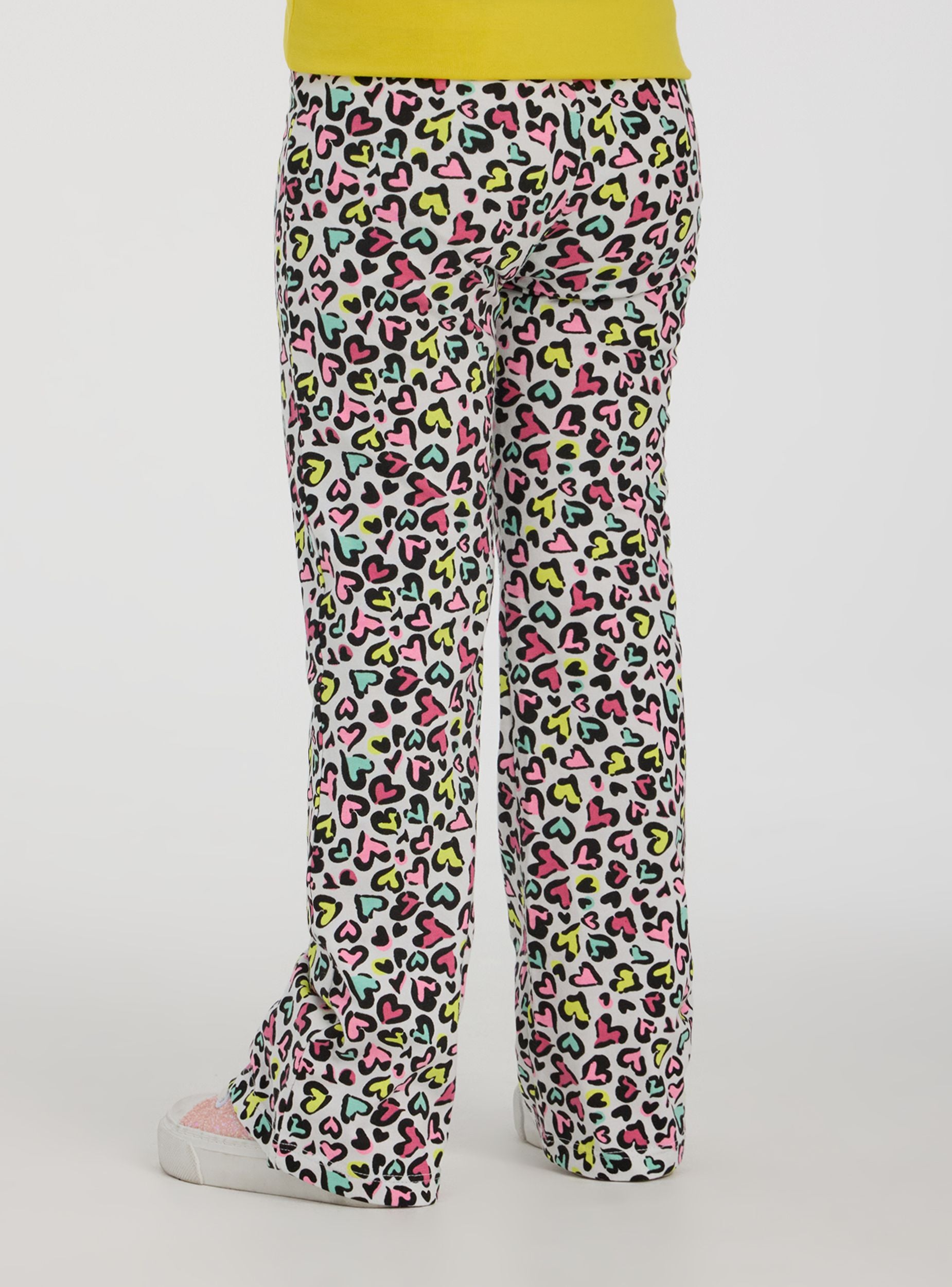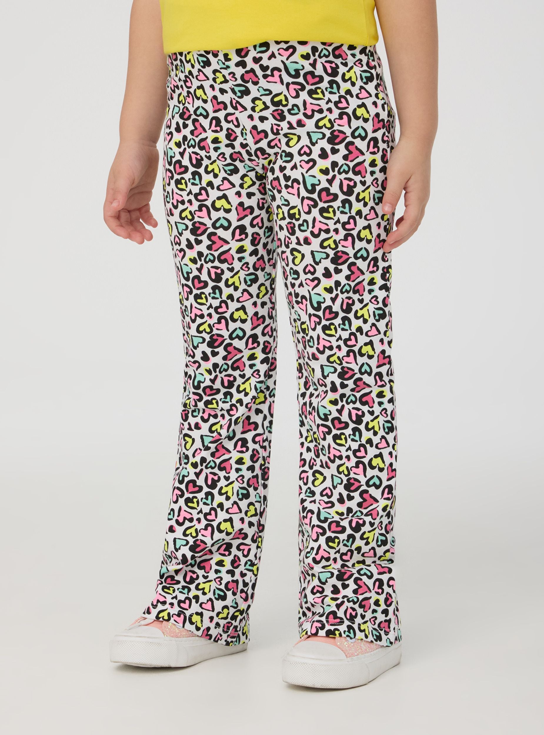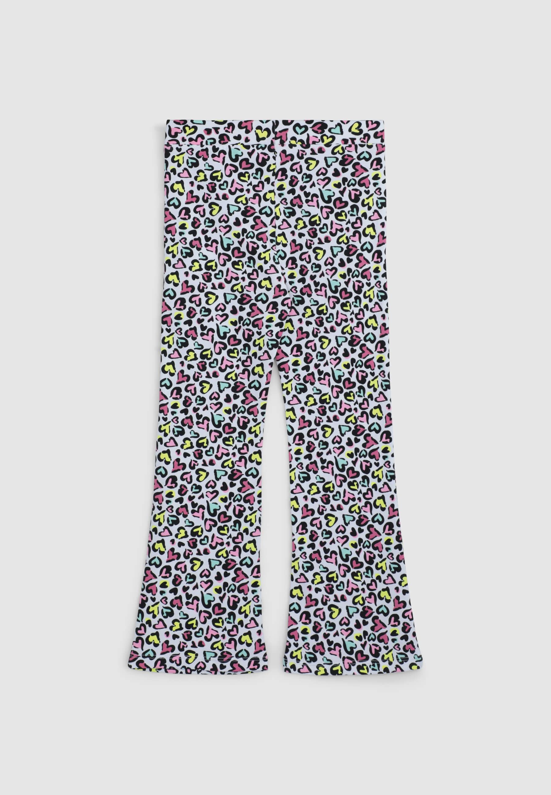 Leggins za djevojčice savršeni za slobodno vrijeme, dugi i s elastičnim dizajnom koji osigurava slobodu kretanja. Karakterizirani su zvonastim krojem koji dodaje dašak stila, obogaćeni su uzorkom s točkicama i višebojnim srcima, idealni za stvaranje živahnih i originalnih odjevnih kombinacija.Detalji