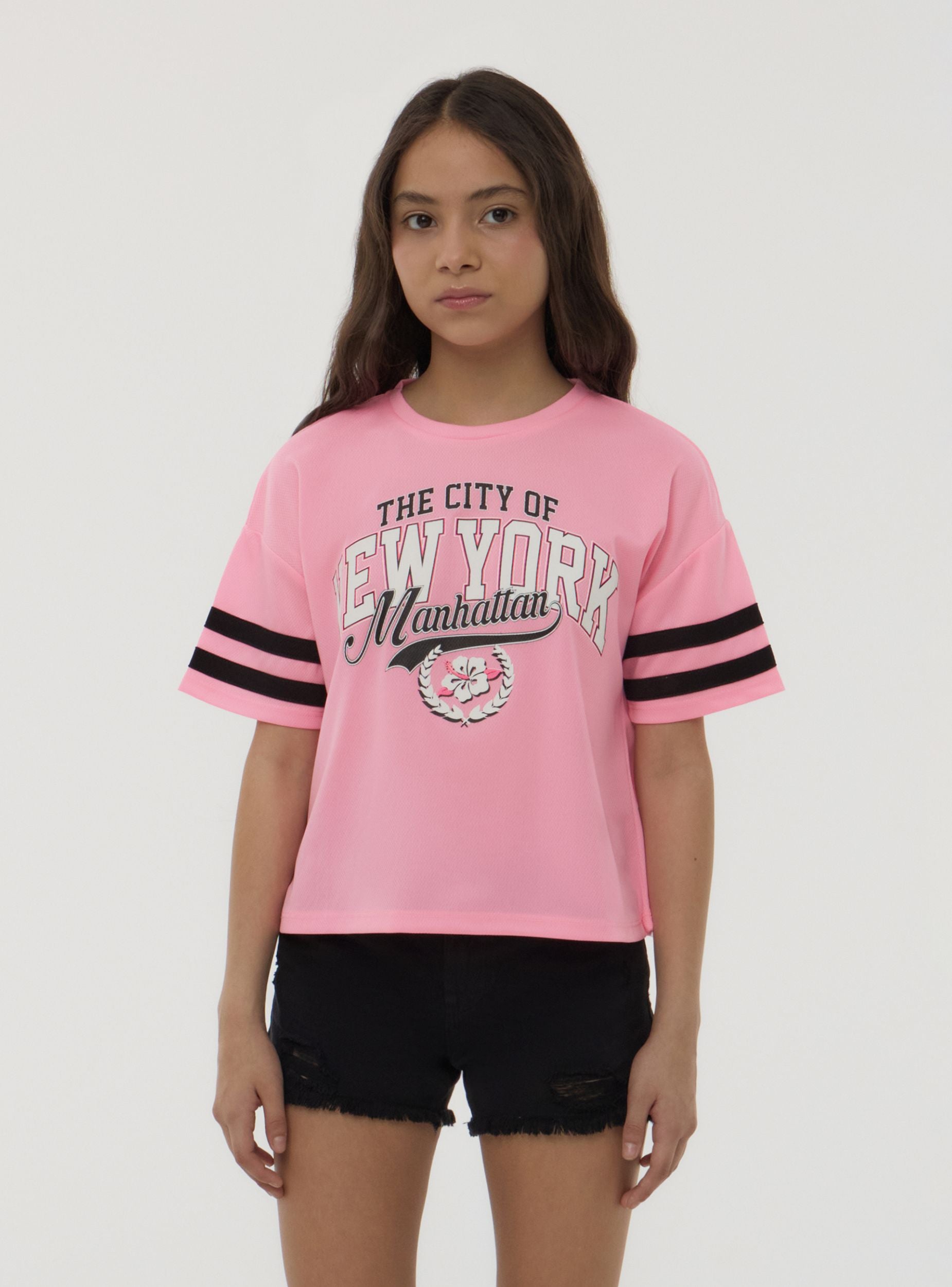 Majica za djevojčice idealna za ležeran i dinamičan izgled, savršena za slobodno vrijeme. Karakterizirana regularnim krojem, ima print s natpisima sprijeda i detalje s trakama na kratkim rukavima. Svestran i moderan komad, prikladan za razne neformalne prilike.Detalji
