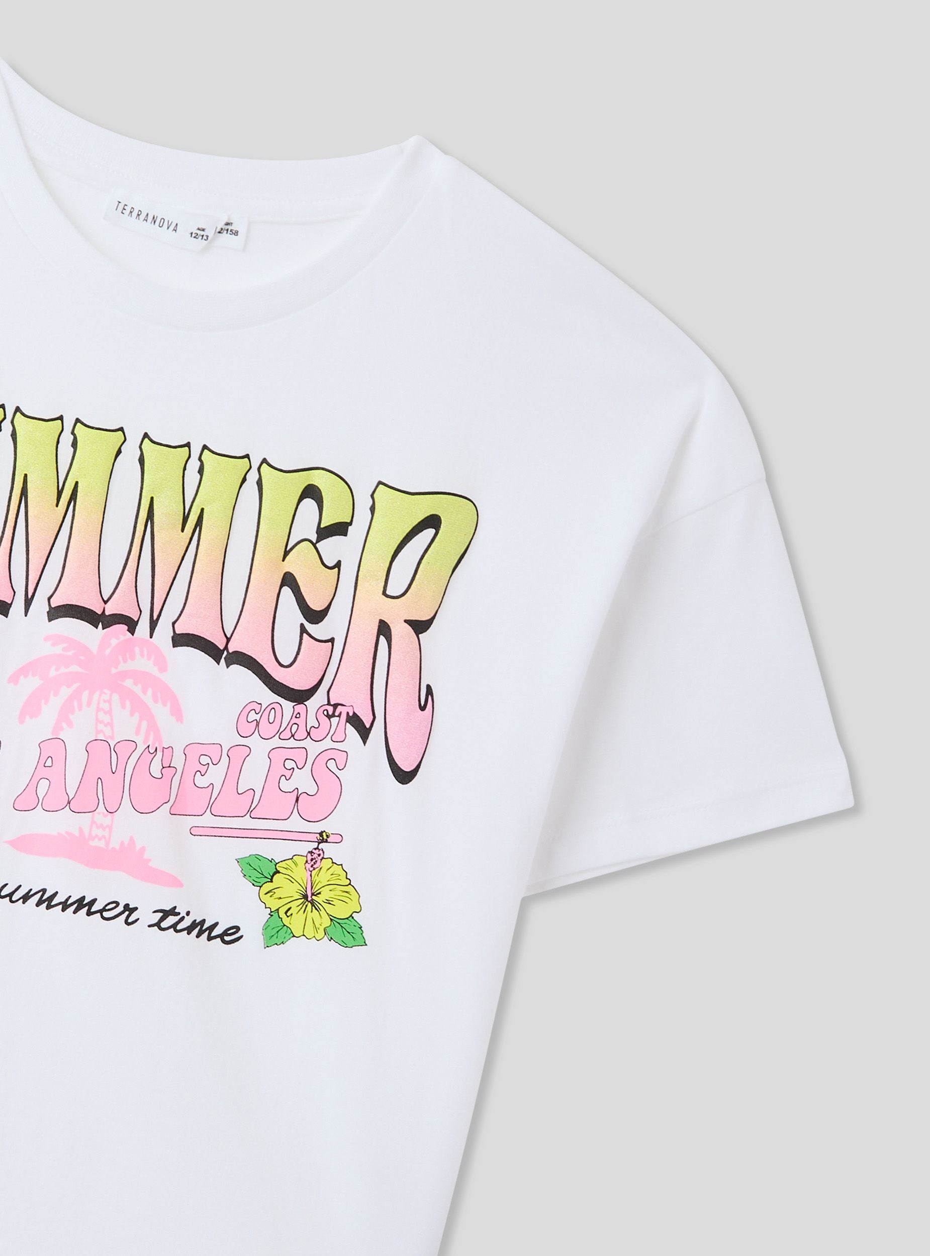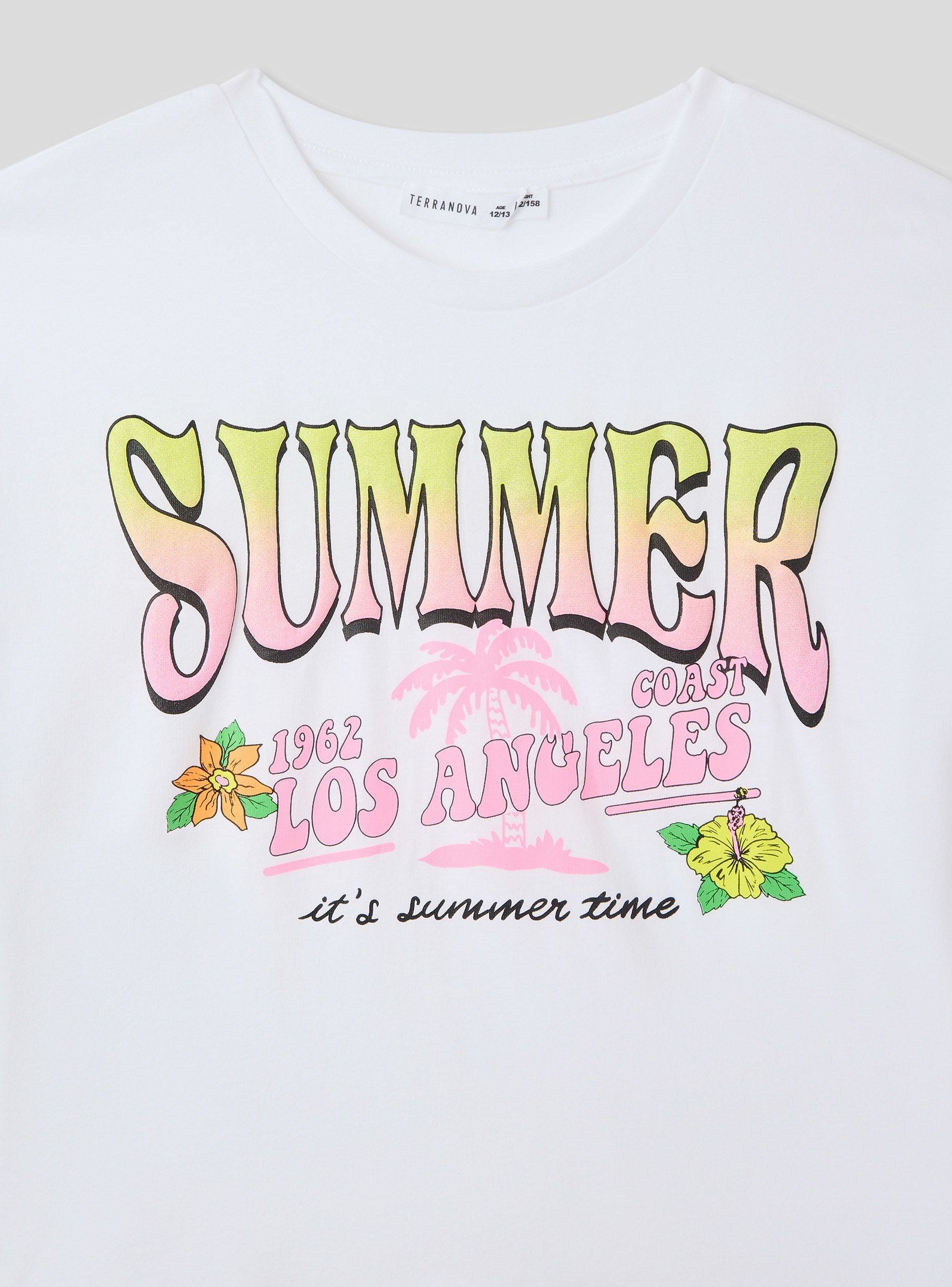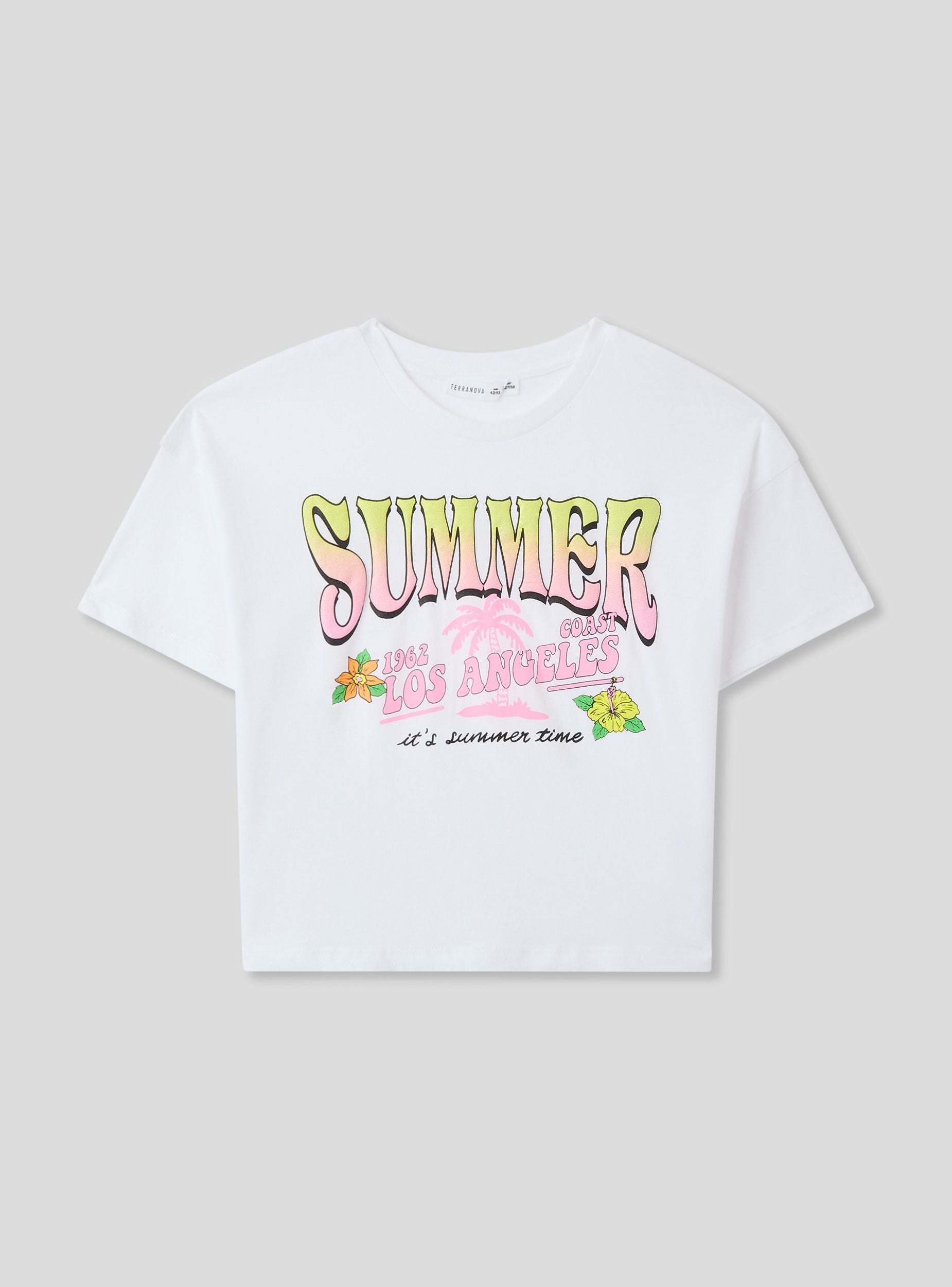 Majica za djevojčice s kratkim rukavima i okruglim izrezom, savršena za dodavanje daška veselja ljetnim izgledima. Print "Summer" s živopisnim detaljima dočarava atmosferu odmora, čineći je idealnom za slobodno vrijeme i dane na otvorenom. Lako se kombinira s kratkim hlačama, suknjama ili tajicama za udoban i moderan outfit. Savršena za one koji vole oblačiti se sa stilom i lakoćom u najtoplijem godišnjem dobu.Detalji
