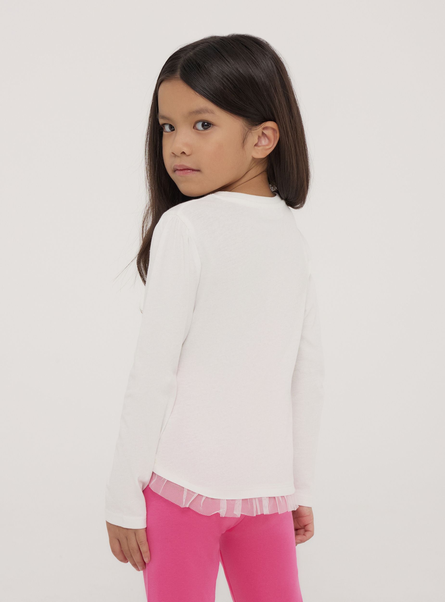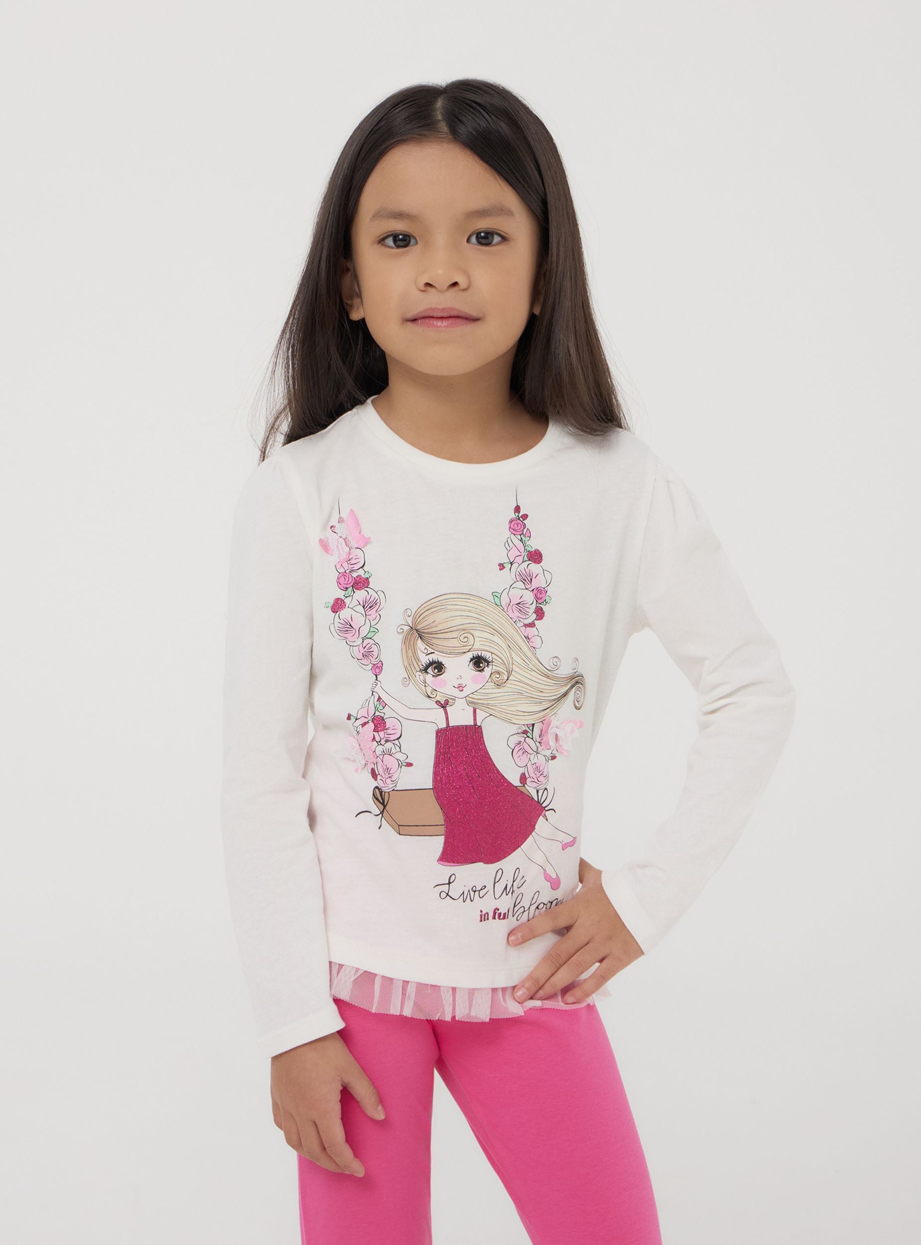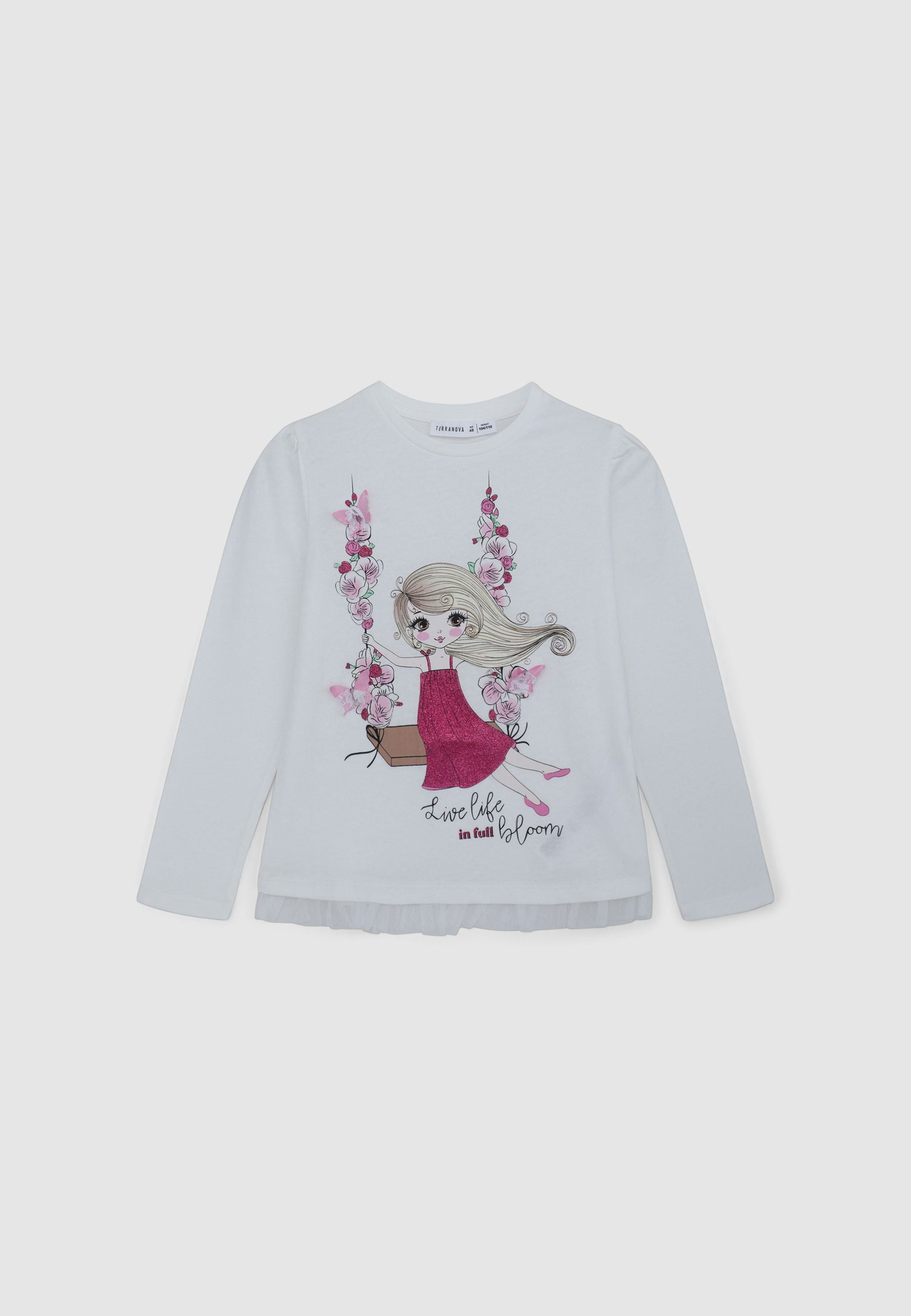 Dječja majica s dugim rukavima i okruglim izrezom, karakterizirana otiskom slatke lutke, obogaćena sjajnim glitterom koji dodaje dašak svjetlosti. Dekoracija se upotpunjuje aplikacijama leptira, stvarajući trodimenzionalni i zabavni efekt. Na donjem dijelu, rub je obogaćen nježnim volanom od tila, koji daje dašak lakoće i ženstvenosti odjevnom predmetu, čineći ga savršenim za svaku posebnu priliku ili za dodavanje malo magije svakodnevnim danima.