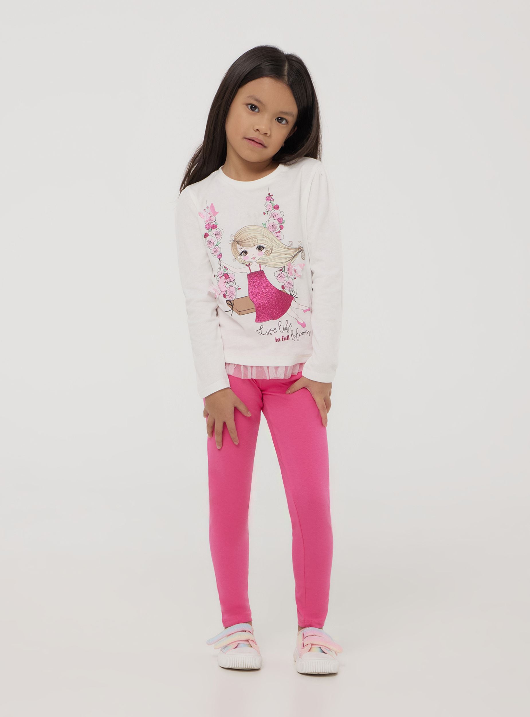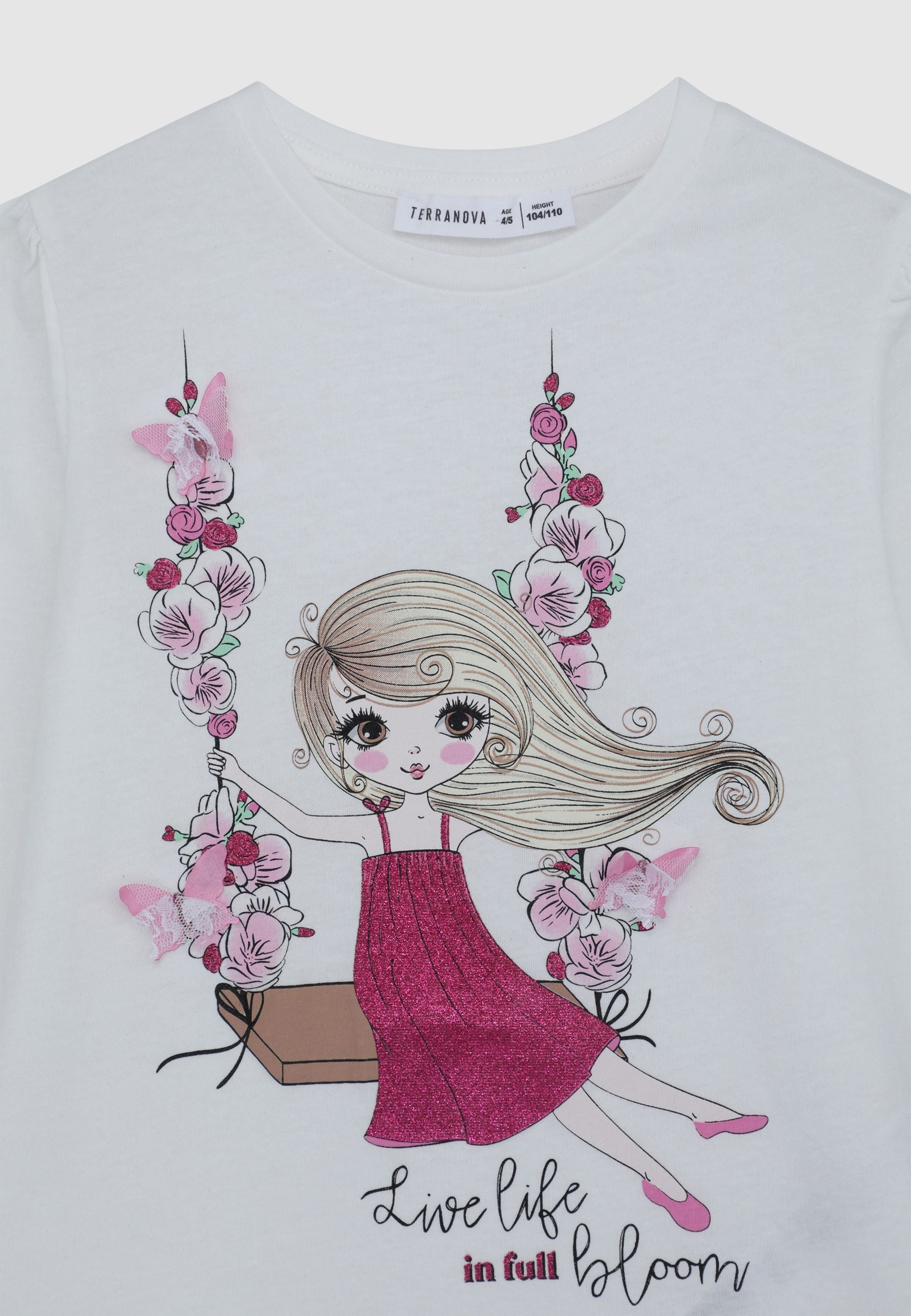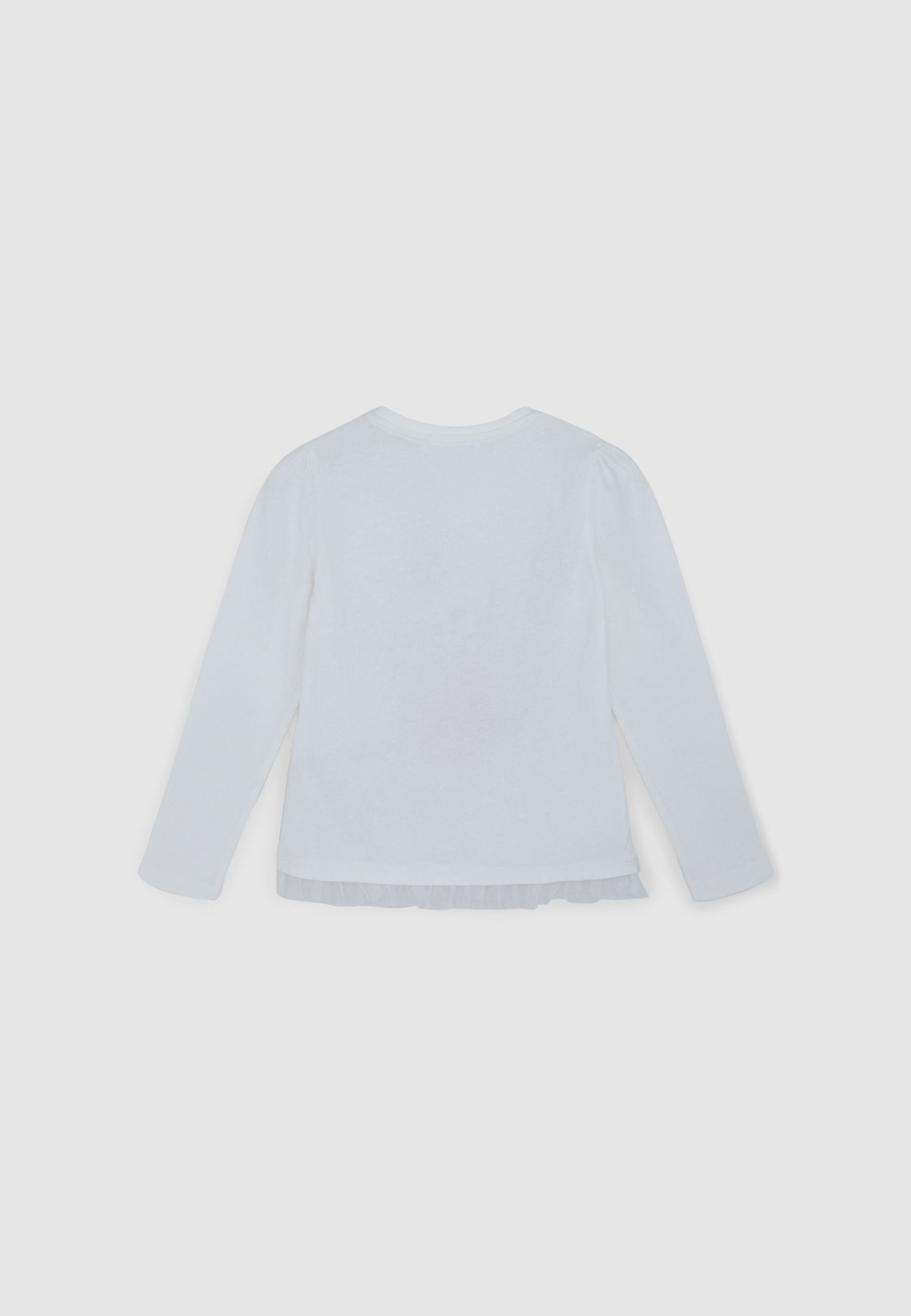 Dječja majica s dugim rukavima i okruglim izrezom, karakterizirana otiskom slatke lutke, obogaćena sjajnim glitterom koji dodaje dašak svjetlosti. Dekoracija se upotpunjuje aplikacijama leptira, stvarajući trodimenzionalni i zabavni efekt. Na donjem dijelu, rub je obogaćen nježnim volanom od tila, koji daje dašak lakoće i ženstvenosti odjevnom predmetu, čineći ga savršenim za svaku posebnu priliku ili za dodavanje malo magije svakodnevnim danima.