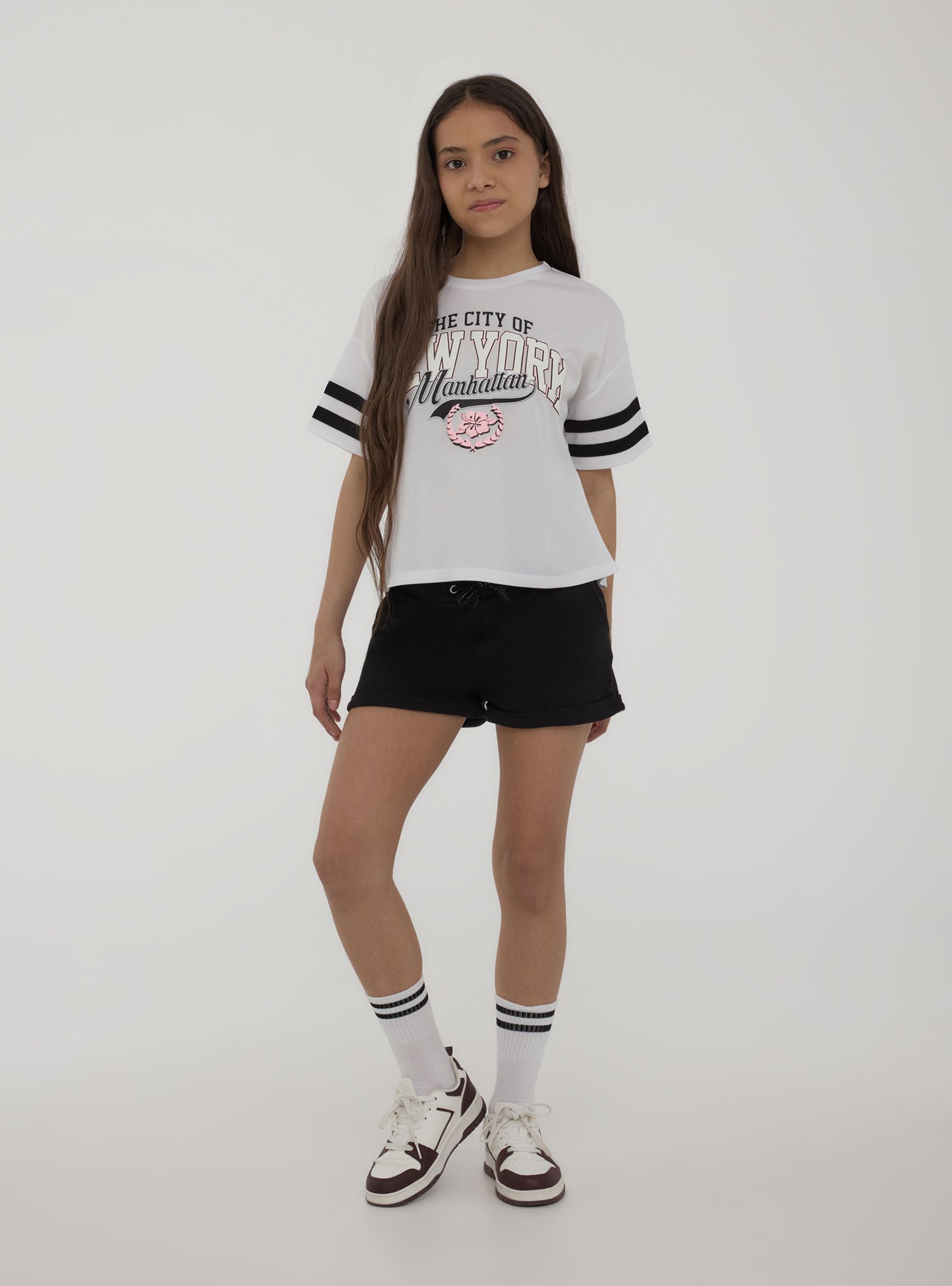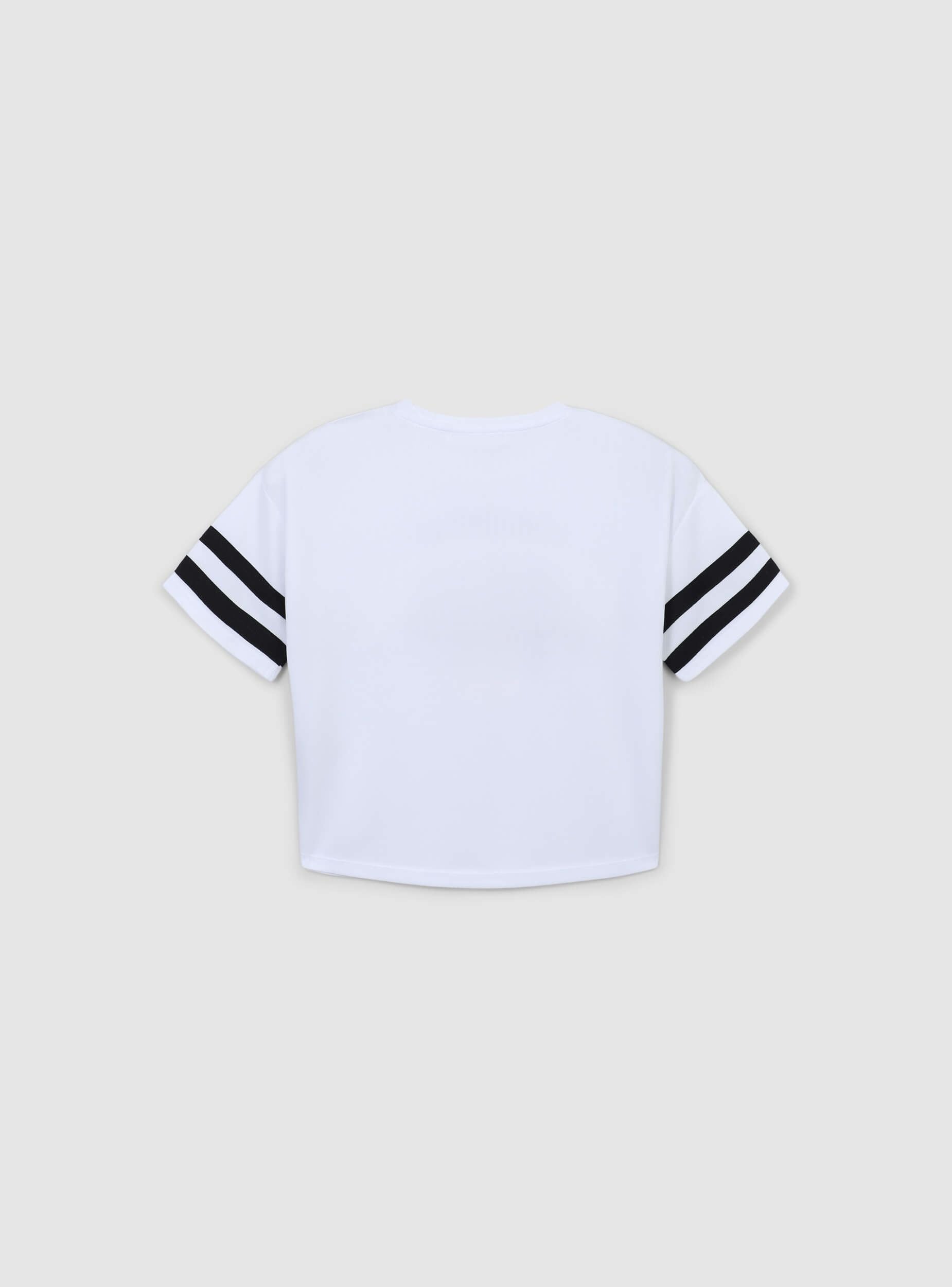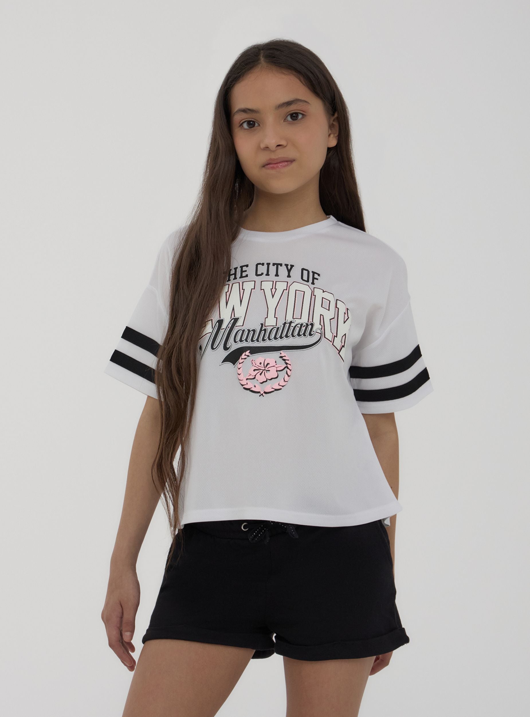Majica za djevojčice idealna za ležeran i dinamičan izgled, savršena za slobodno vrijeme. Karakterizirana regularnim krojem, ima print s natpisima sprijeda i detalje s trakama na kratkim rukavima. Svestran i moderan komad, prikladan za različite neformalne prilike.Detalji