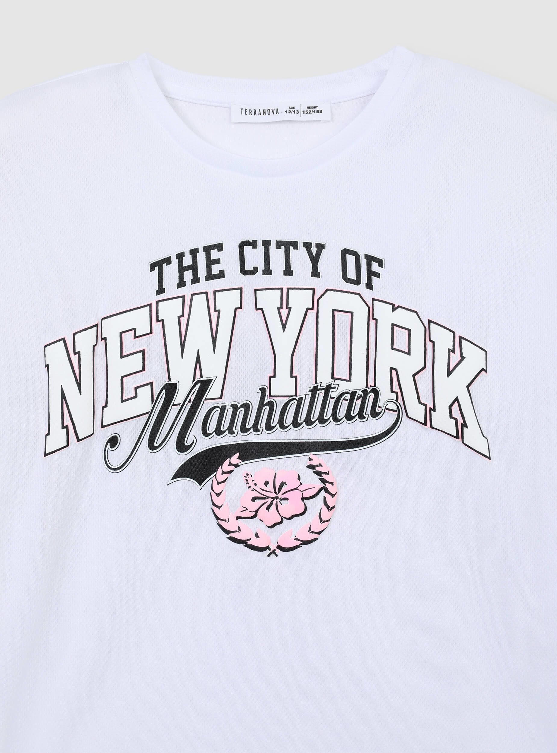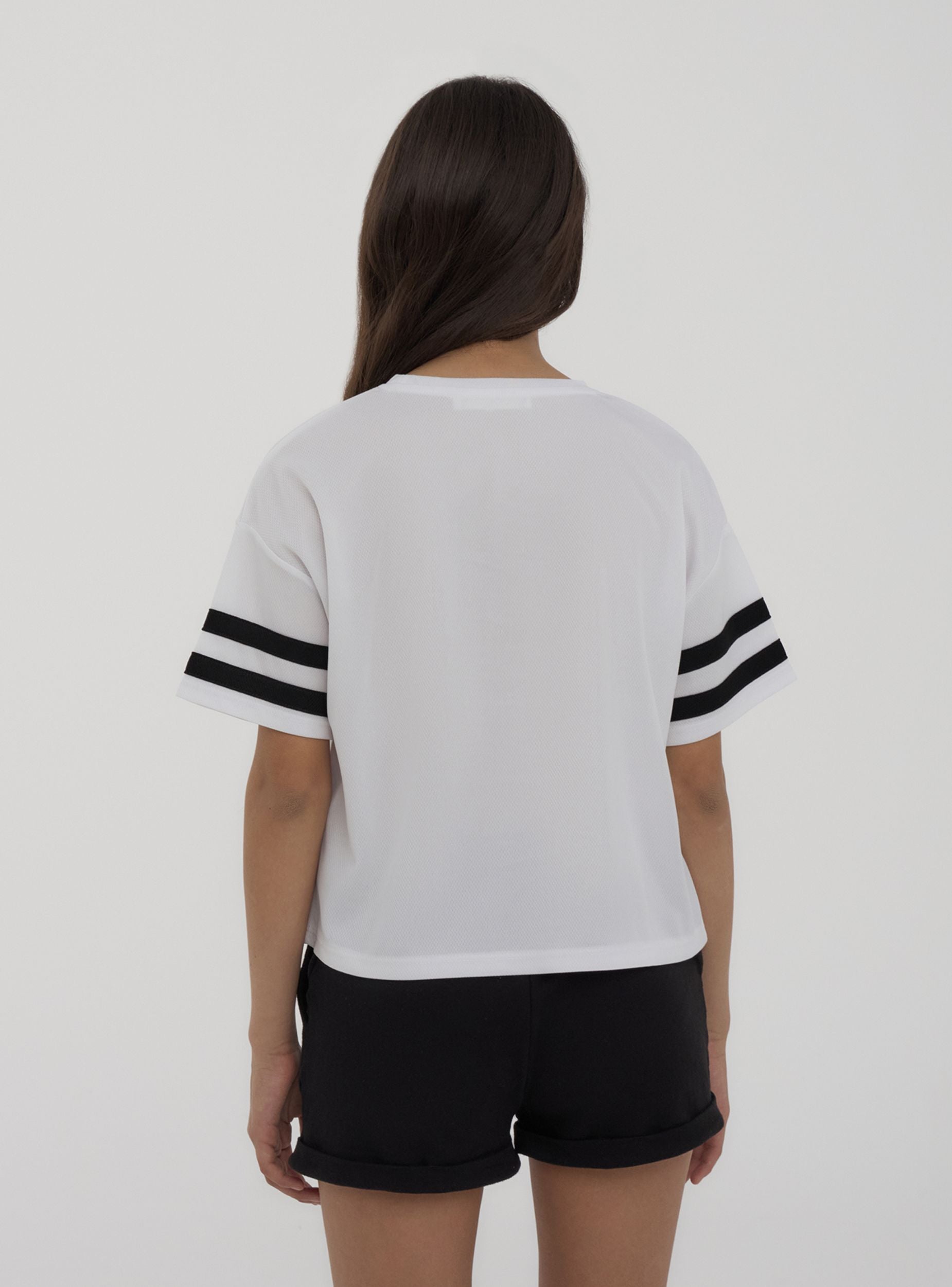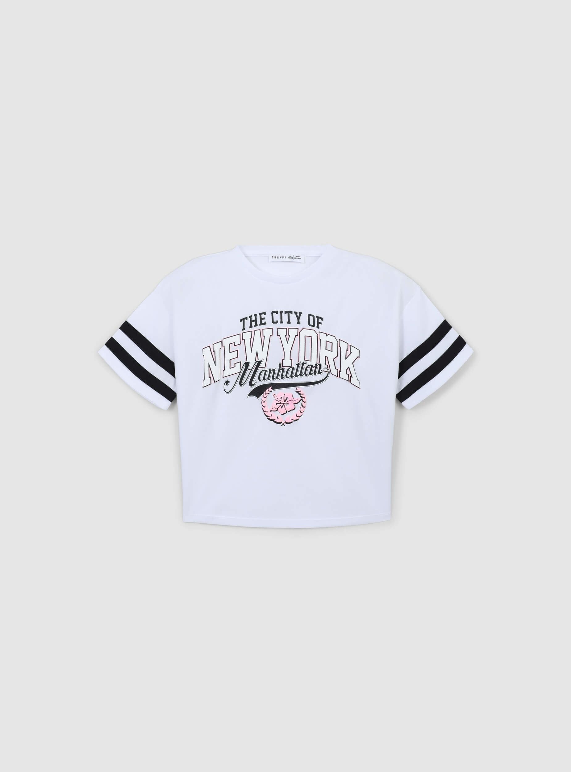 Majica za djevojčice idealna za ležeran i dinamičan izgled, savršena za slobodno vrijeme. Karakterizirana regularnim krojem, ima print s natpisima sprijeda i detalje s trakama na kratkim rukavima. Svestran i moderan komad, prikladan za različite neformalne prilike.Detalji