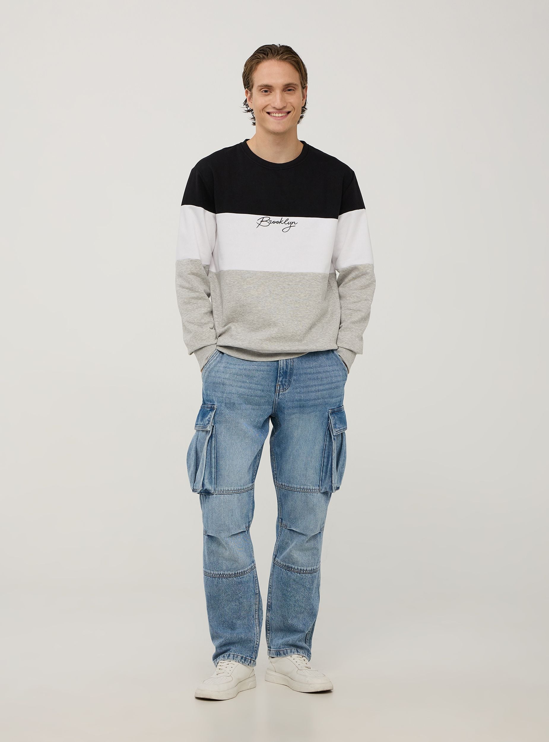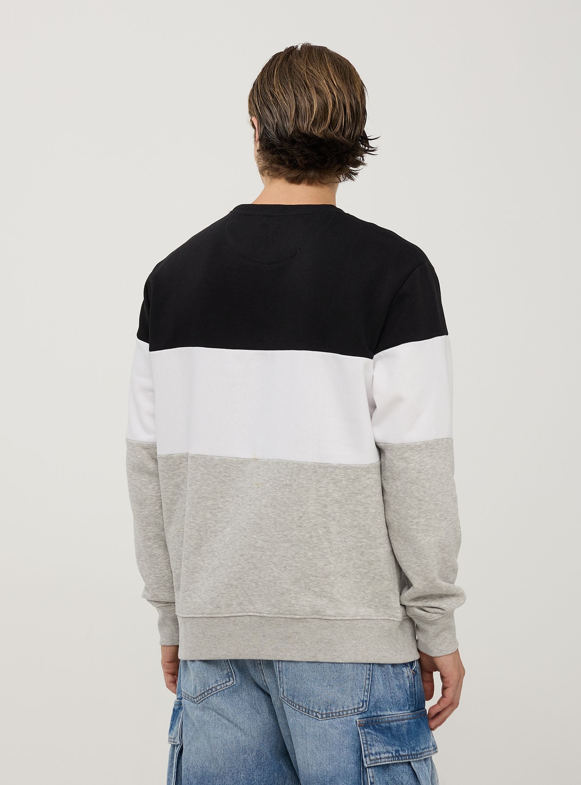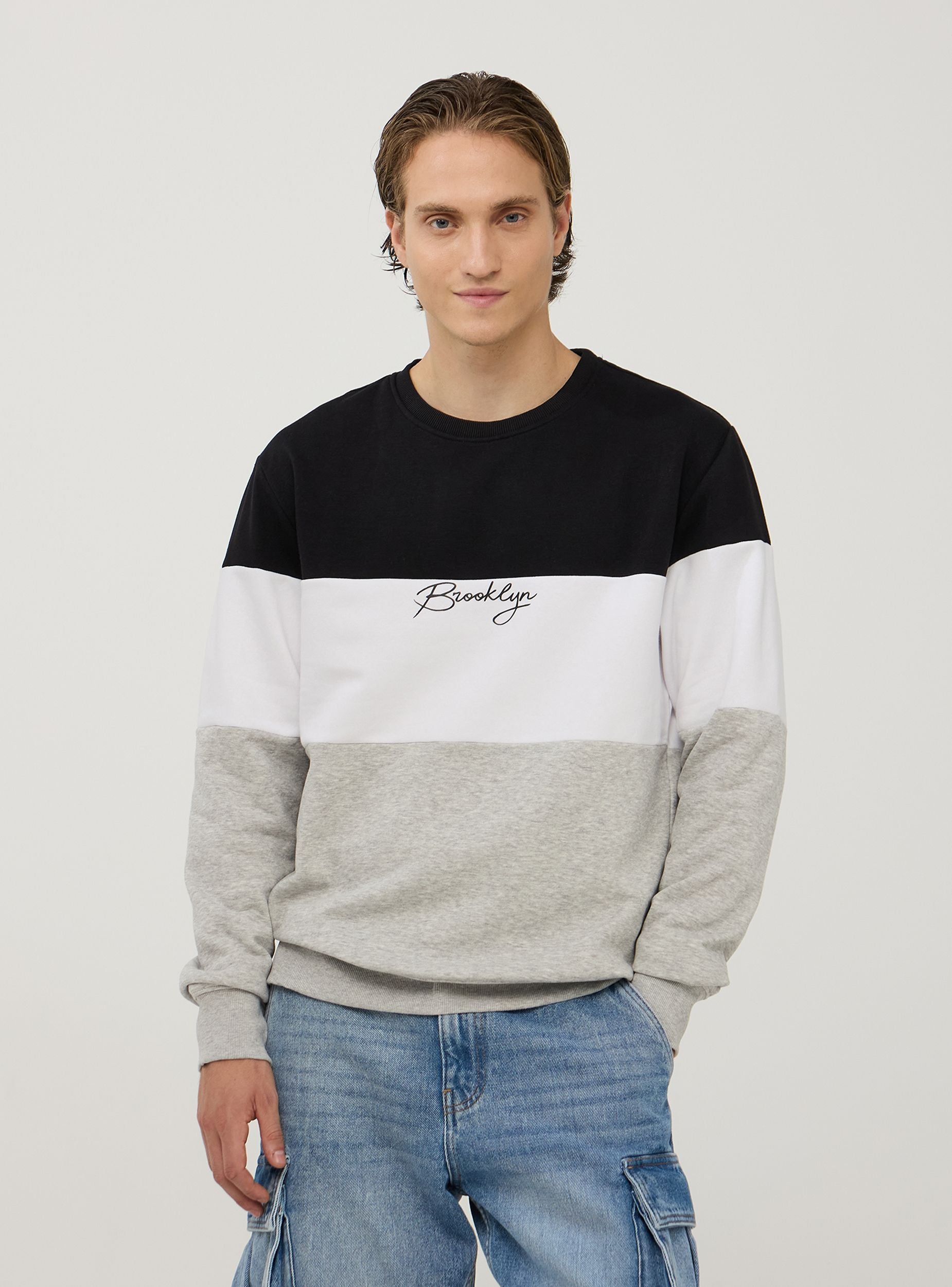 Muška dukserica s dugim rukavima bez kapuljače, ukrašena s prednjim printom. Dizajn u tri boje koji daje moderni i sportski izgled odjeći. Ova dukserica je idealna za one koji traže ležeran i moderan izgled, savršena za slobodno vrijeme i izlaske s prijateljima. Također je optimalan izbor za opuštanje kod kuće, zahvaljujući svom udobnom kroju i mekom materijalu. Upari je s trapericama ili sportskim hlačama za svestran i trendi outfit.