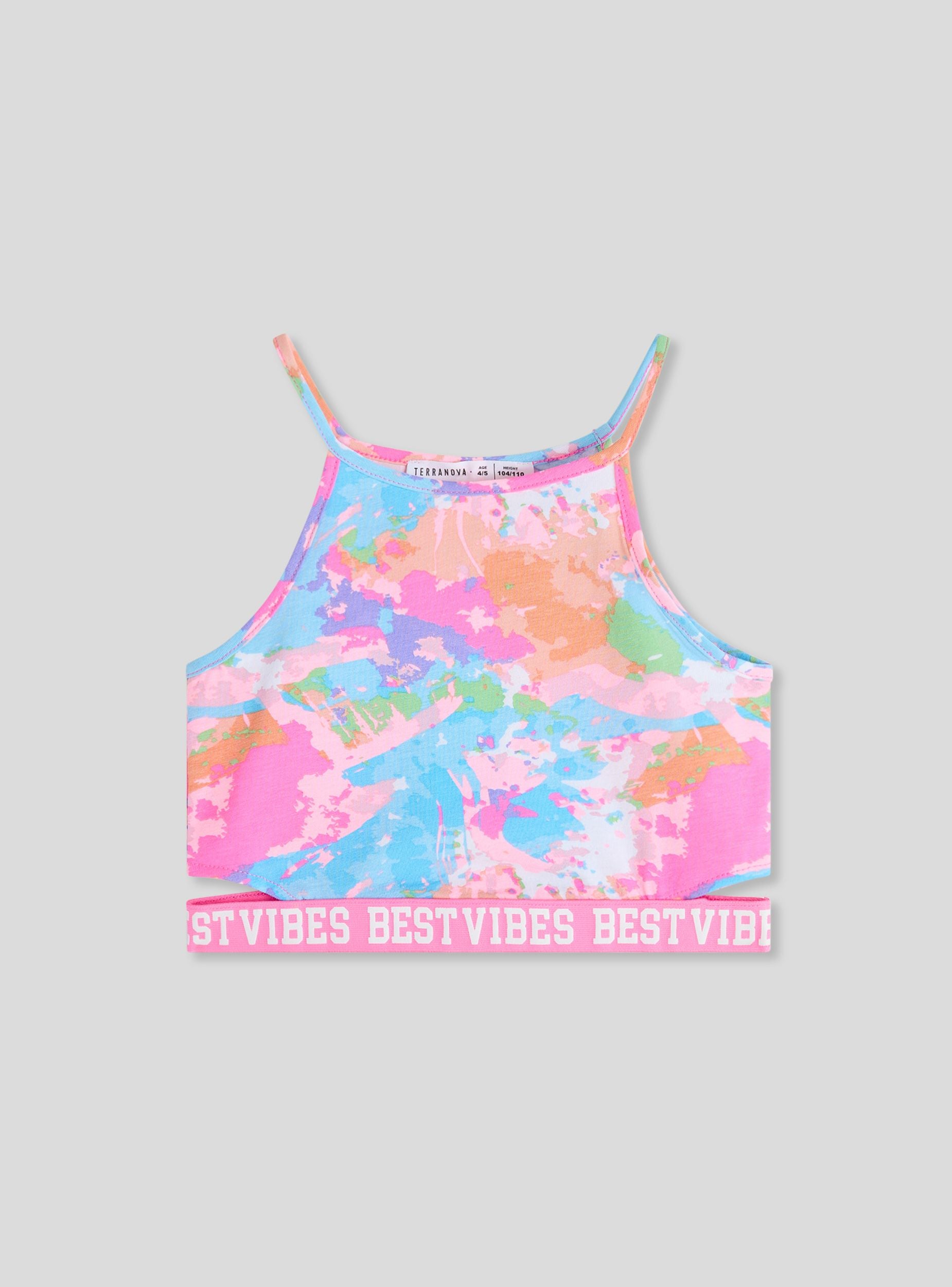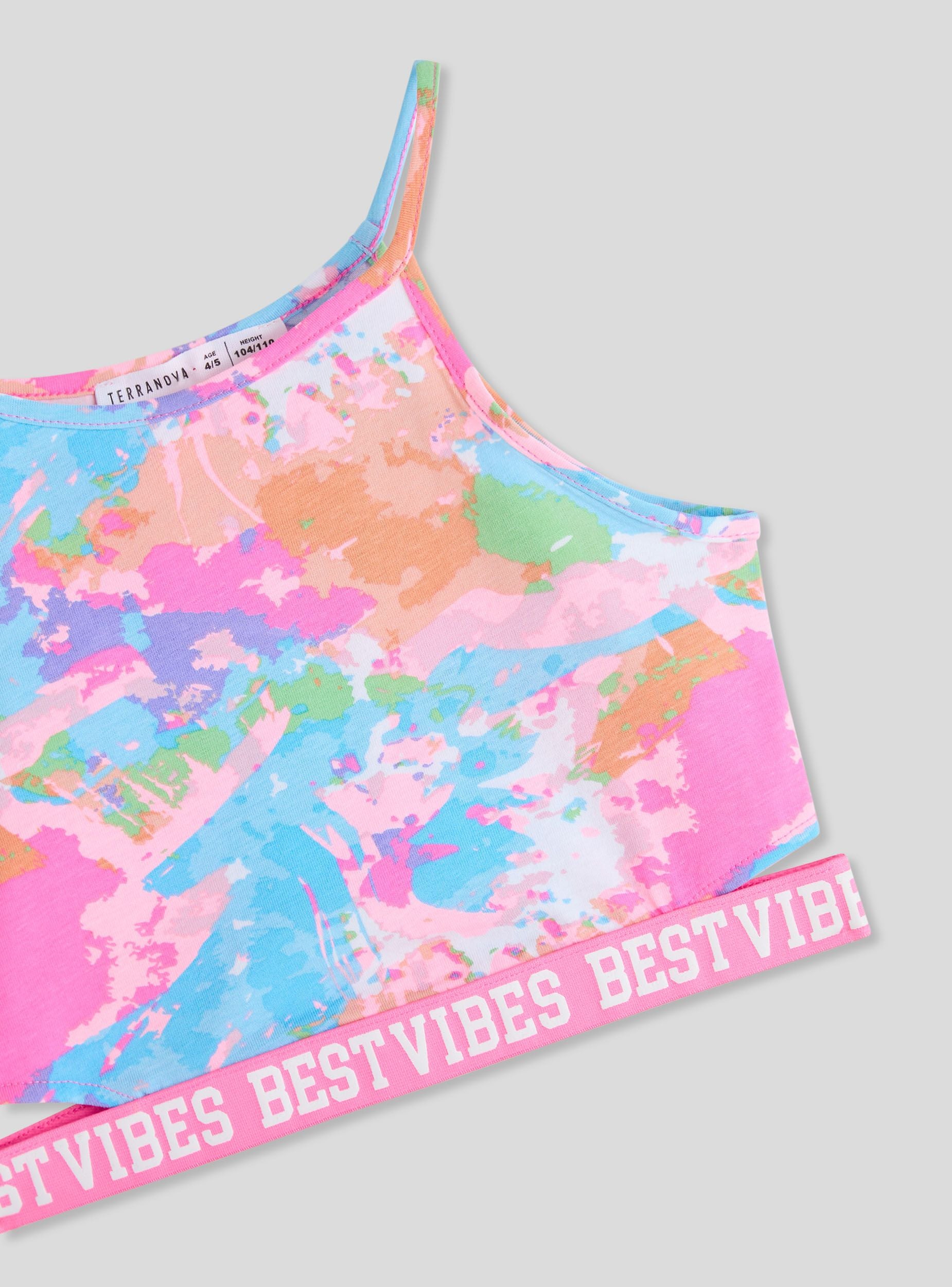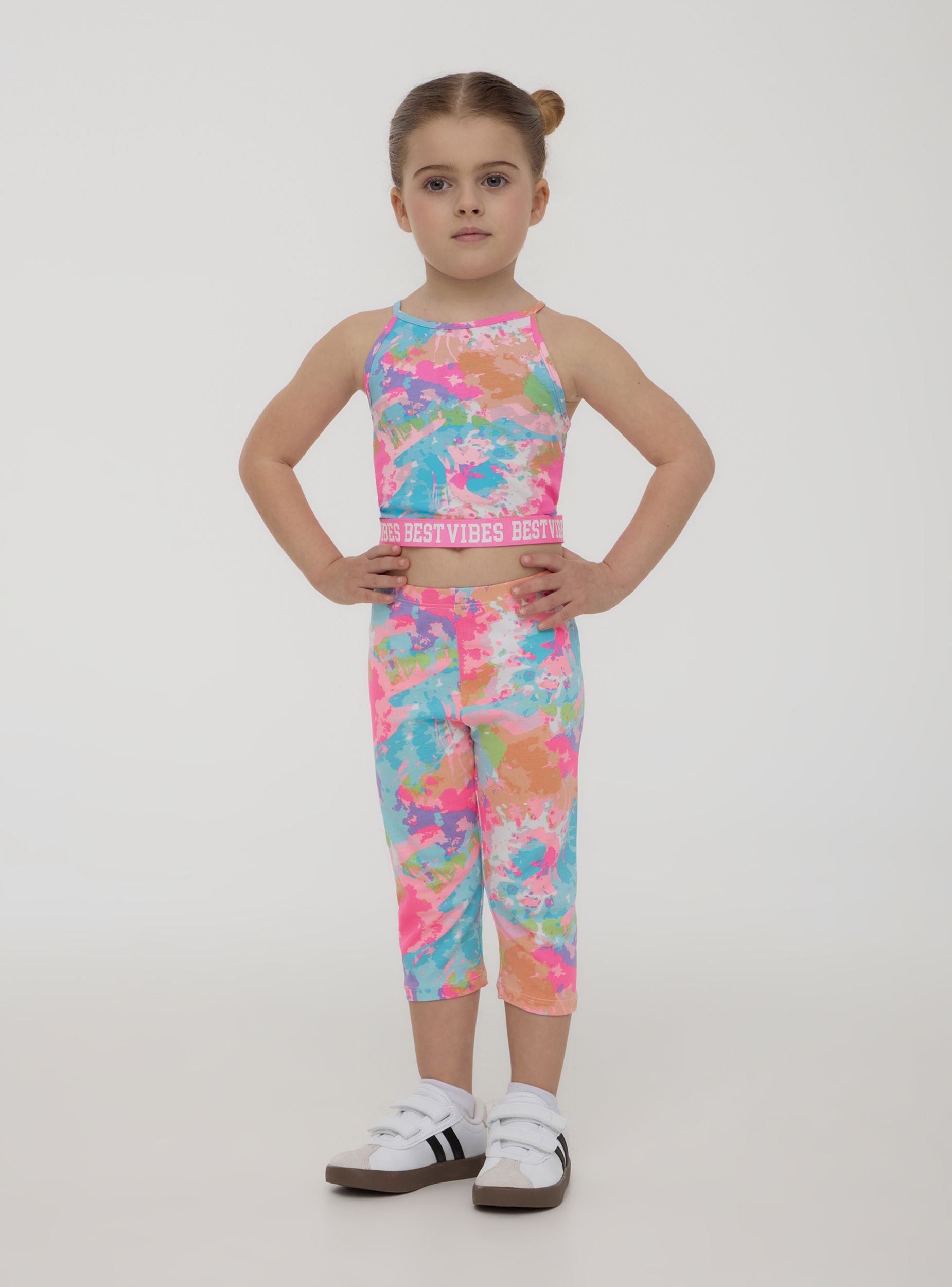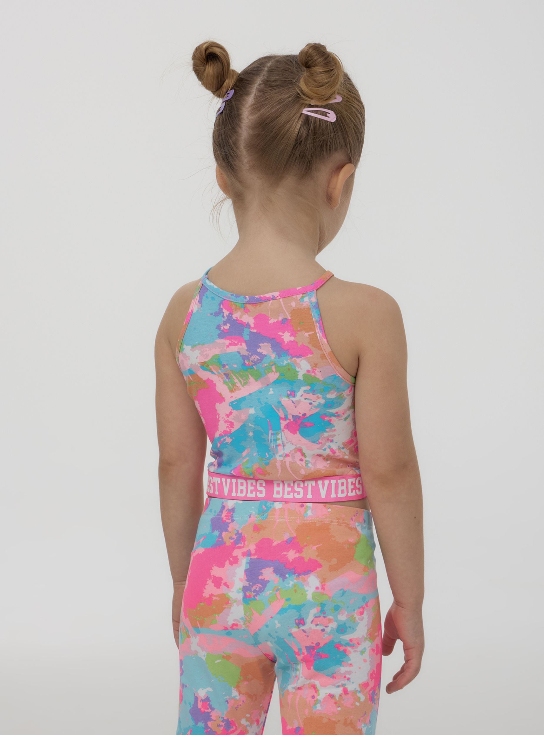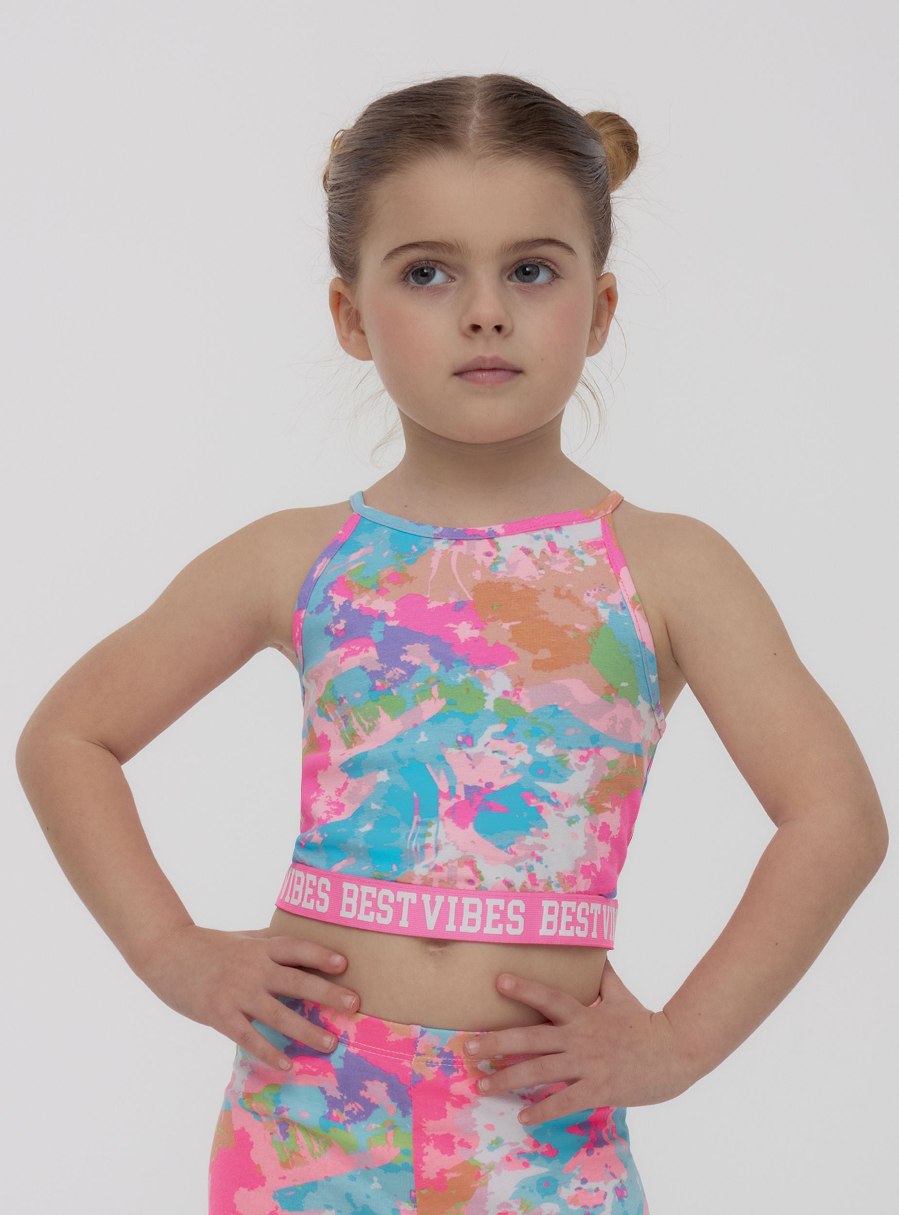 Crop top za djevojčice živahnog i modernog stila, karakteriziran višebojnim efektom koji donosi energiju i veselje. Savršen za ljeto, lako se kombinira s kratkim hlačama, suknjama ili tajicama za dinamičan i moderan izgled. Idealno za slobodno vrijeme, dane na plaži ili aktivnosti na otvorenom, jamči udobnost i slobodu kretanja s daškom trendi stila.Detalji