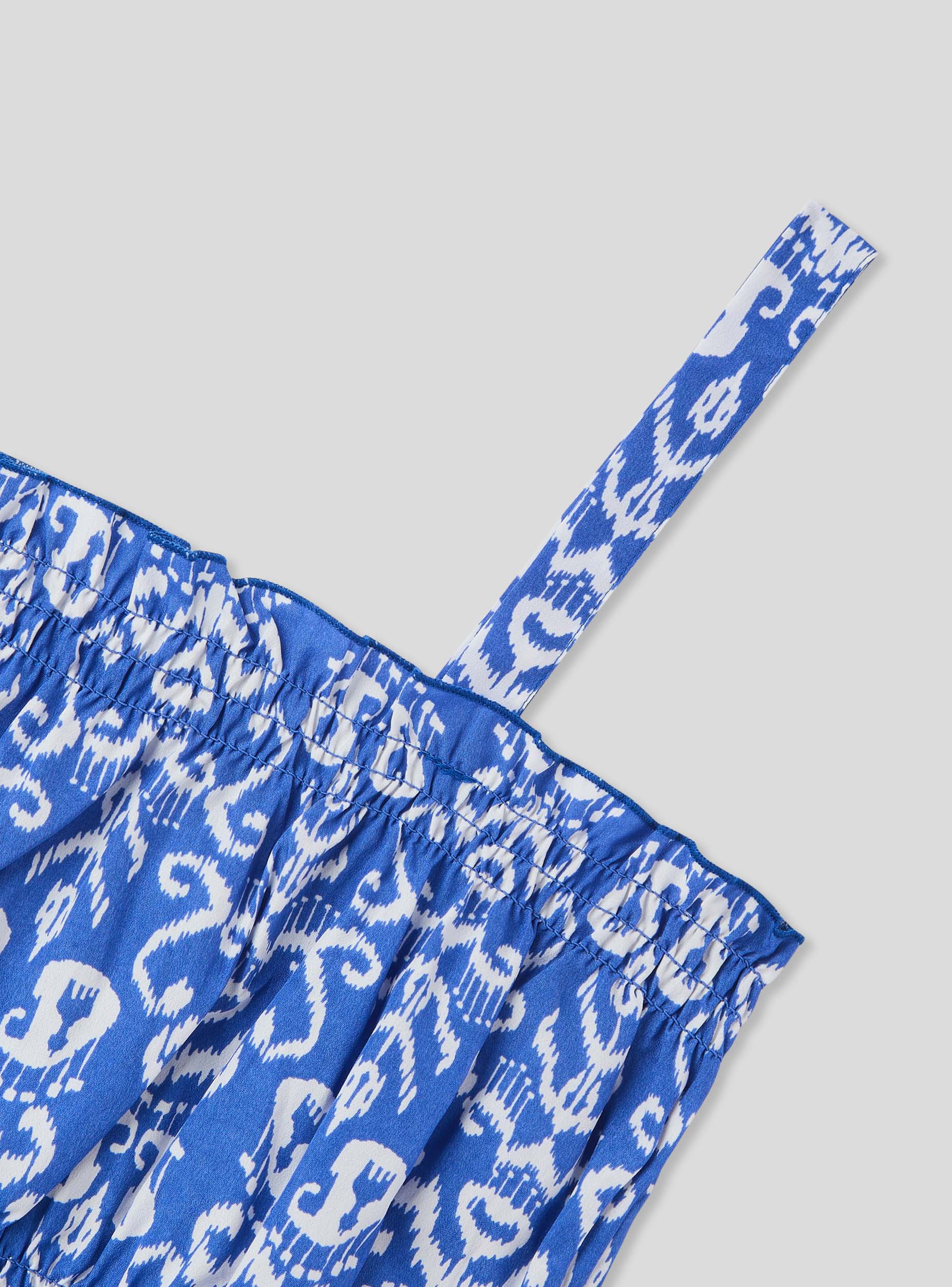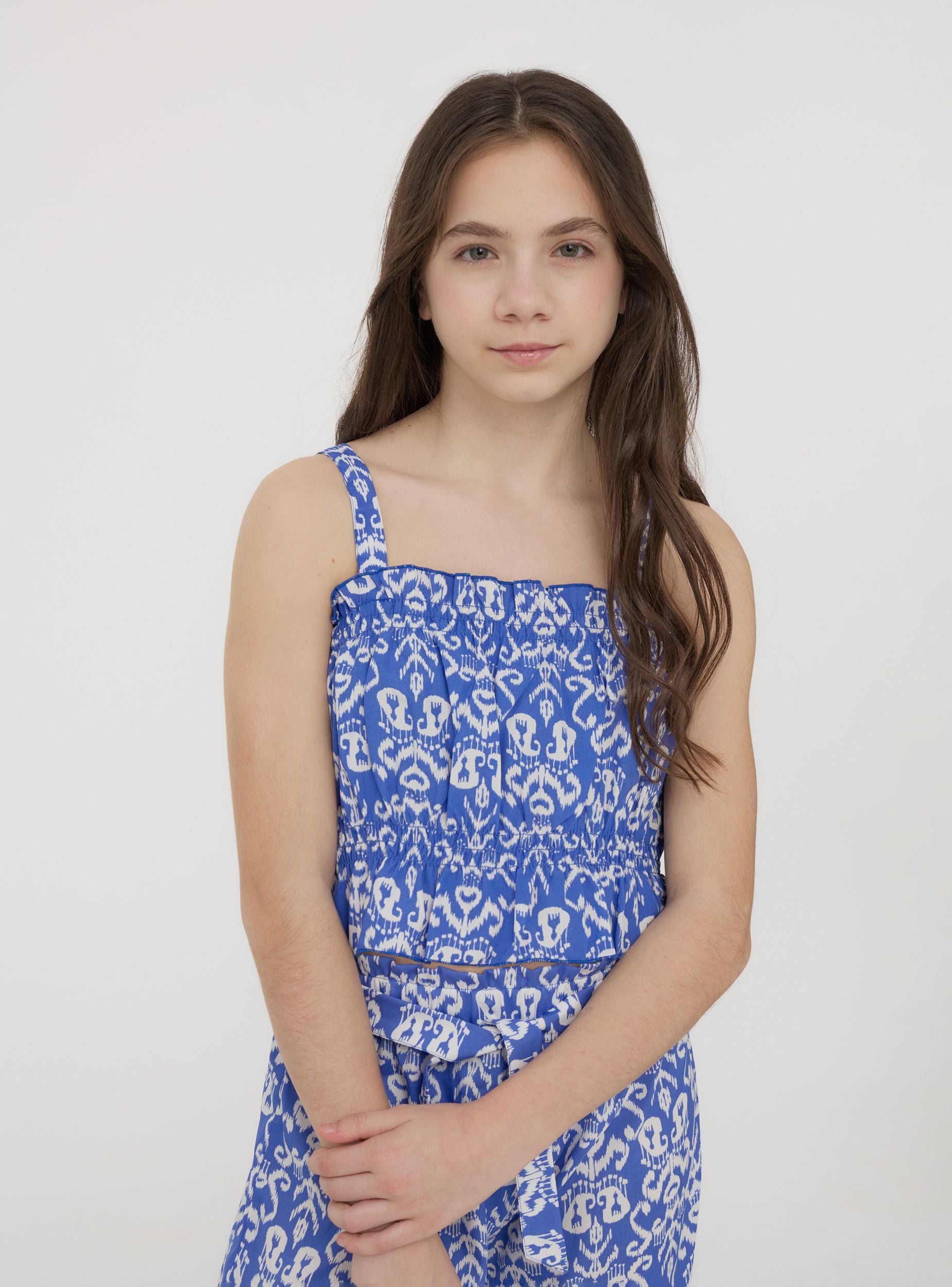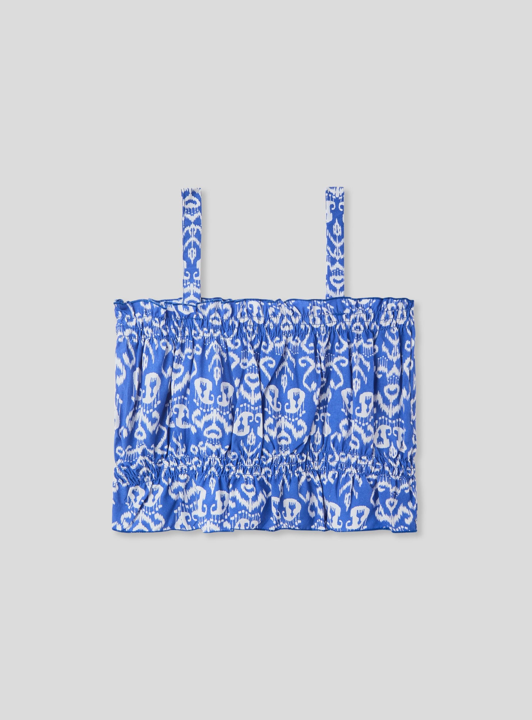 Top za djevojčicu s kratkim krojem, obogaćen živopisnim etničkim uzorkom koji daje originalan i moderan dodir. Tanke naramenice i lagani dizajn čine ga idealnim za ljetne dane, osiguravajući udobnost i slobodu kretanja. Savršeno se može kombinirati s suknjama ili hlačicama, za svjež i energičan izgled. Komad koji spaja stil i praktičnost za svaku priliku.Detalji