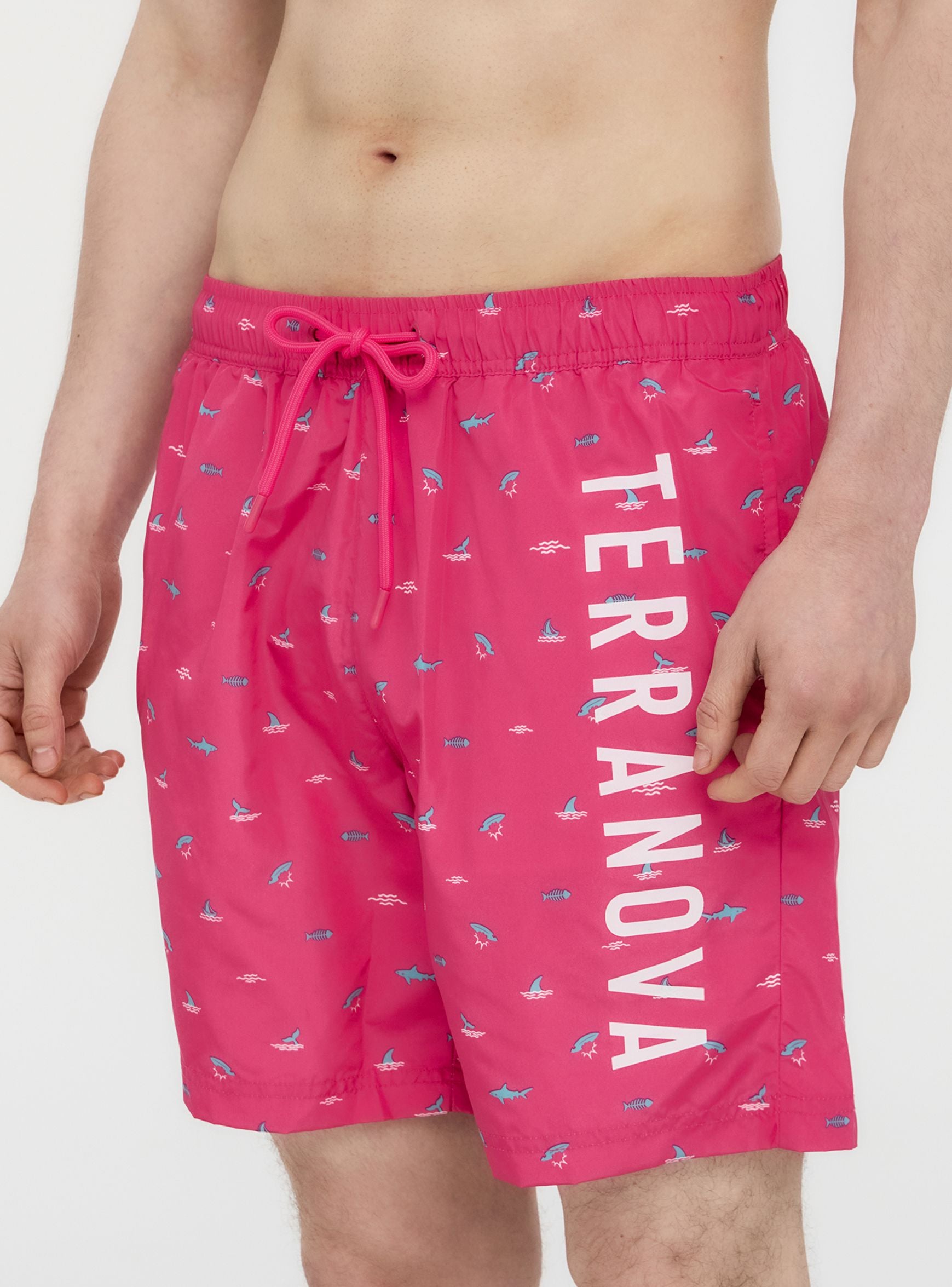 Bermuda mare da uomo con fantasia a tema marino e scritta logo a contrasto. Dotato di tasche laterali e coulisse regolabile, è perfetto da abbinare a t-shirt tinta unita e infradito per un look estivo e dinamico.Dettagli