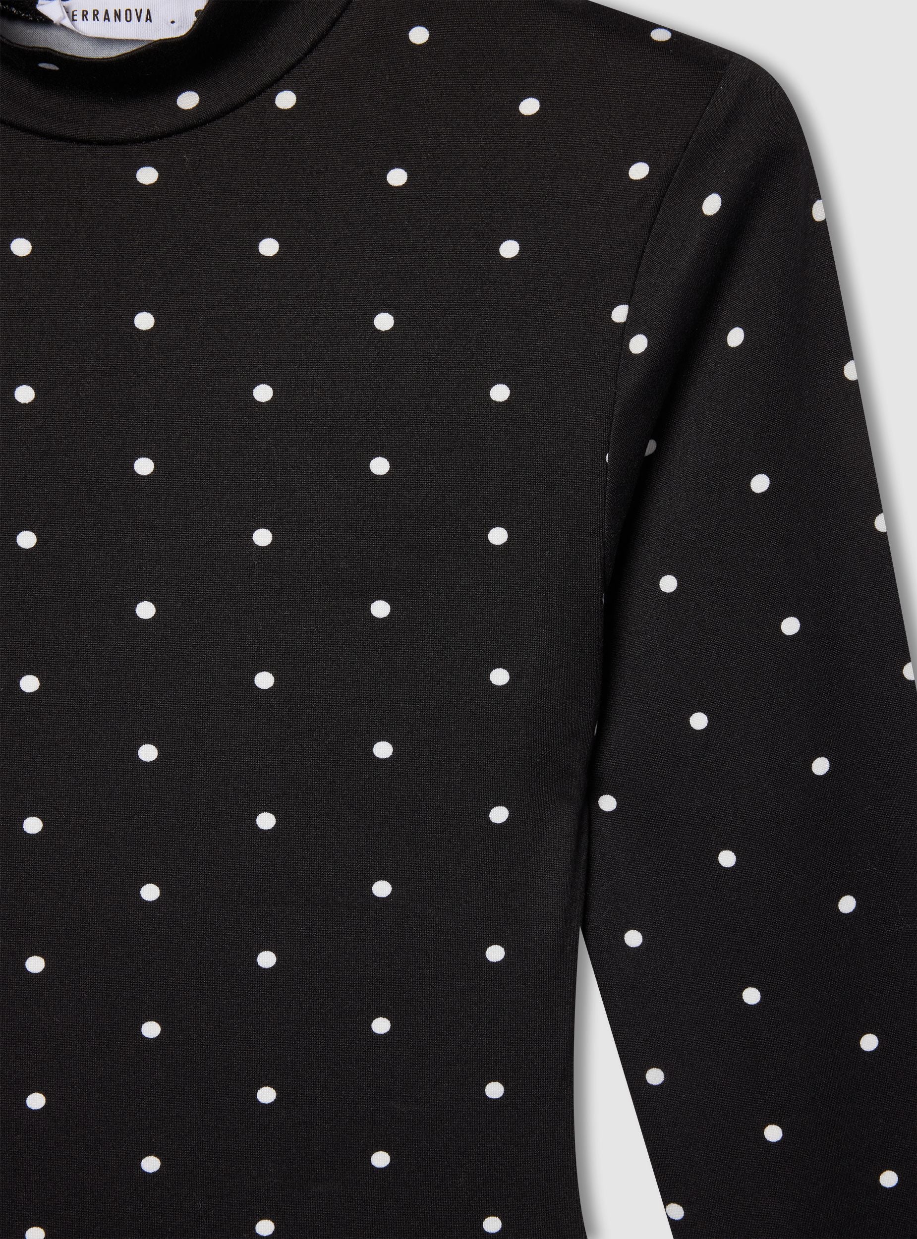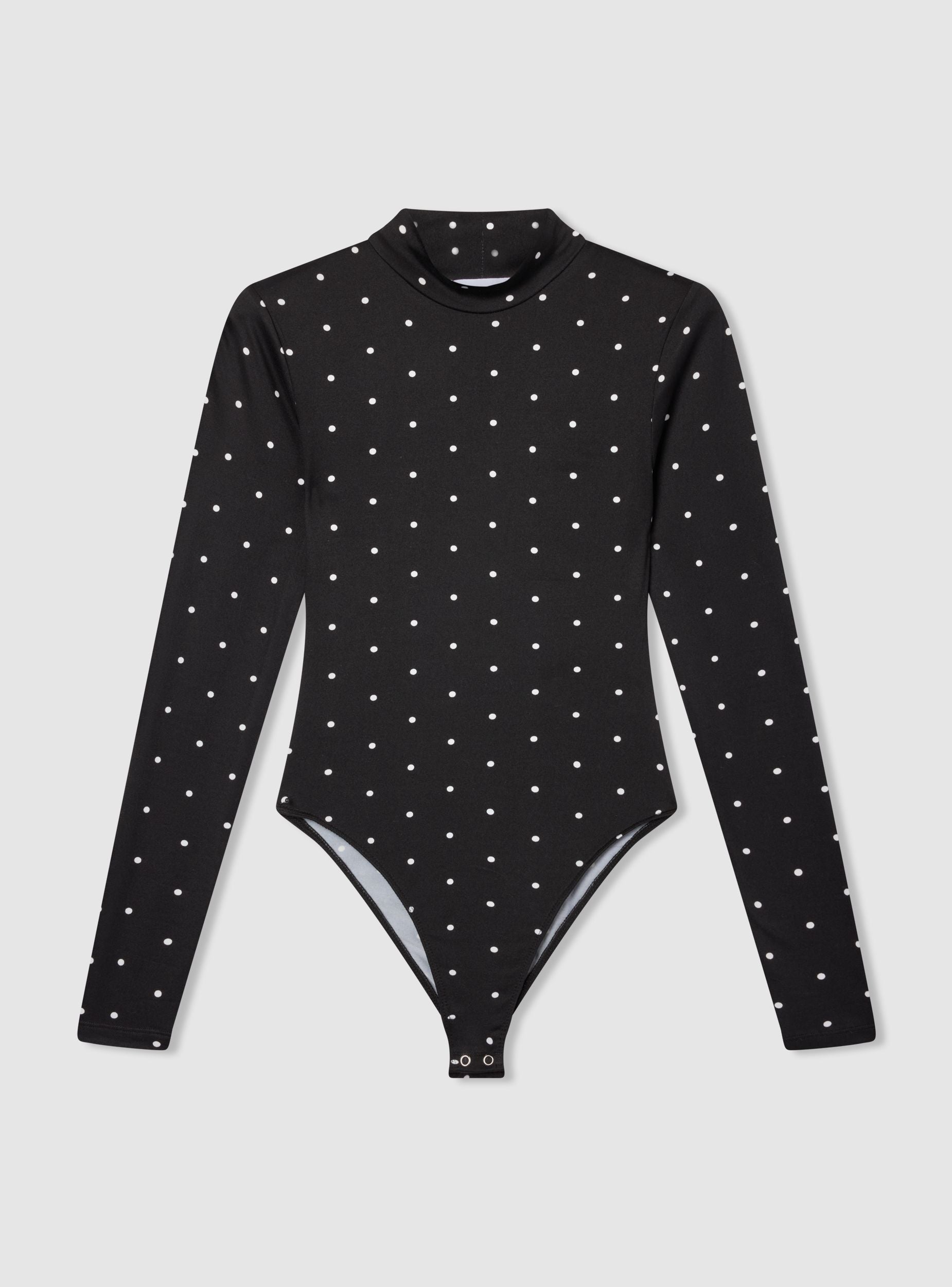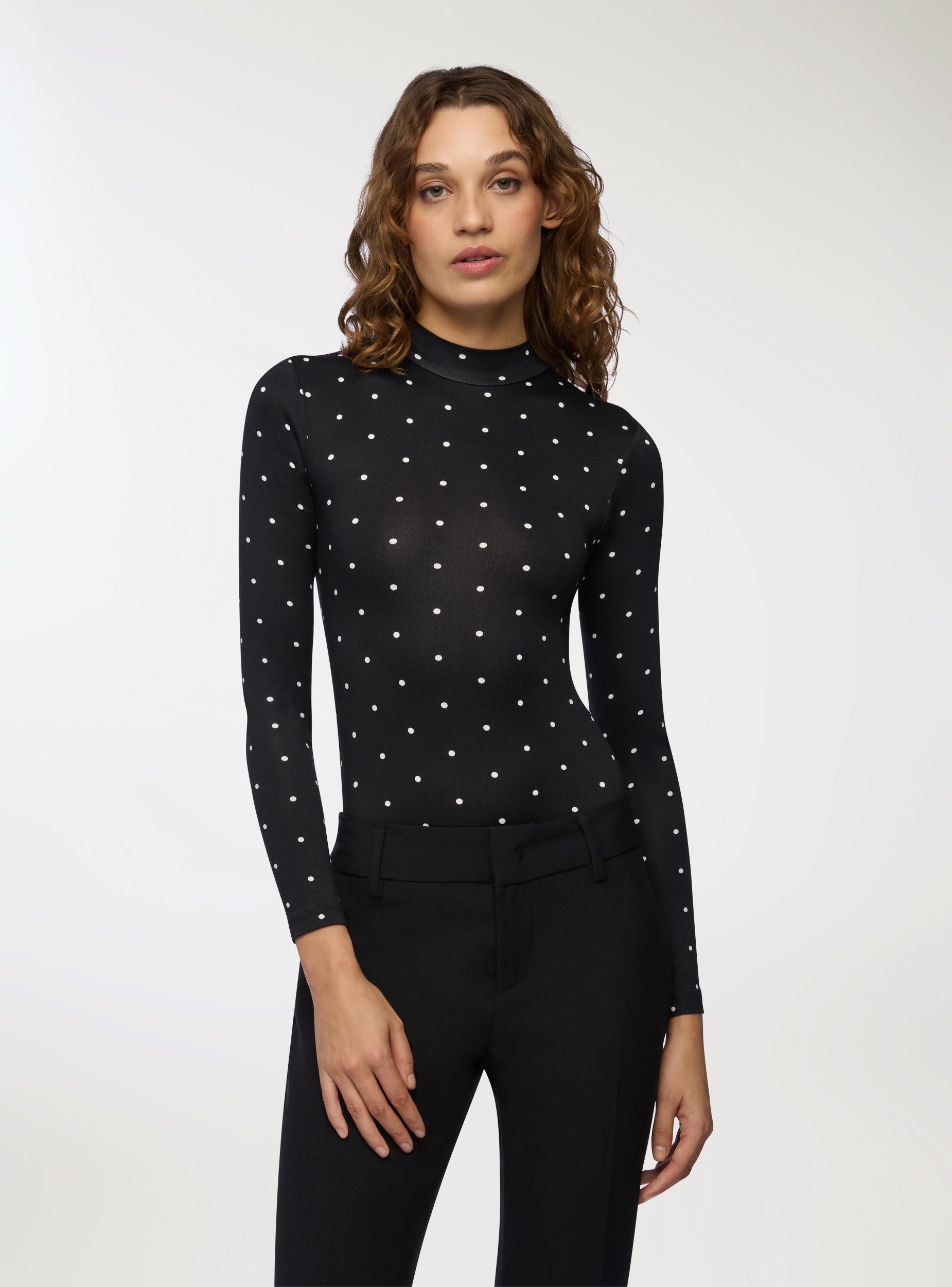 Tessuto caldo. Body da donna a manica lunga con fantasia a pois. Presenta un design aderente che valorizza la silhouette, ideale per outfit casual o eleganti. Il collo alto aggiunge un tocco di raffinatezza, mentre la chiusura a bottoni sul fondo garantisce praticitá. Perfetta da abbinare a pantaloni o gonne per un look versatile e moderno.