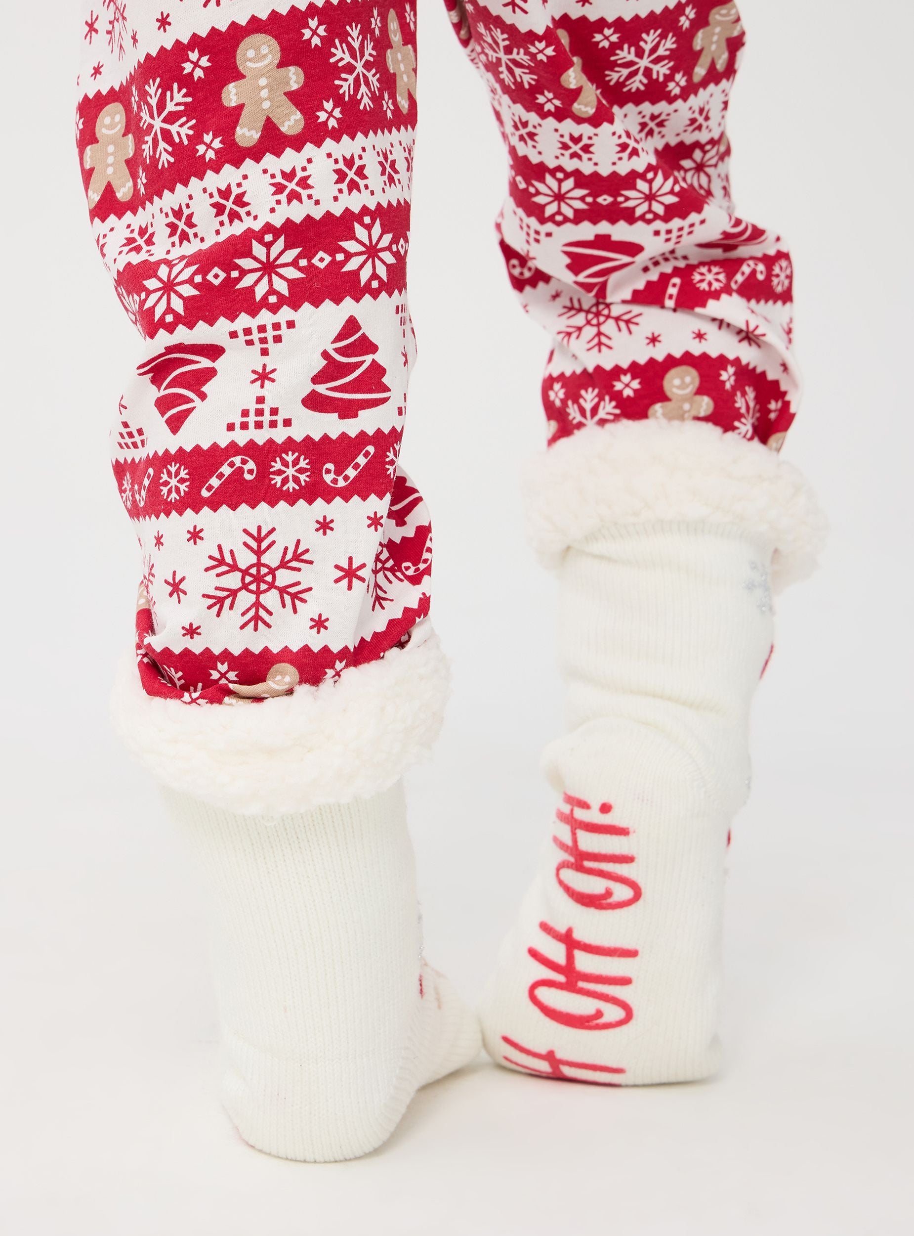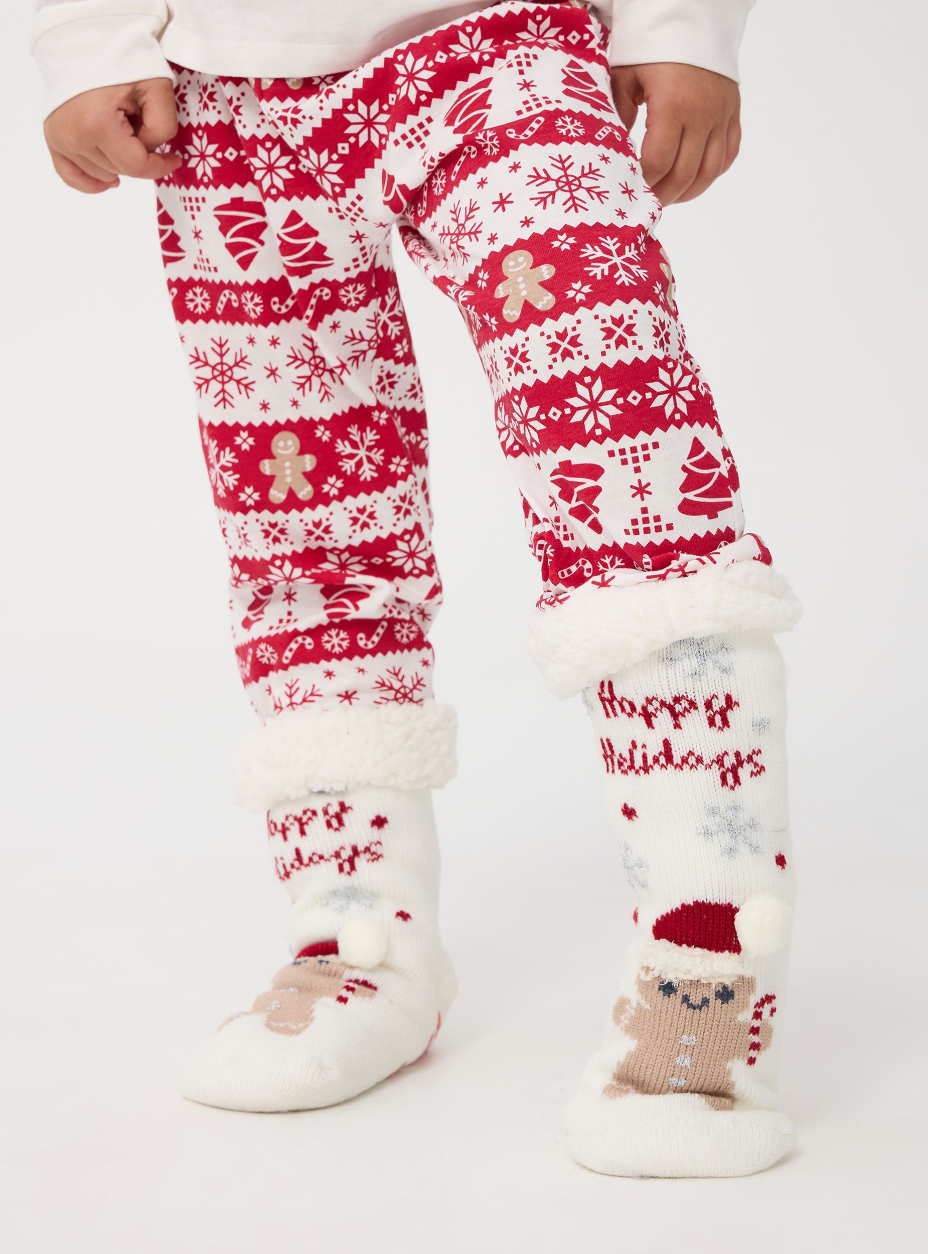 Calzettoni da bimba con motivo natalizio raffigurante un omino di pan di zenzero con cappello di Babbo Natale e la scritta "Holidays". Con la scritta "OH OH OH" sulla suola in silicone per un effetto antiscivolo. Sono foderati in morbido sherpa ideale per mantenere i piedi caldi e comodi durante il periodo festivo.Dettagli