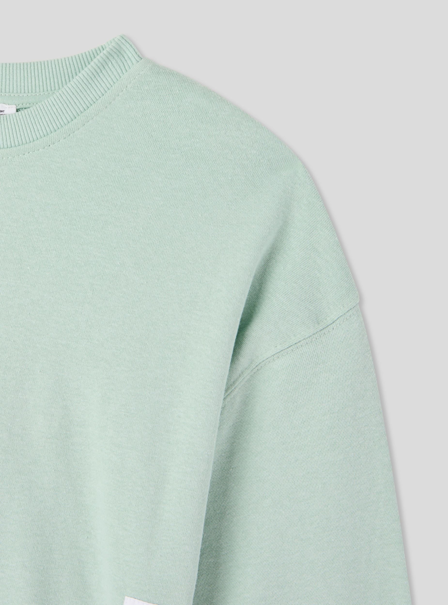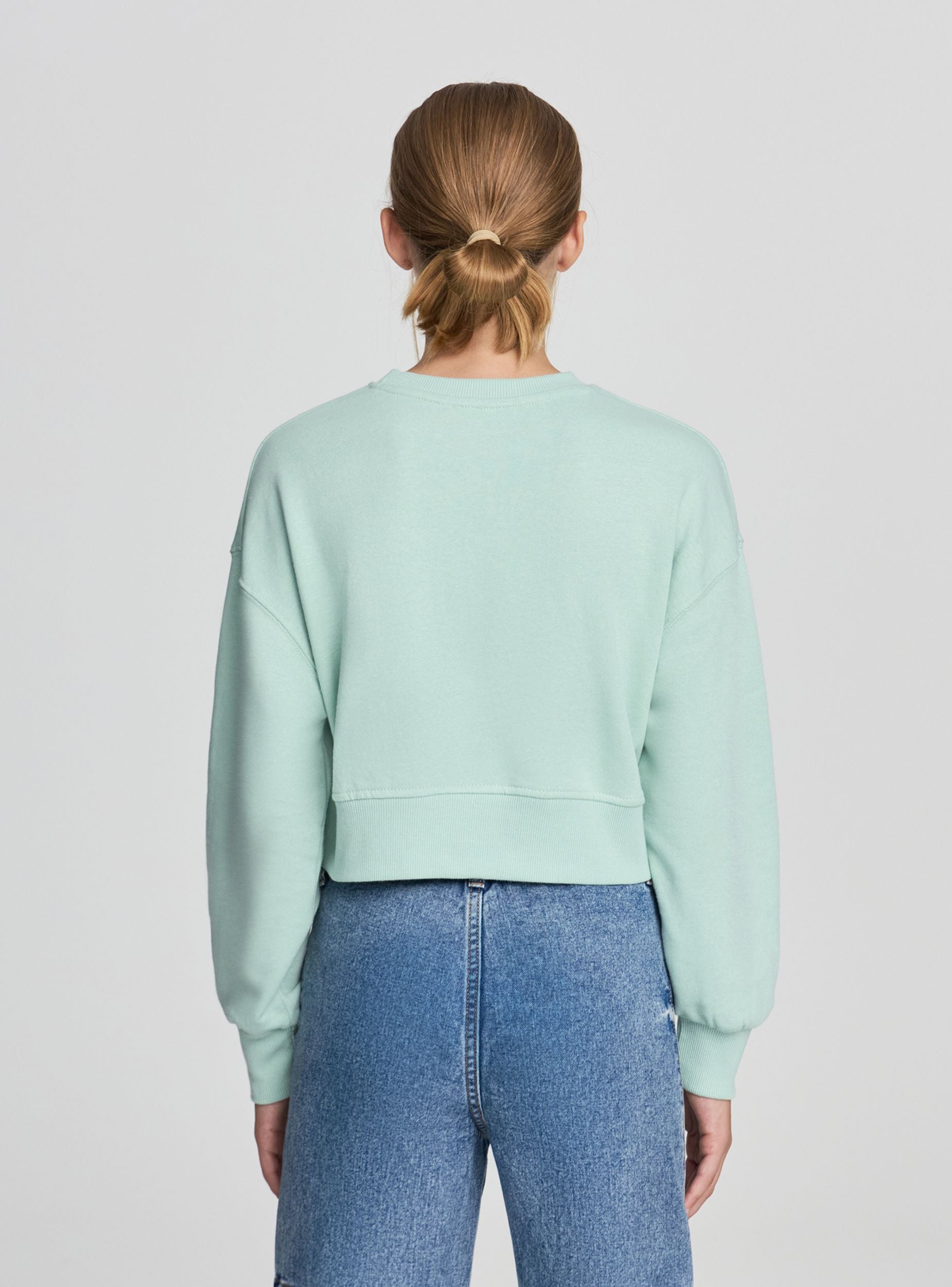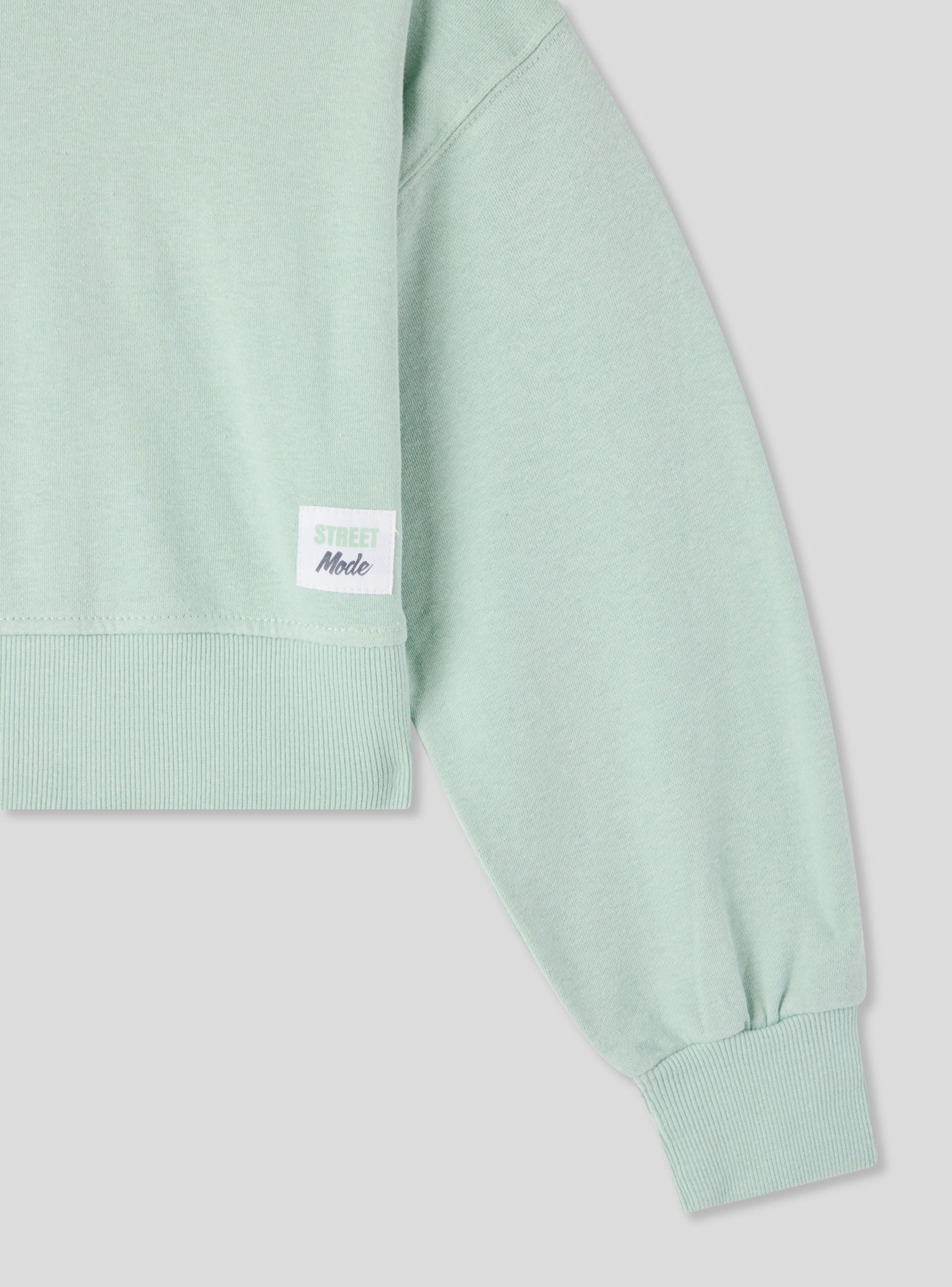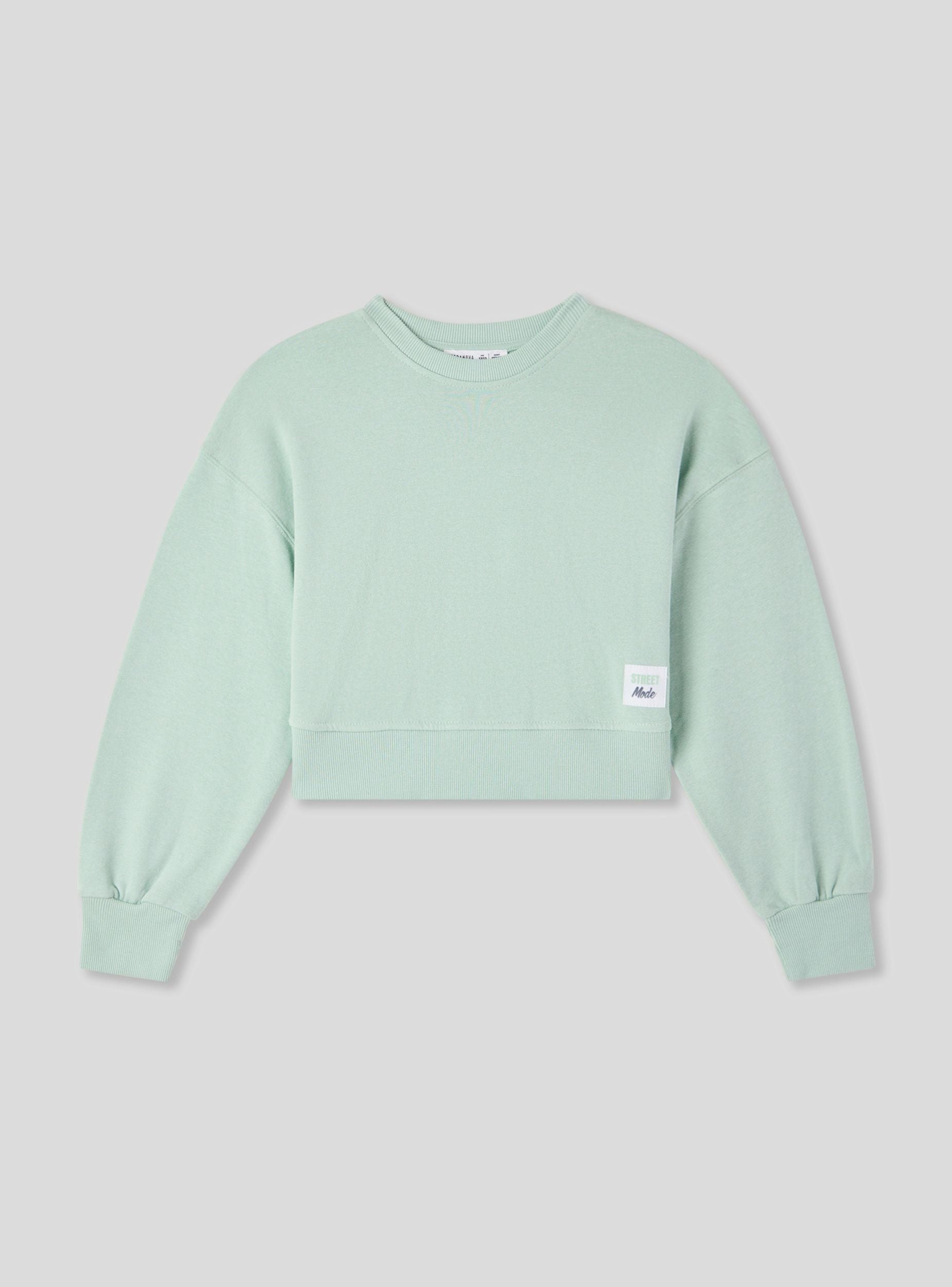 Felpa leggera da bambina dal taglio crop, ideale per un look casual e versatile. Il modello presenta maniche lunghe con polsini elasticizzati, girocollo a costine, senza cappuccio e senza zip offre comfort e libertà di movimento. La scritta applicata sul fondo aggiunge un tocco moderno e distintivo, perfetta da abbinare a jeans o pantaloni sportivi per la scuola o il tempo libero.