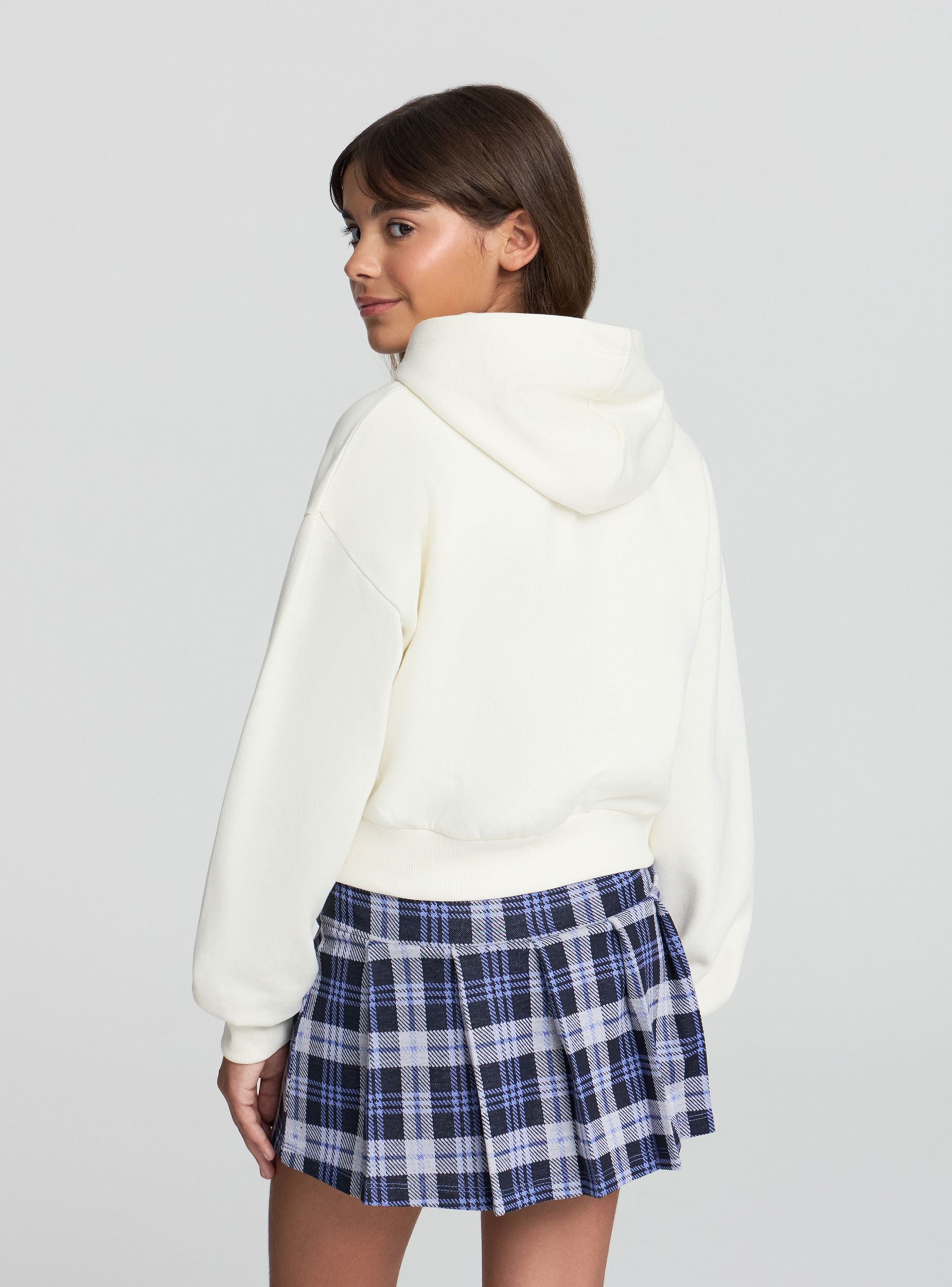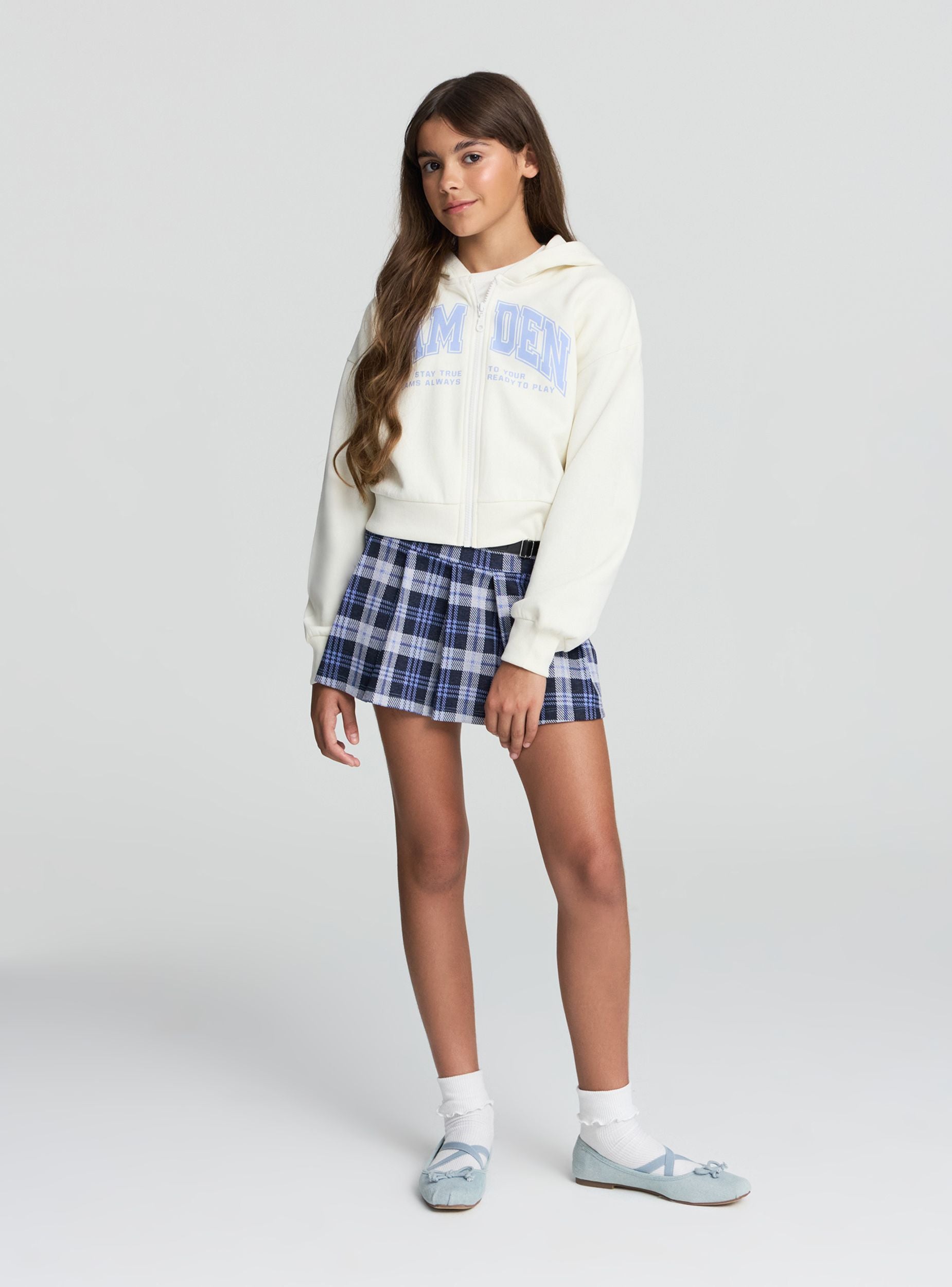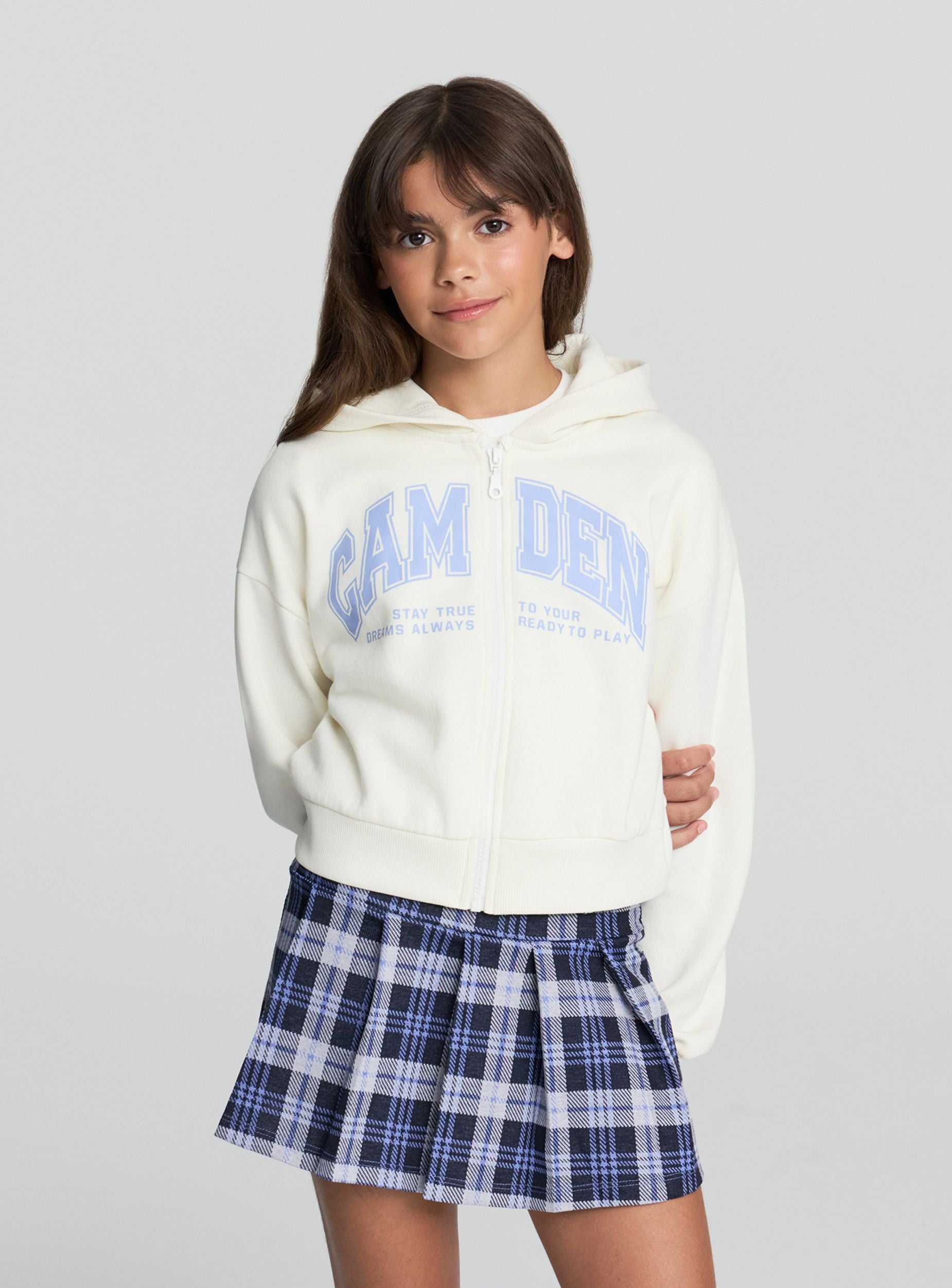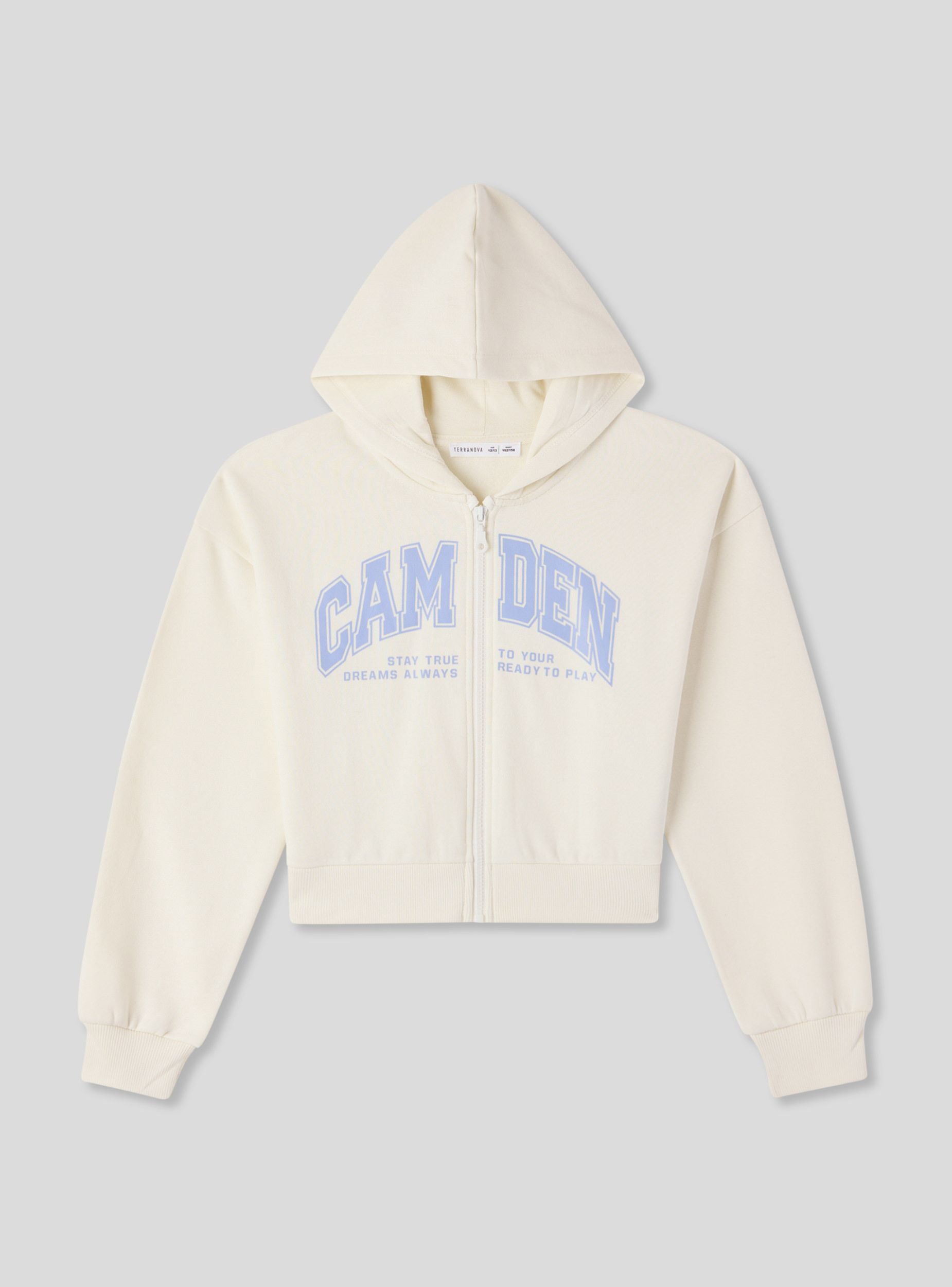Felpa pesante da bambina con cappuccio, caratterizzata da una vestibilità crop e chiusura con zip frontale. Il design presenta una stampa in stile college americano sul davanti, ideale per aggiungere un tocco trendy ai look quotidiani. Le maniche lunghe e i polsini elasticizzati assicurano comfort e praticità, perfetta da abbinare a jeans o pantaloni sportivi per il tempo libero o la scuola.