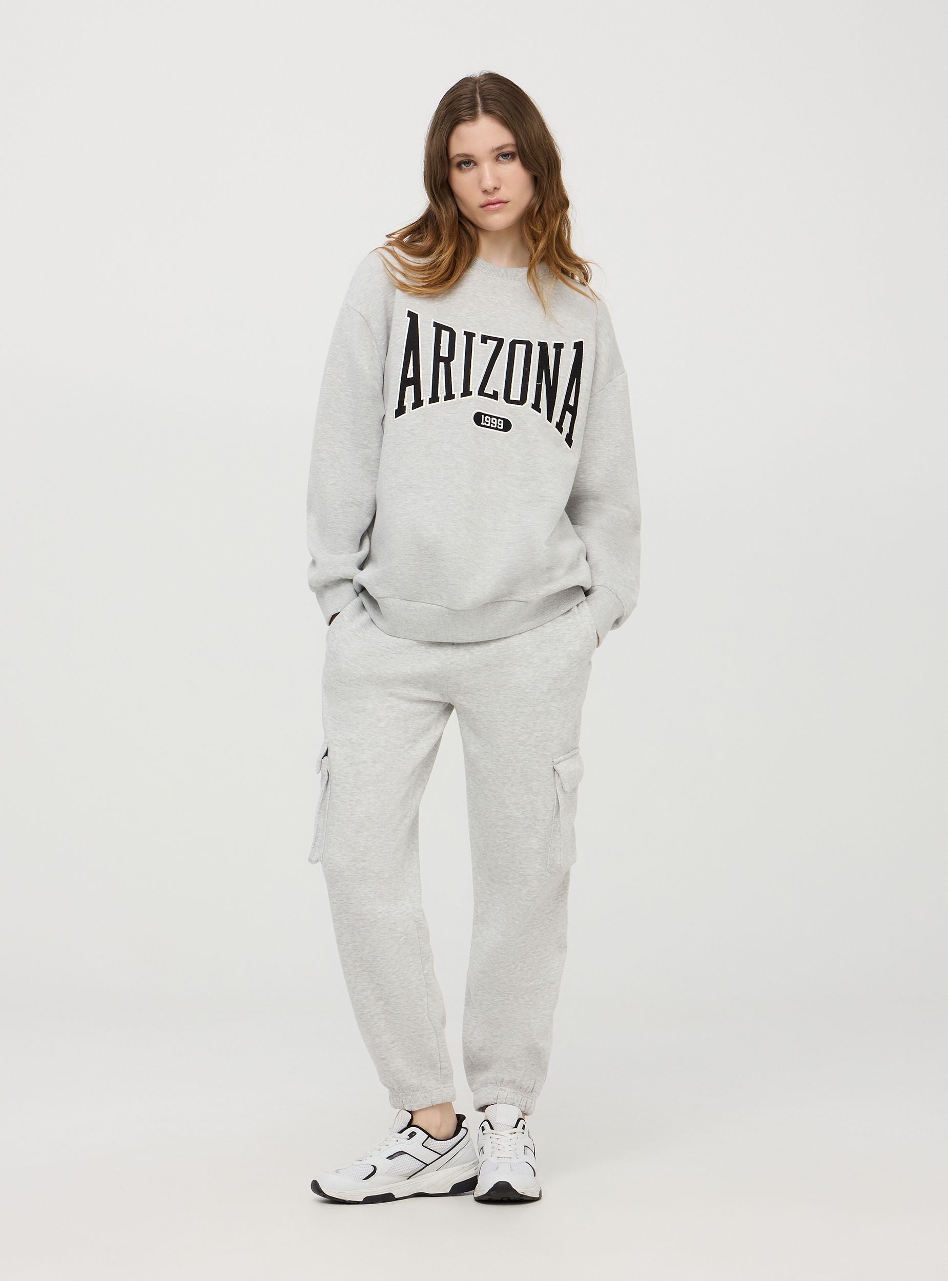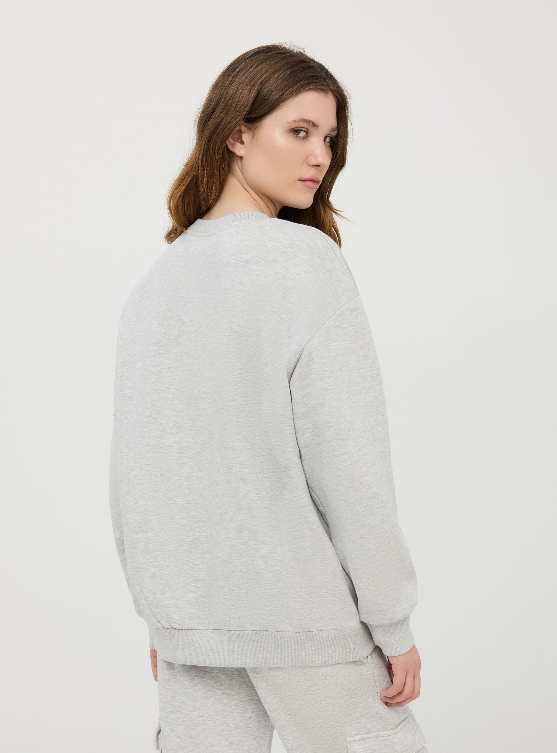 Felpa da donna, modello chiuso senza cappuccio, in tessuto pesante a tinta unita con patch ricamati in stile college. Perfetta per un outfit casual e comodo. Vestibilità ampia.Dettagli