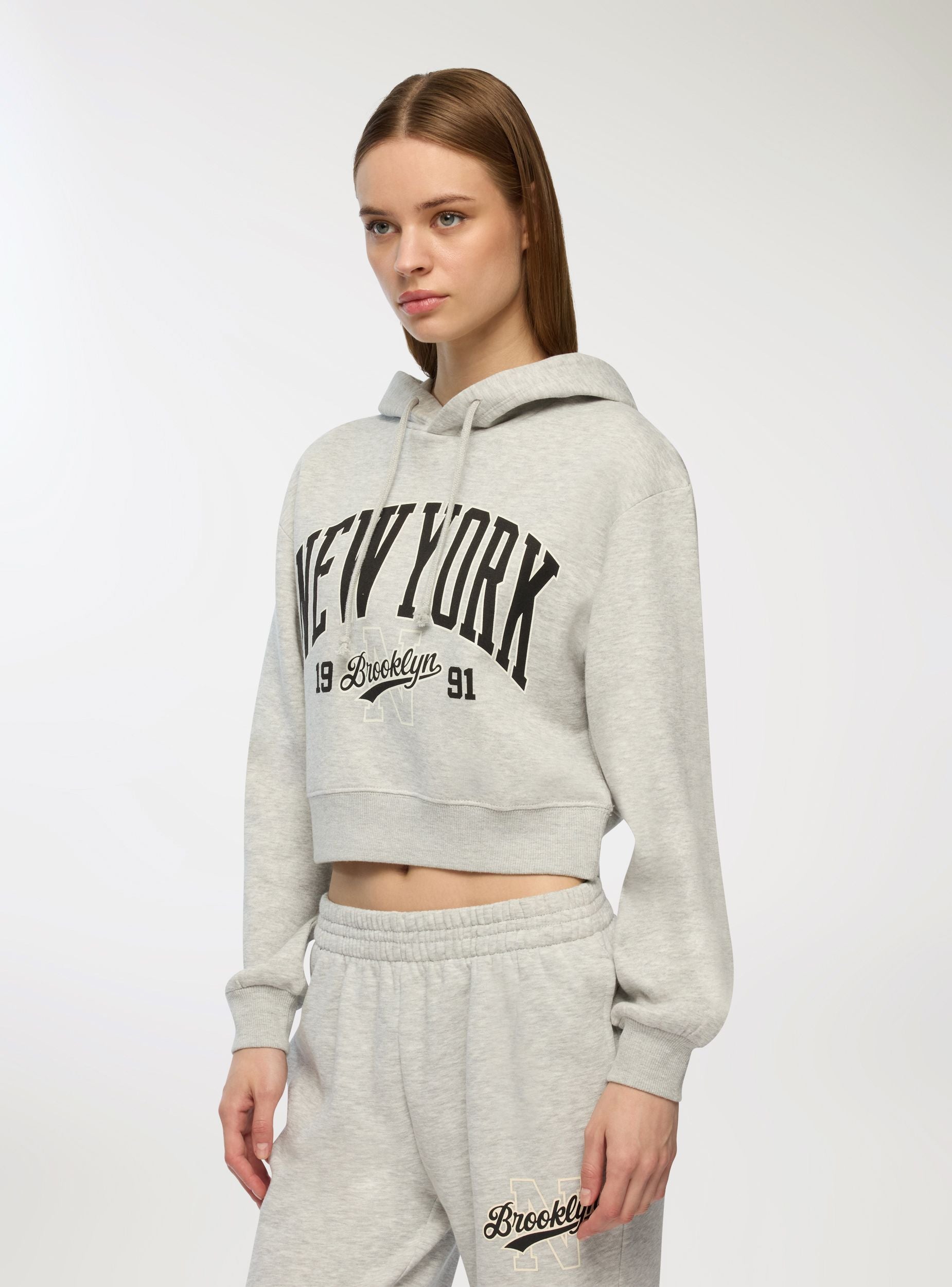 Felpa pesante da donna con cappuccio regolabile con coulisse e stampa in stile college americano sul davanti. Il modello cropped con fondo e polsi a costine valorizza la silhouette e dona un tocco sportivo al look. Ideale per affrontare le giornate più fredde con stile e comfort. Perfetta con jeans, joggers o leggings per outfit casual d’ispirazione urban, comodi e di tendenza.