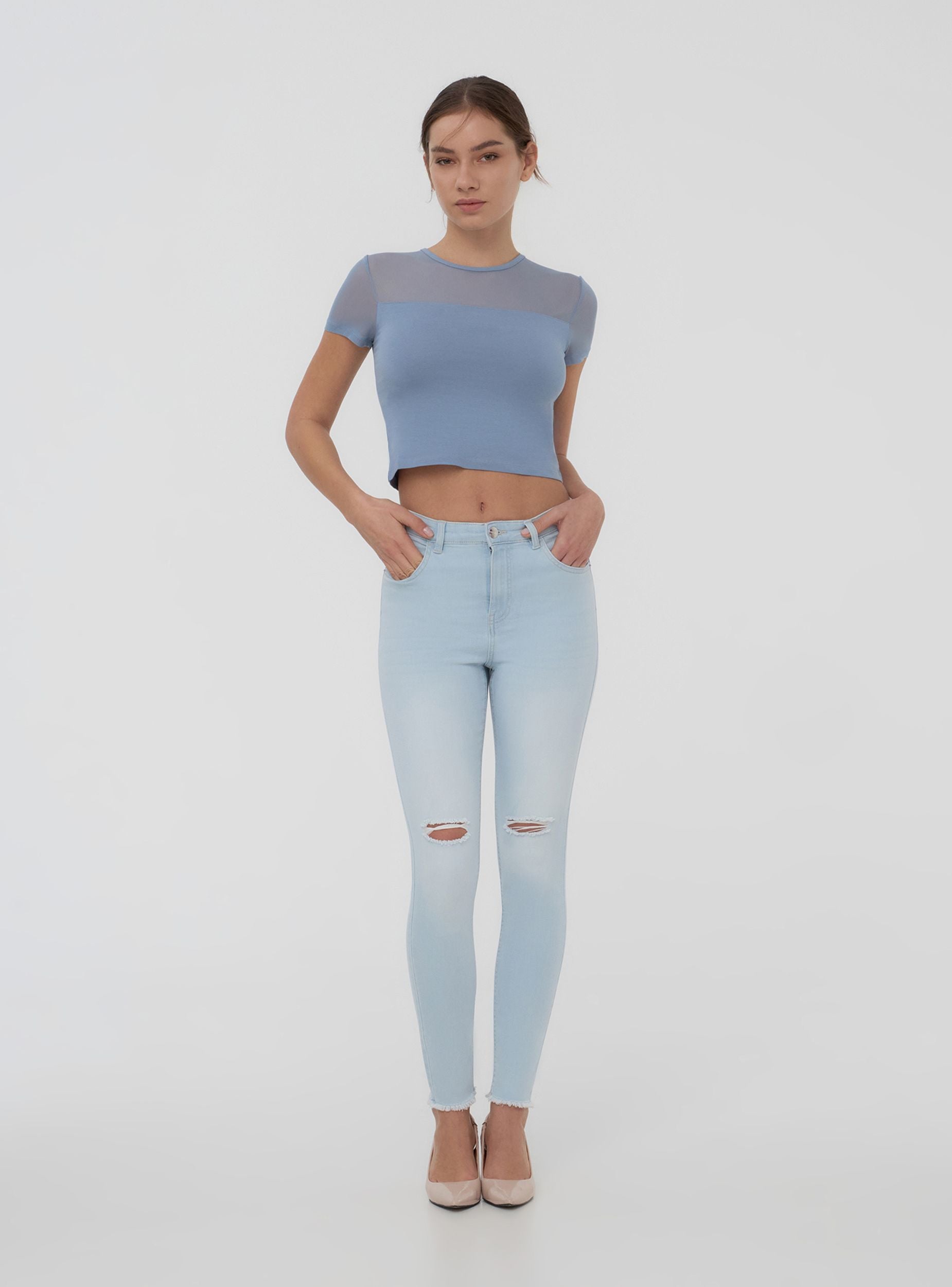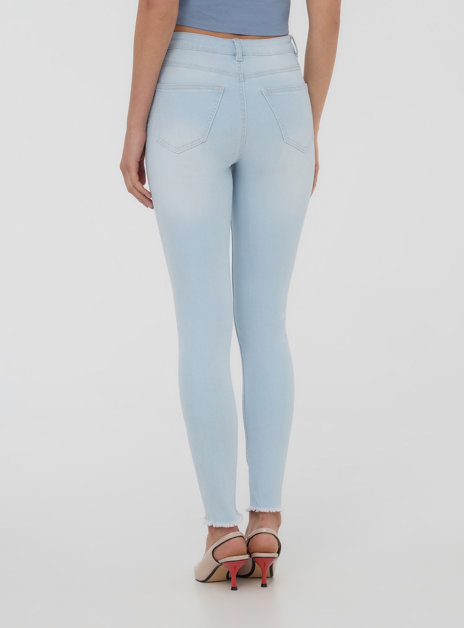 Jeans da donna dal taglio skinny, perfetti per un look casual e contemporaneo. Ideali per il tempo libero o per un outfit grintoso, sono dotati di passanti in vita, cinque pratiche tasche e chiusura con bottone e zip. Il lavaggio chiaro, arricchito da dettagli con strappi, conferisce uno stile moderno e versatile.