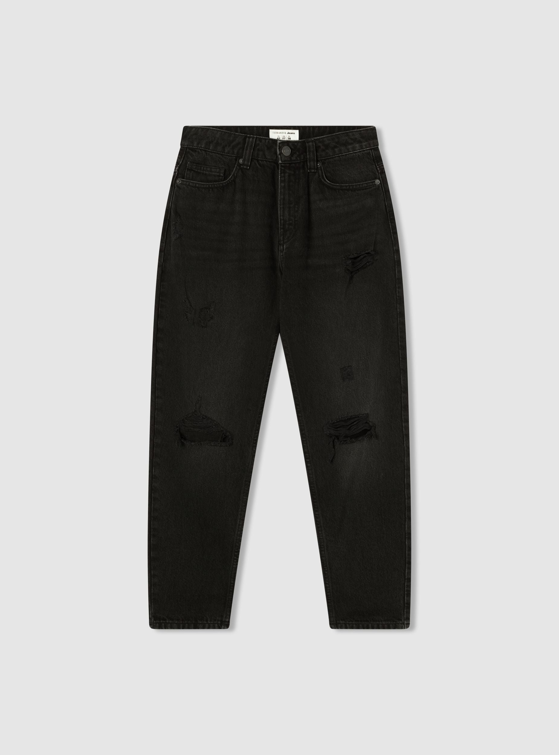 Jeans da donna con vestibilità mom fit, caratterizzati da strappi decorativi che aggiungono un tocco moderno e grintoso. Ideali per un look casual e urbano, si abbinano perfettamente a magliette e sneakers per un outfit quotidiano. Presentano una chiusura con bottone e zip, e tasche funzionali sia anteriori che posteriori. Perfetti per esprimere uno stile giovane e dinamico.