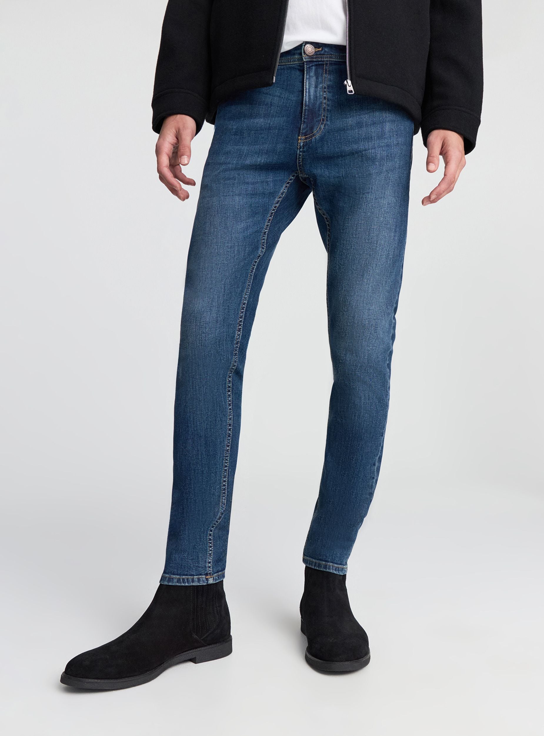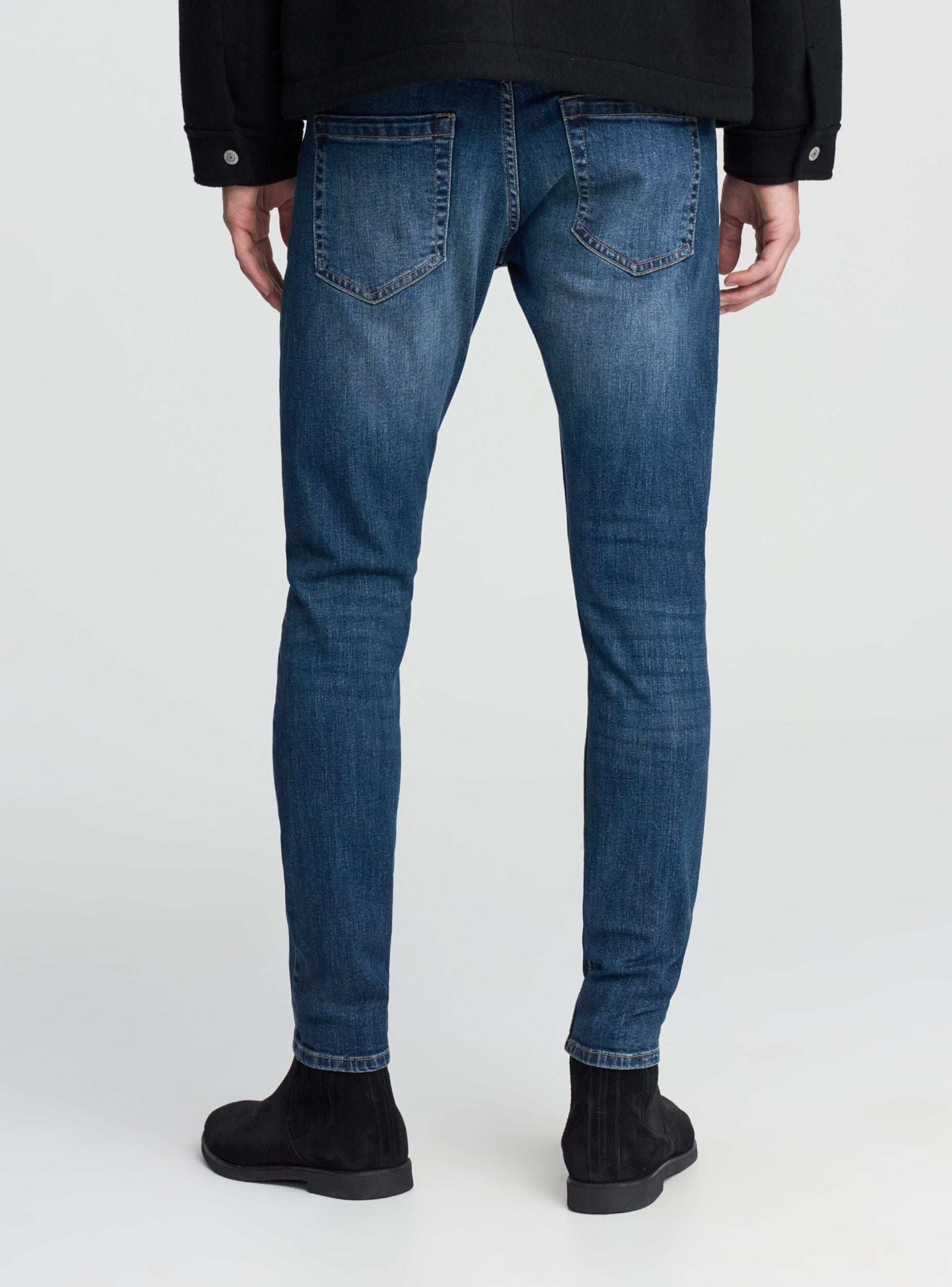 Jeans skinny da uomo con cinque tasche, taglio aderente e design moderno. Presentano un dettaglio di cuciture su tutta la lunghezza delle gambe e un look lavato per un aspetto vissuto. La chiusura è con zip e bottone in vita, con passanti per cintura. Tasche laterali e posteriori offrono funzionalità e stile, ideali per un look casual e contemporaneo.Dettagli