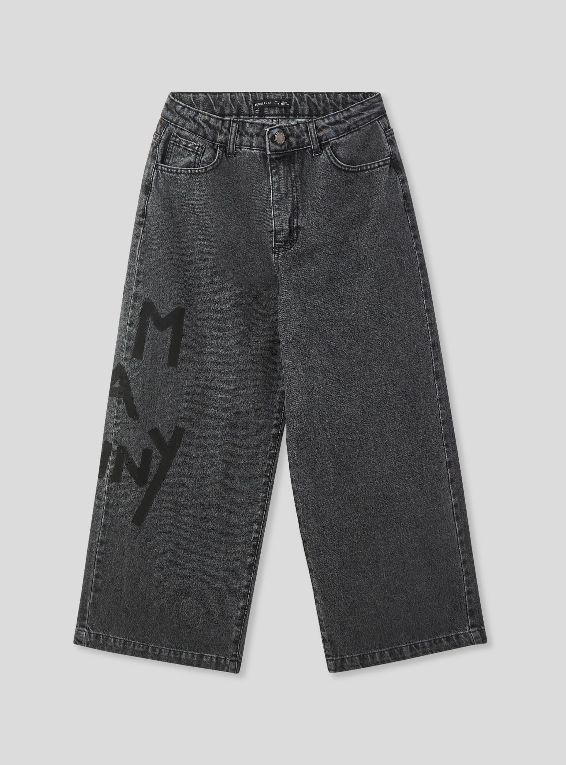 Jeans da bambina a gamba ampia che offrono un look contemporaneo e alla moda. Caratterizzati da una stampa con scritte decorative, questi jeans uniscono praticità e stile in un design unico. La loro linea morbida e confortevole è ideale per seguire ogni movimento, mentre i dettagli della stampa aggiungono un tocco di originalità, perfetto per ogni occasione casual o outfit creativo.