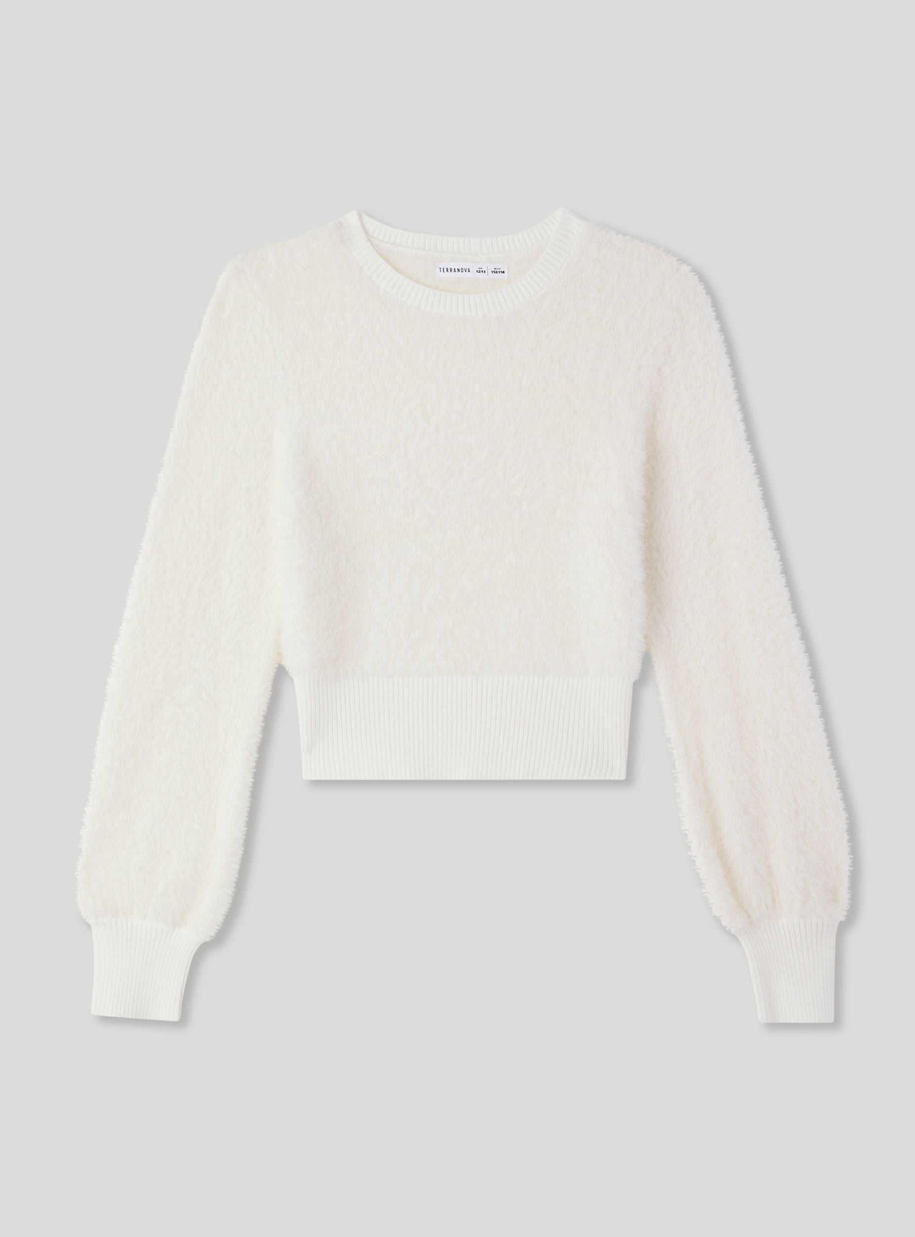 Maglia da bambina crop a tinta unita, ideale per look versatili e moderni. Il design corto valorizza abbinamenti con pantaloni o gonne a vita alta, mentre il tessuto effetto peloso aggiunge un tocco originale. Girocollo e maniche lunghe con polsini a costine garantiscono comfort e praticità, perfetta per la scuola o il tempo libero.Dettagli