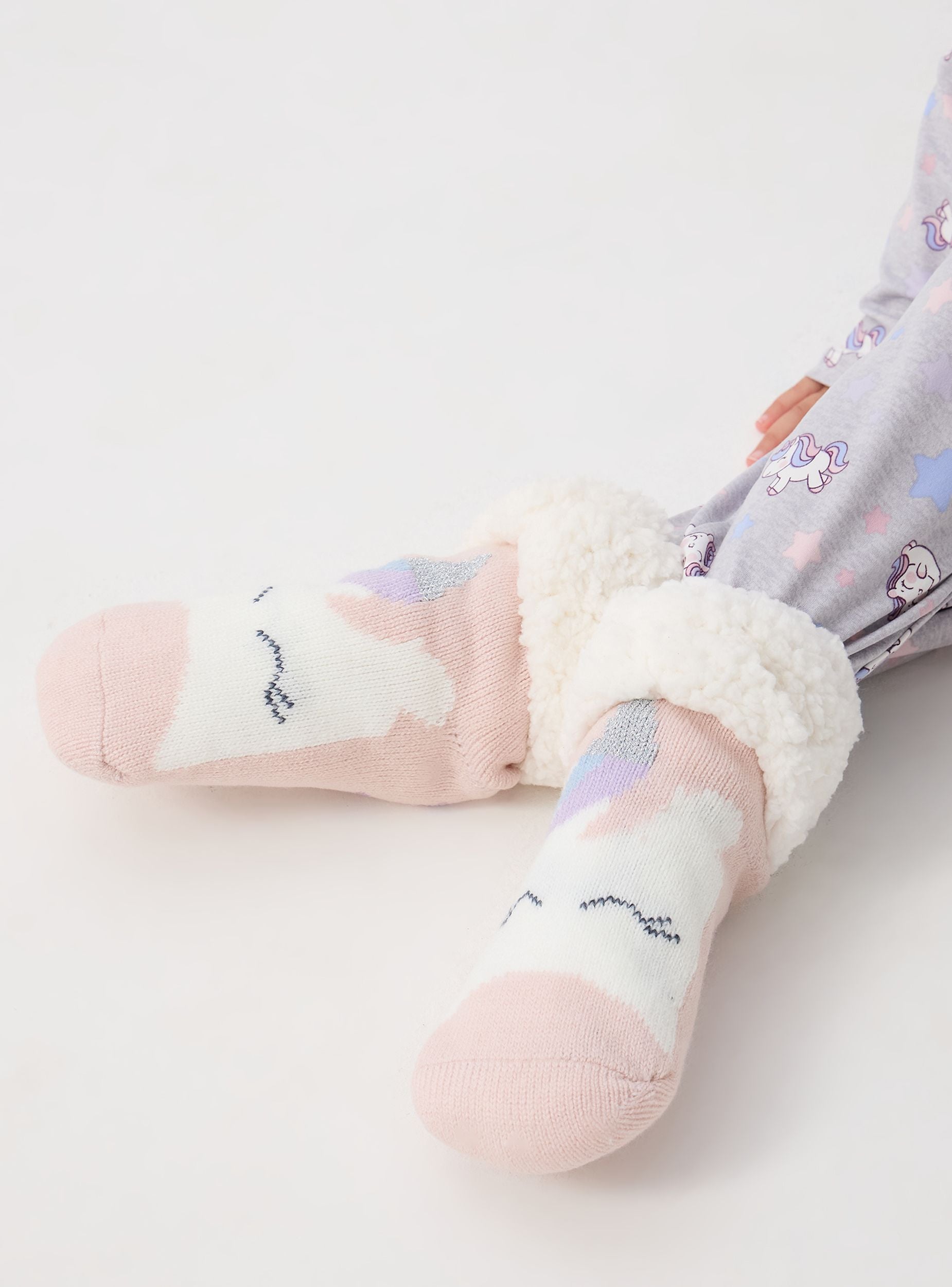 La taglia XS/S corrisponde a 2-9 anni. Confezione composta da 2 adorabili paia di calzini antiscivolo da bimba. Uno di colore rosa con stampa di un simpatico unicorno. L'altro bianco con la stampa di un dolce orsetto. Entrambi presentano impronte di zampa in silicone per un effetto antiscivolo. L'interno è rivestito in sherpa per un calore extra.Dettagli