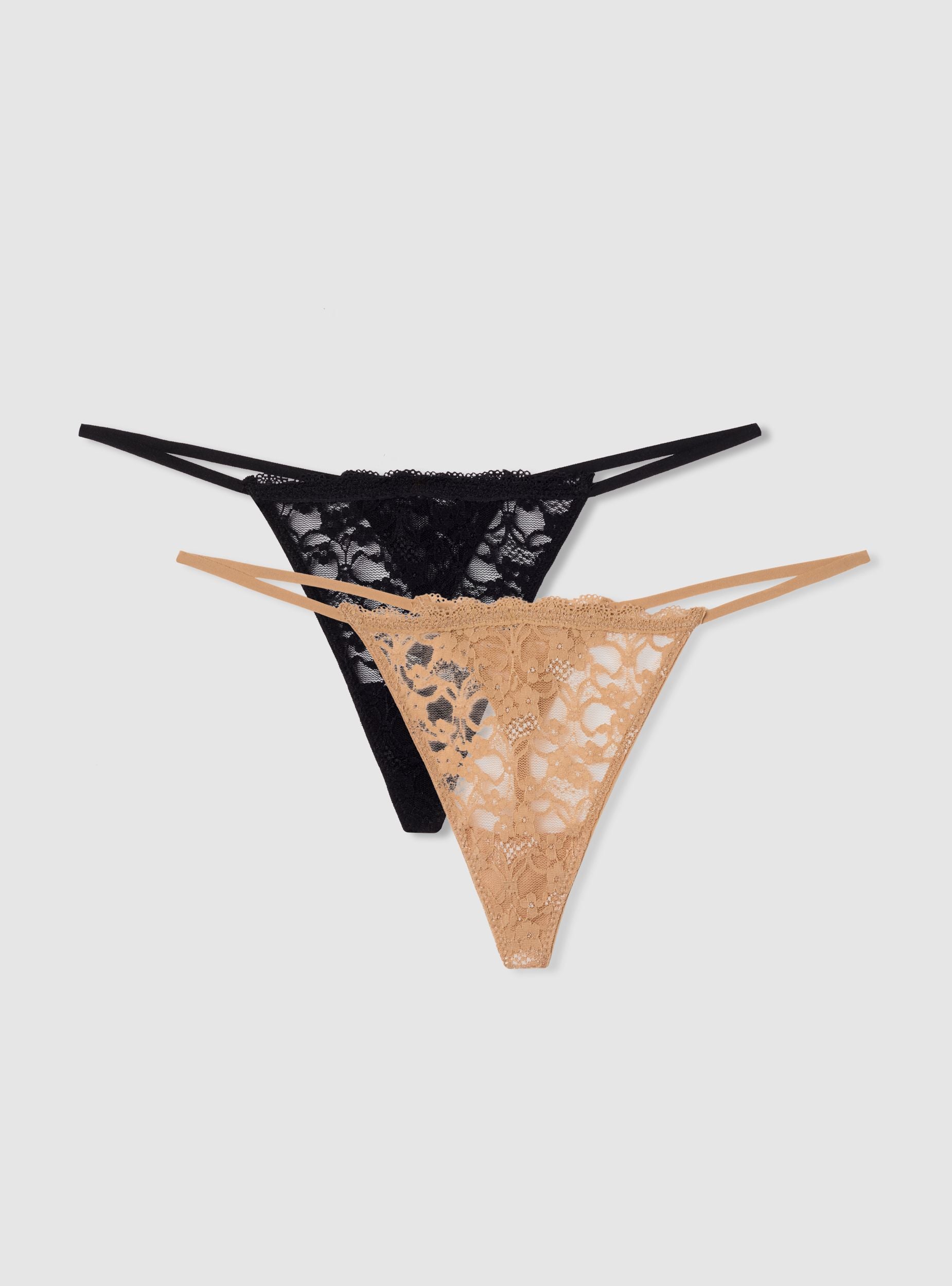 Confezione composta da due perizomi da donna, ideali per chi cerca comfort e discrezione sotto ogni tipo di abbigliamento. Il design minimal con dettagli in pizzo aggiunge un tocco femminile e sensuale, perfetto per l'uso quotidiano o per occasioni speciali. Vestibilità aderente che valorizza la silhouette, linee essenziali per un effetto invisibile sotto i vestiti.