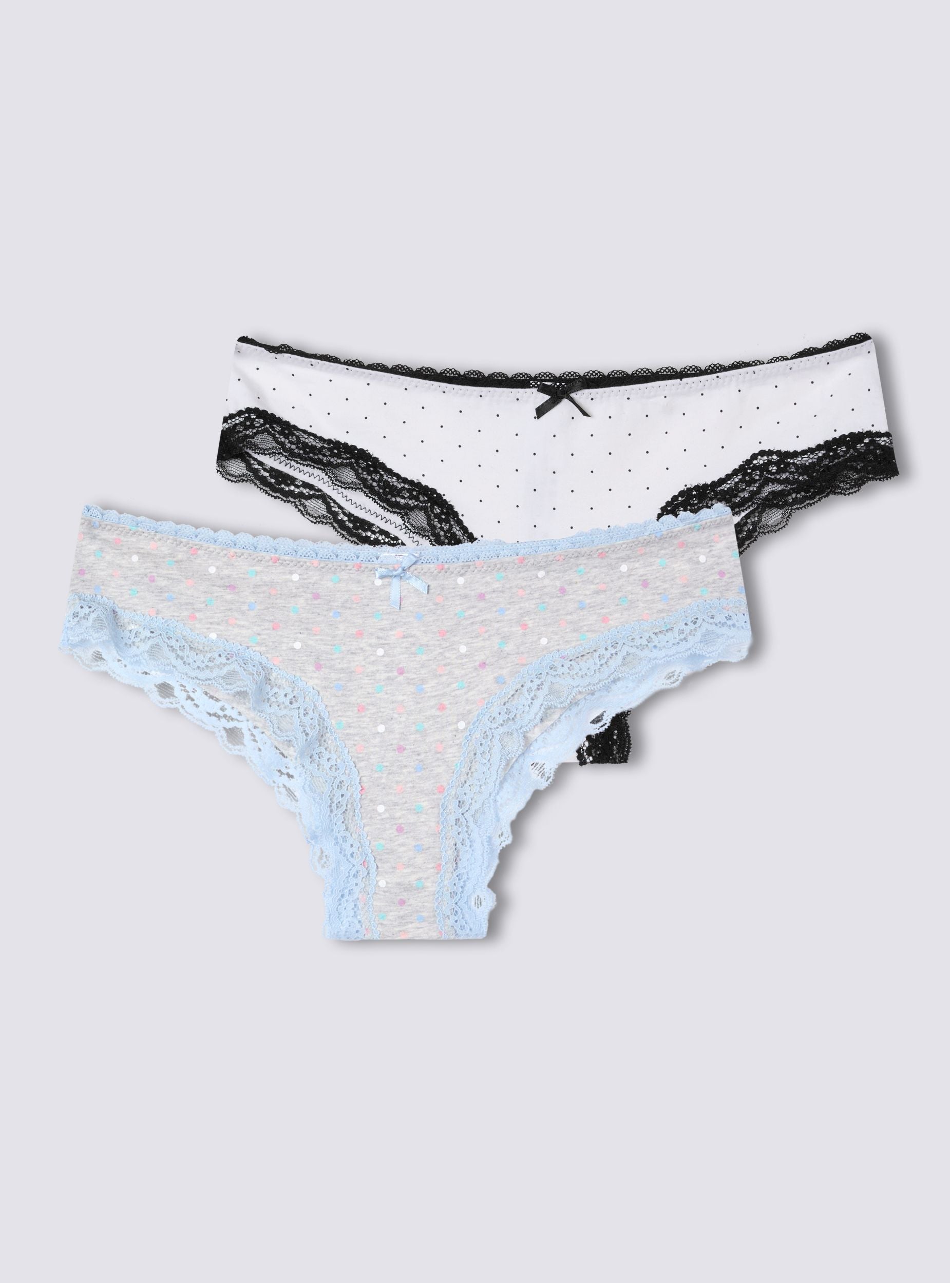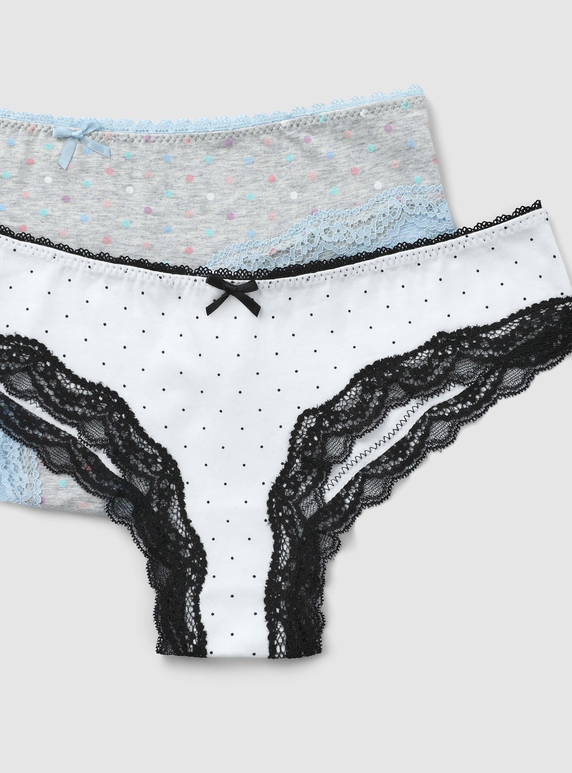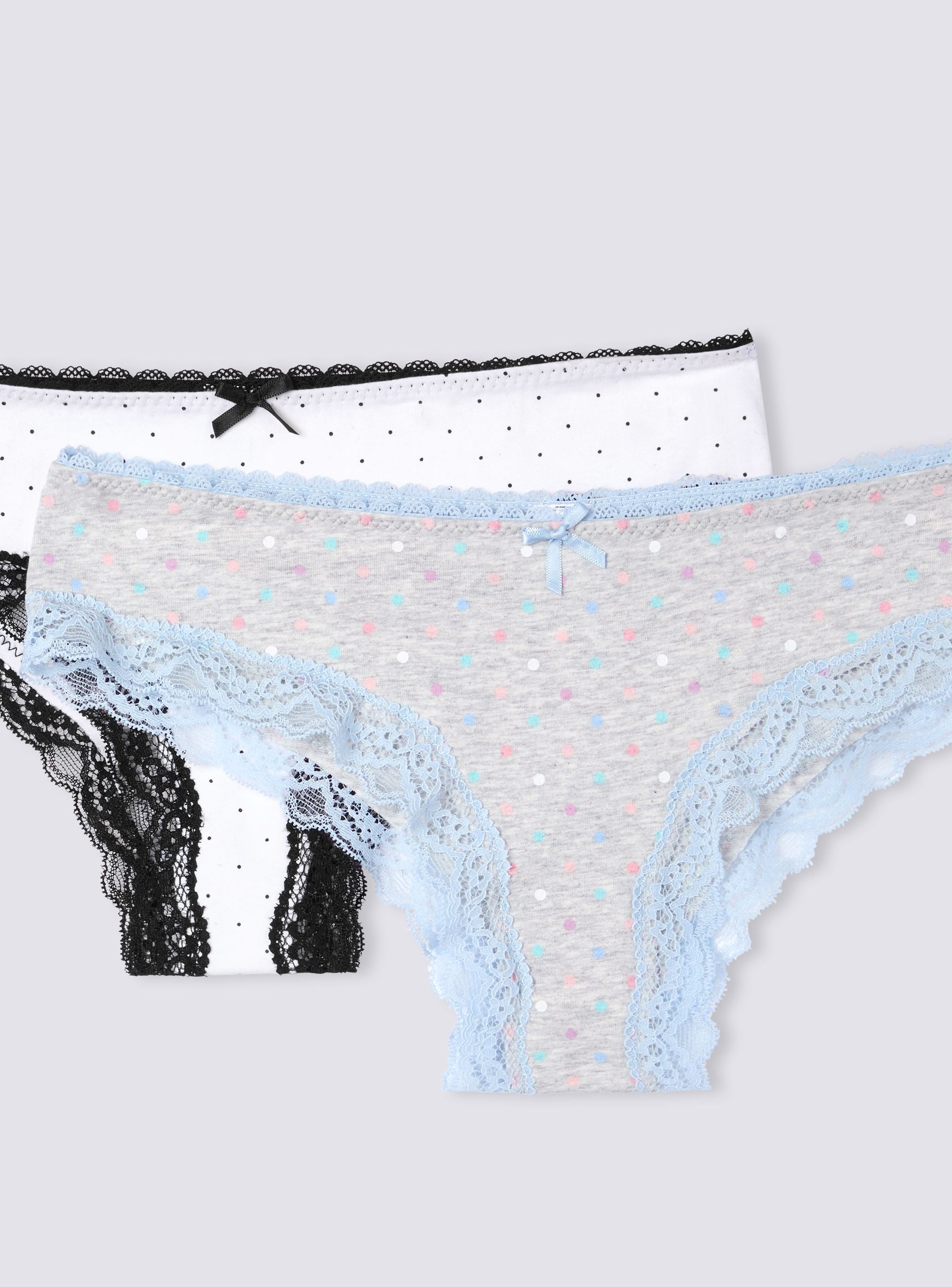 Confezione composta da 2 slip da donna dal design femminile e raffinato. Entrambi i modelli sono decorati con delicati motivi a pois e arricchiti da dettagli in pizzo che valorizzano la linea. Il fiocco aggiunge un tocco di grazia e stile. Ideali per chi cerca un intimo elegante e confortevole, perfetto per ogni momento della giornata.Dettagli