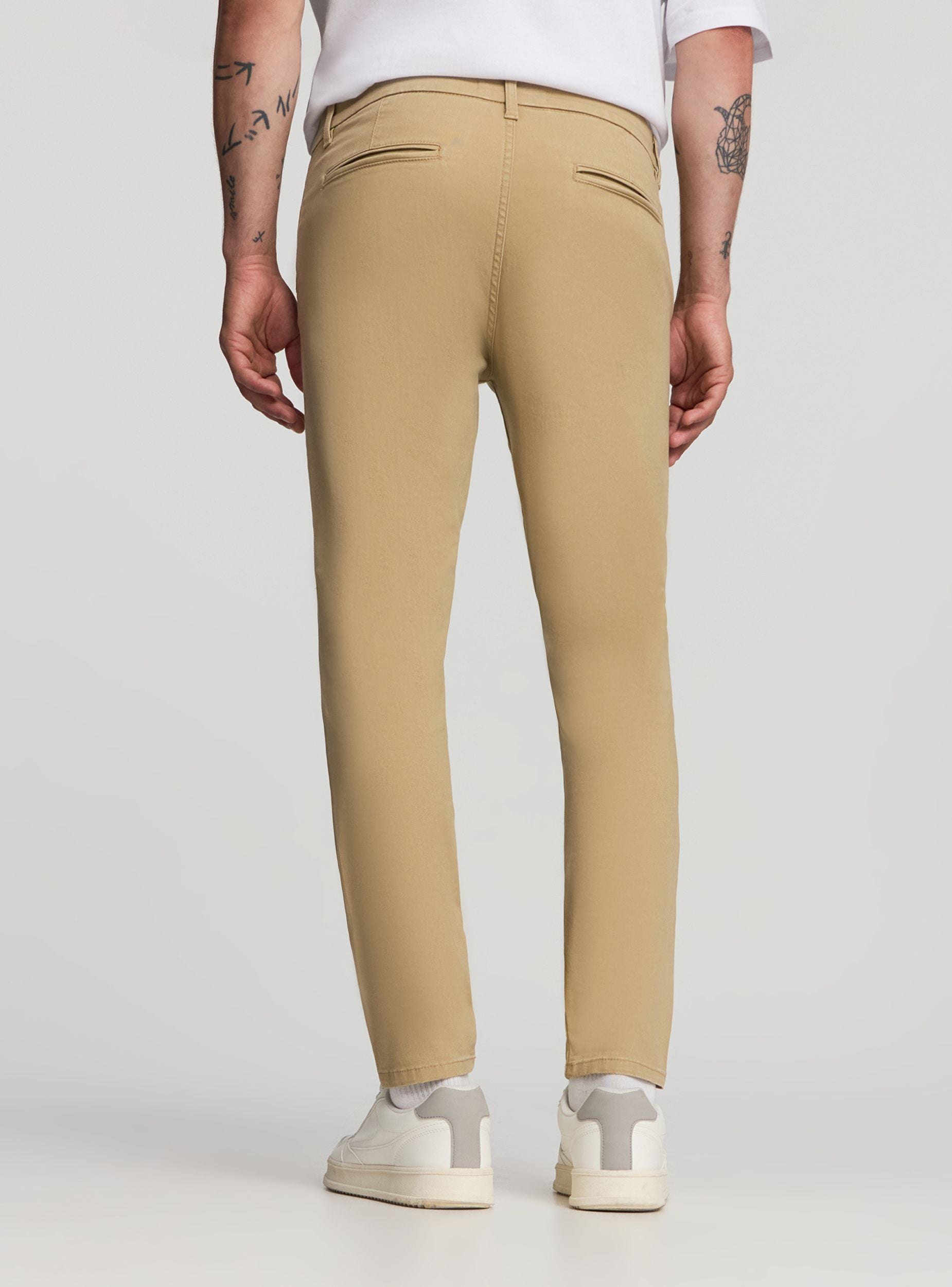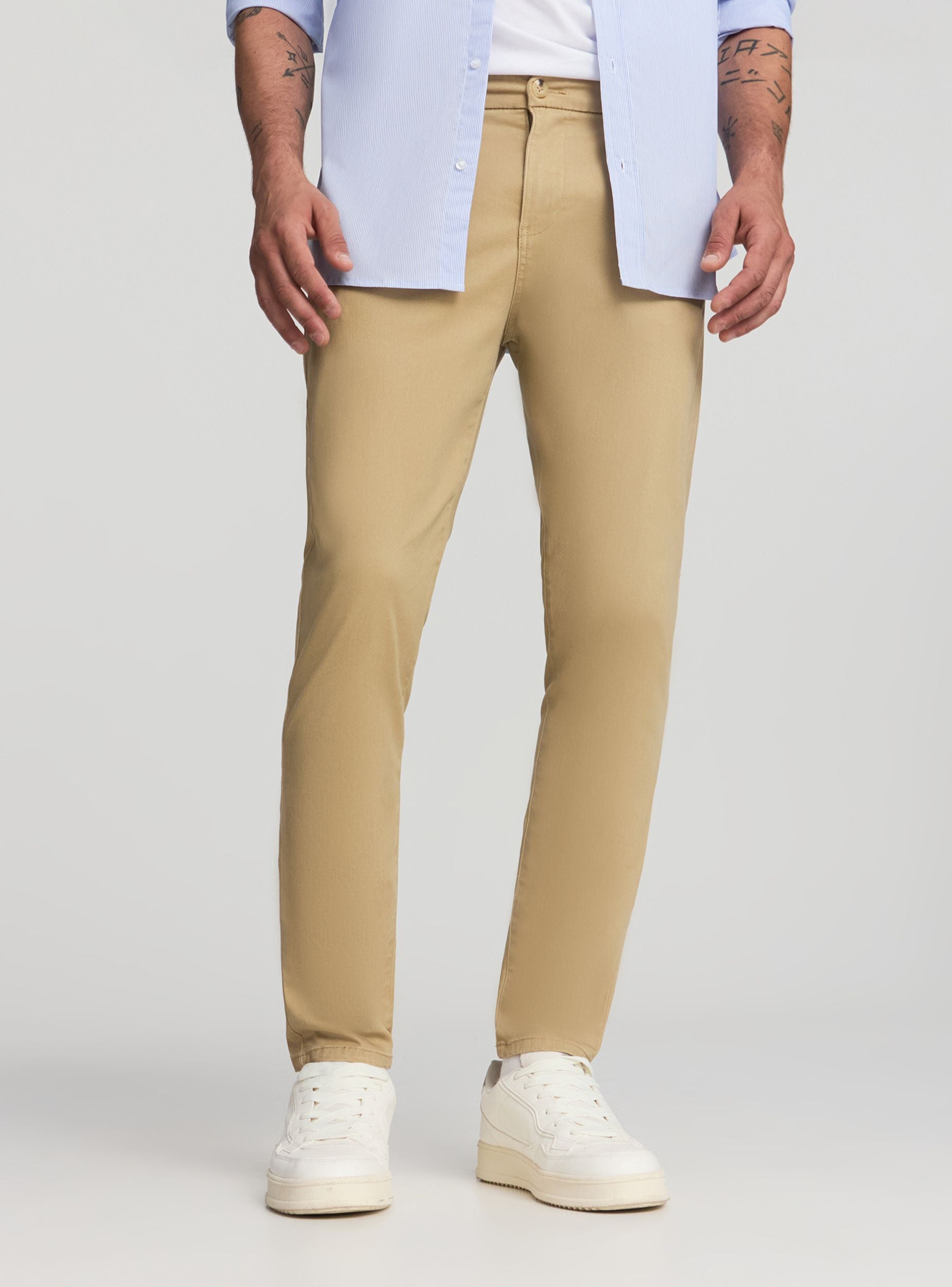Pantaloni chino da uomo dal taglio skinny, perfetti per un look casual ma curato. Realizzati in tessuto twill leggermente elasticizzati, garantiscono comfort e libertà di movimento per tutta la giornata. Presentano tasche laterali, tasche posteriori a filetto e chiusura frontale con bottone e zip. Ideali da abbinare a camicie o maglie per uno stile versatile, dal lavoro al tempo libero.Dettagli