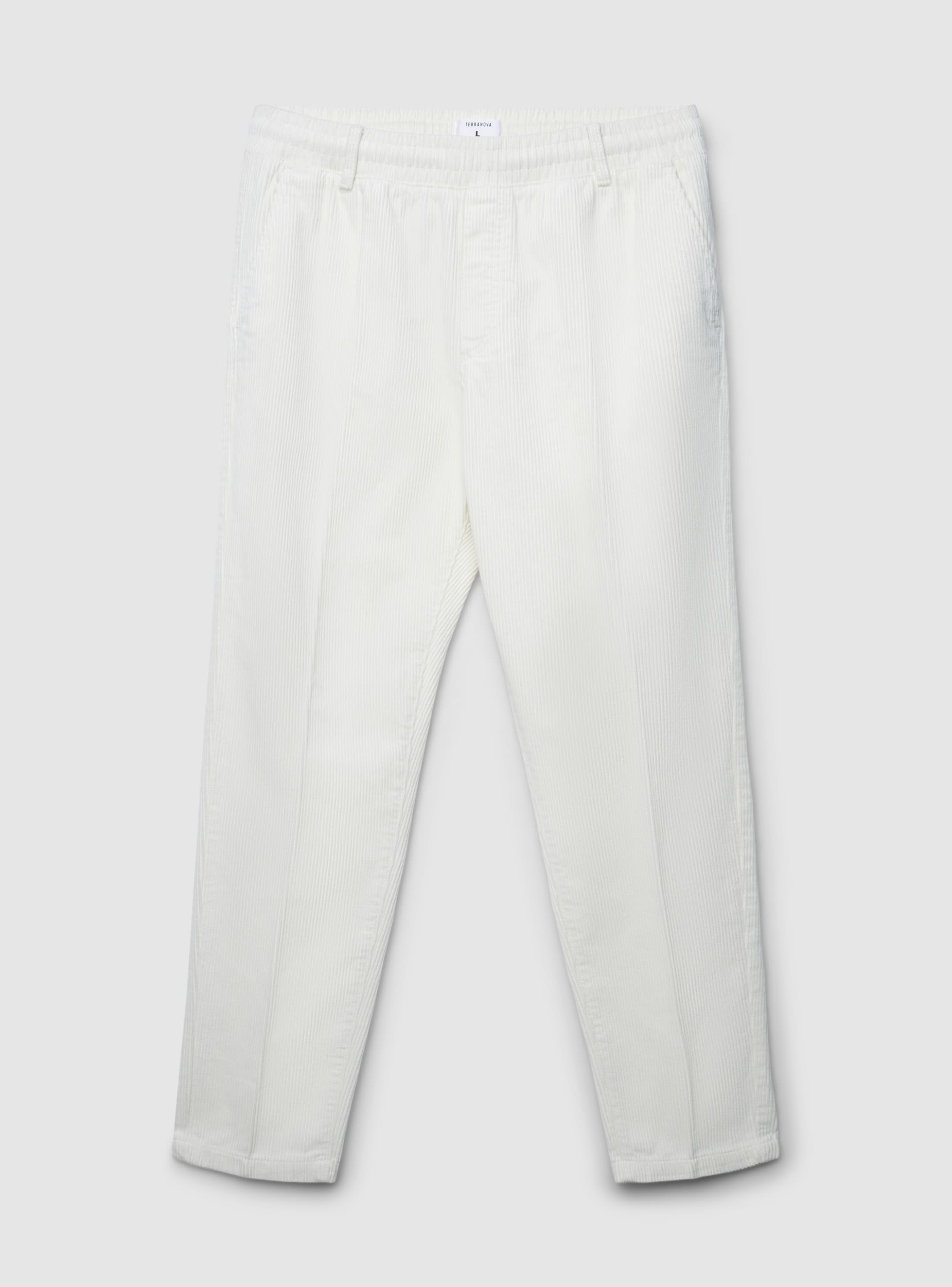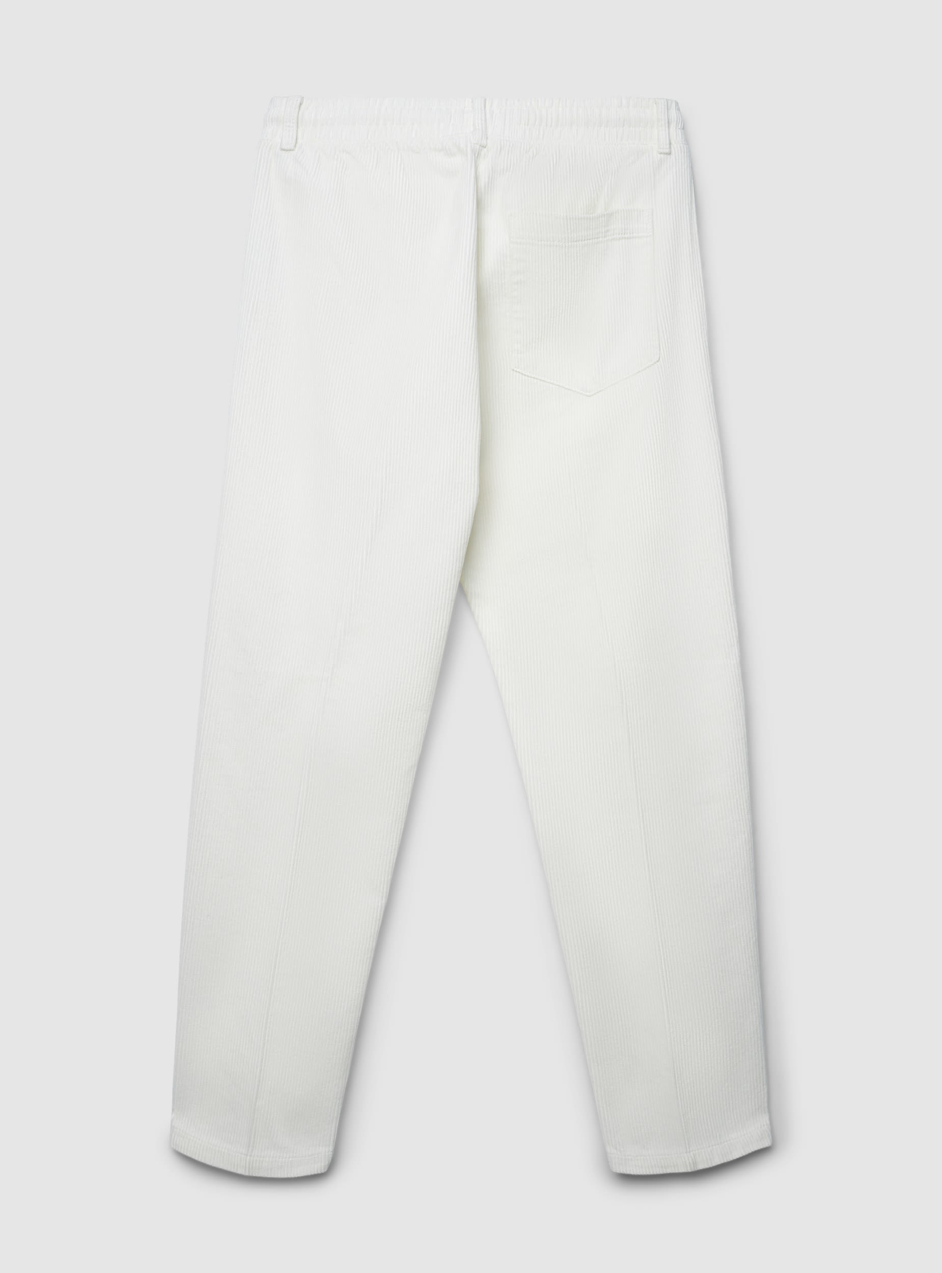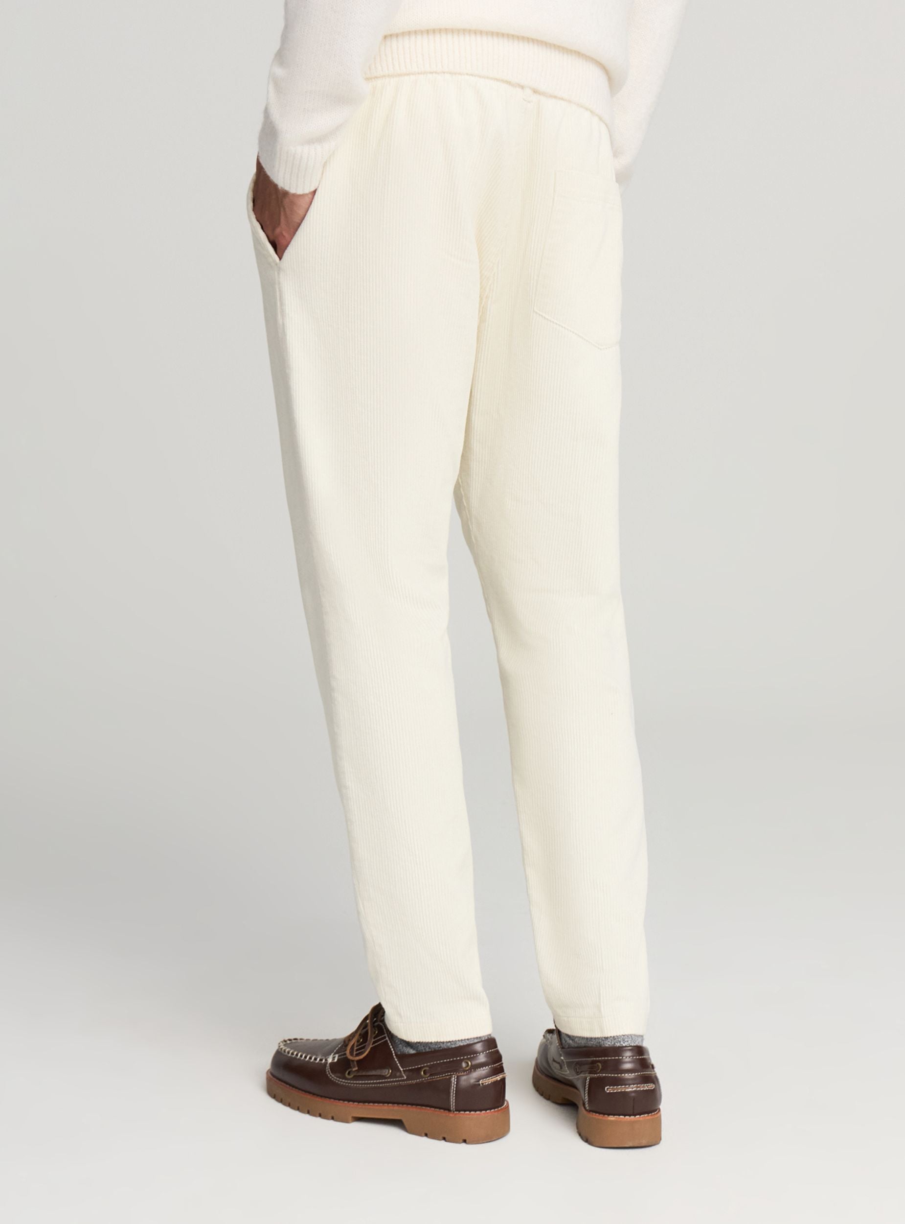 Pantaloni da uomo a gamba dritta. Tessuto tinta unita in effetto velluto a coste, ideali per look casual e rilassati. La vita è elasticizzata con passanti per cintura, offrendo comfort quotidiano. Tasche laterali alla francese. Si abbina bene a camicie o felpe per il tempo libero o l’ufficio informale.Dettagli