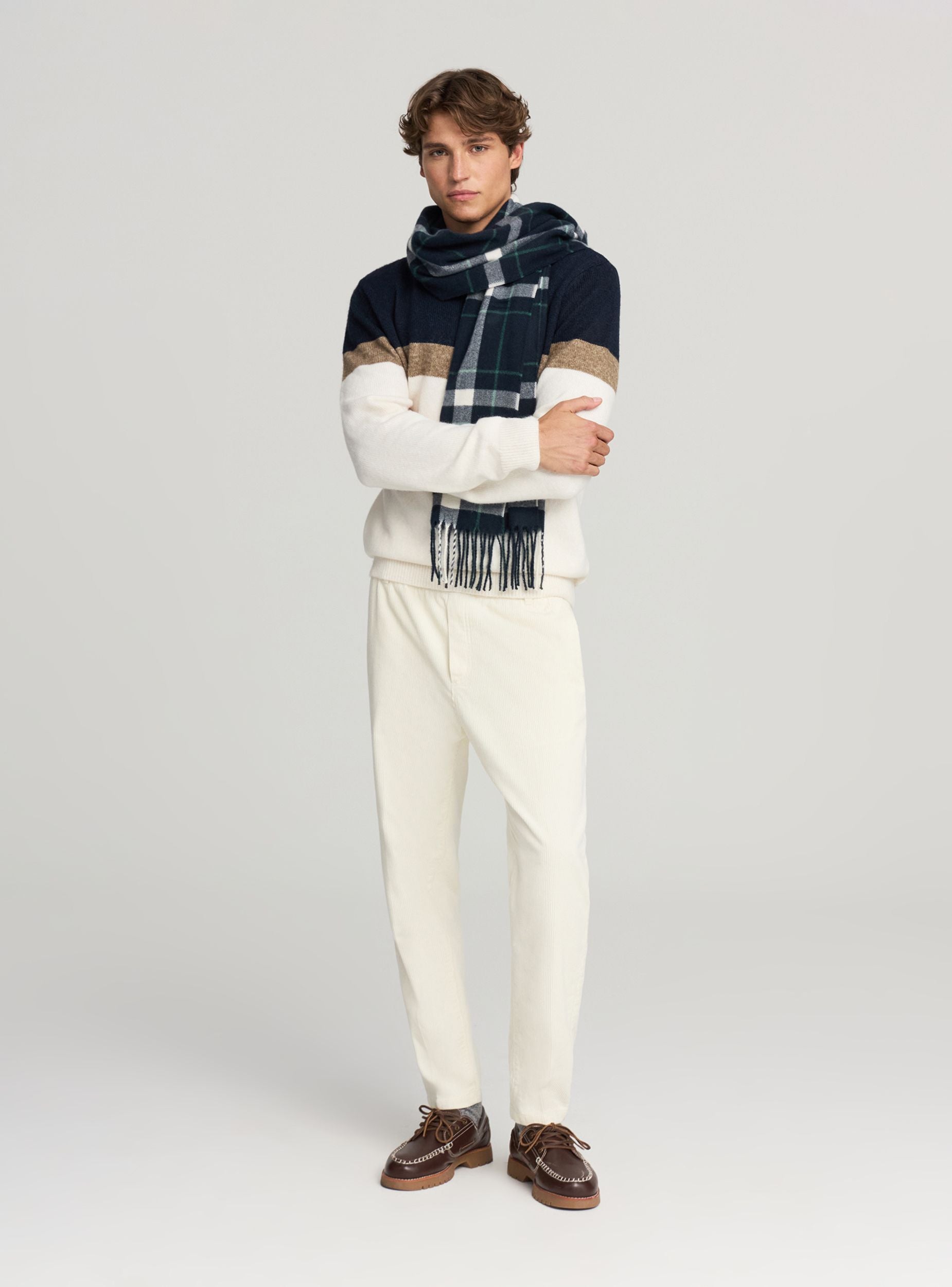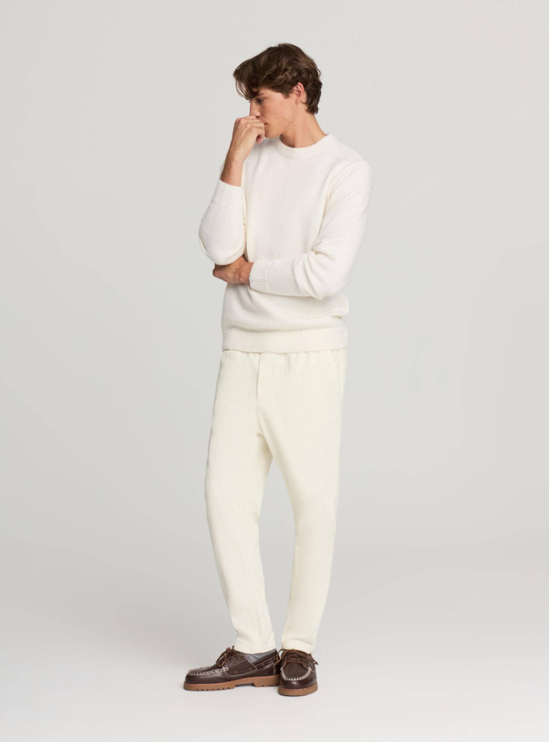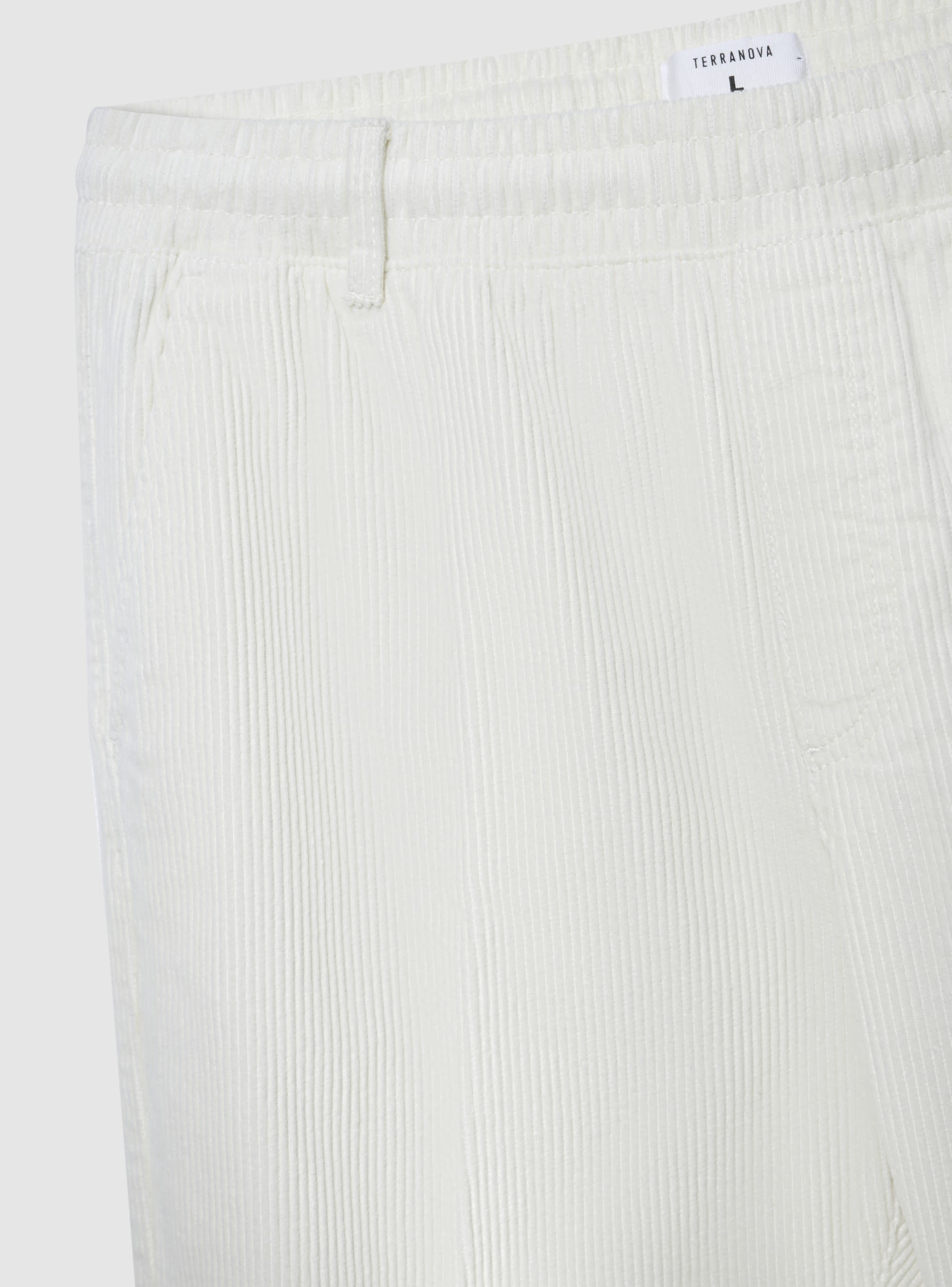 Pantaloni da uomo a gamba dritta. Tessuto tinta unita in effetto velluto a coste, ideali per look casual e rilassati. La vita è elasticizzata con passanti per cintura, offrendo comfort quotidiano. Tasche laterali alla francese. Si abbina bene a camicie o felpe per il tempo libero o l’ufficio informale.Dettagli