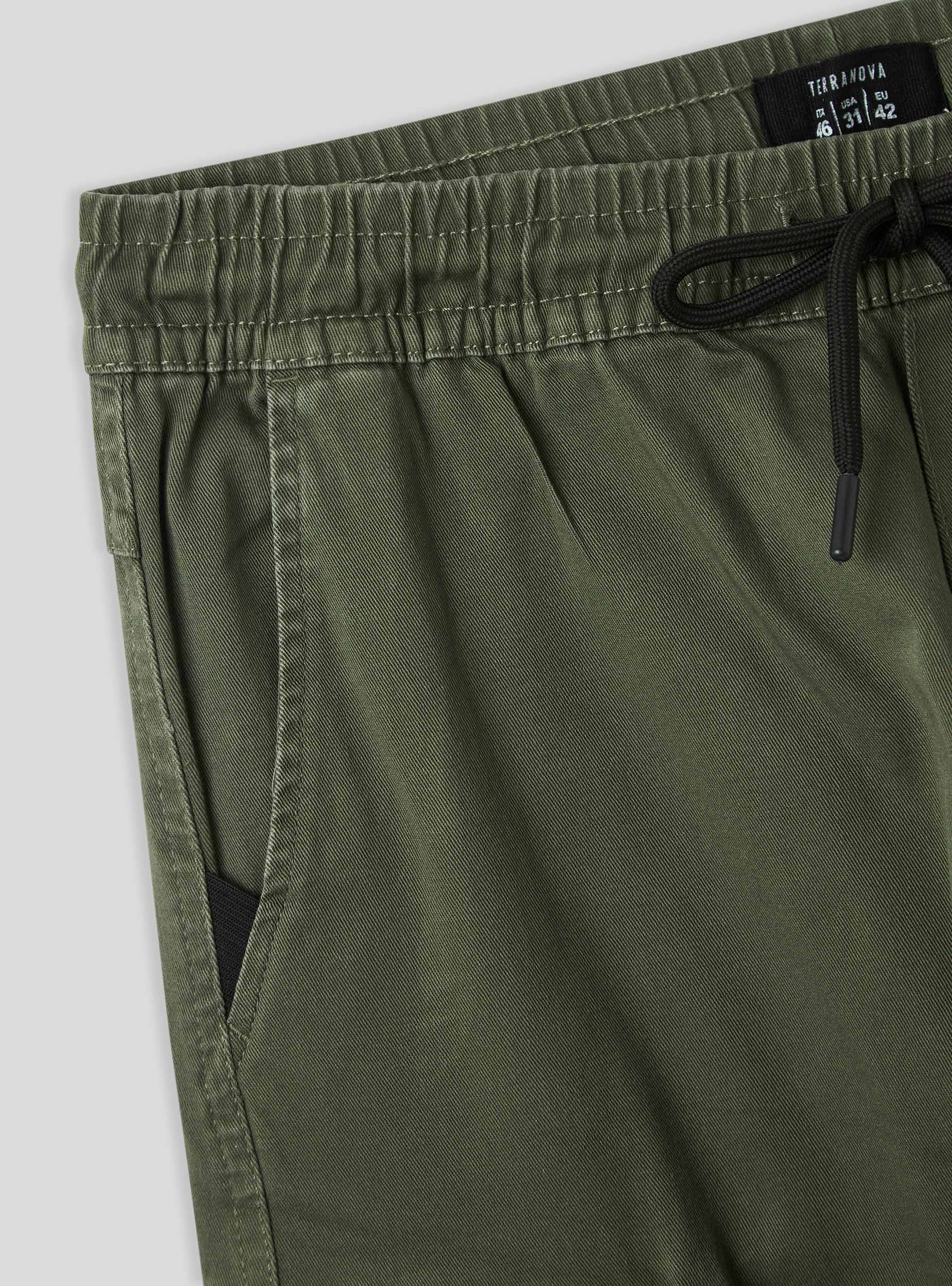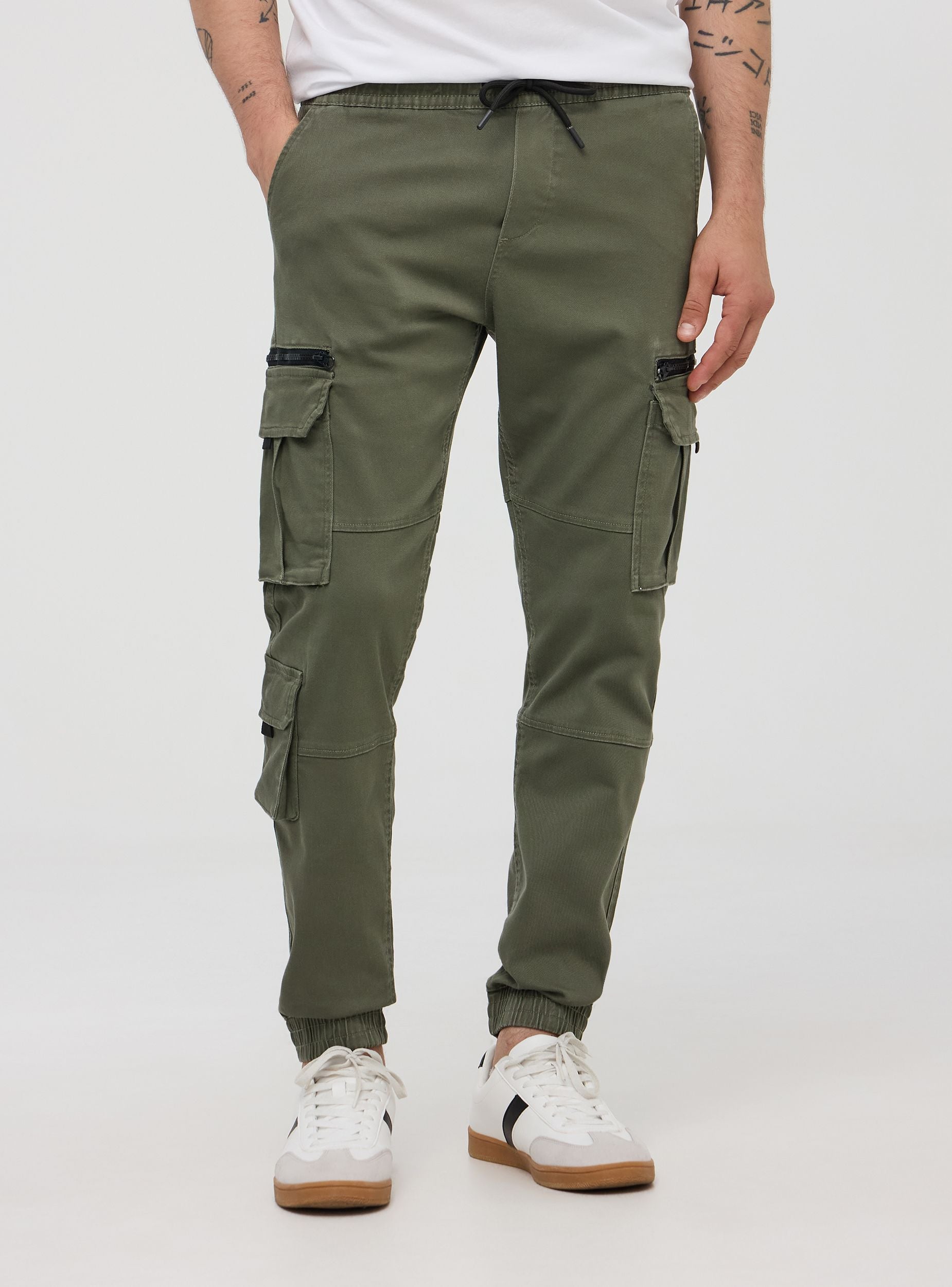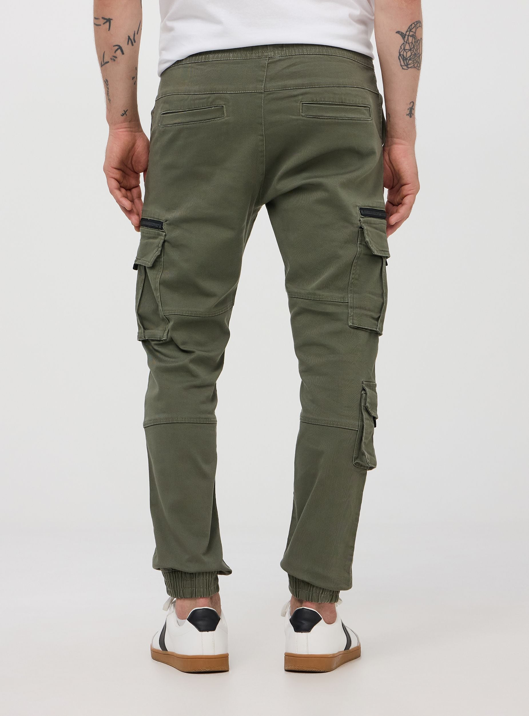 Questi pantaloni jogger modello cargo da uomo sono realizzati in cotone elasticizzato e offrono una vestibilità confortevole. Il tessuto a tinta unita li rende versatili per ogni occasione casual. Dotati di elastico in vita con coulisse regolabile, presentano multiple tasche: due anteriori con dettaglio elastico a contrasto, tre cargo con patta e chiusura con bottone a pressione, di cui due con dettaglio zip a contrasto e due posteriori. Cuciture robuste e dettagli funzionali per un look casual e versatile.