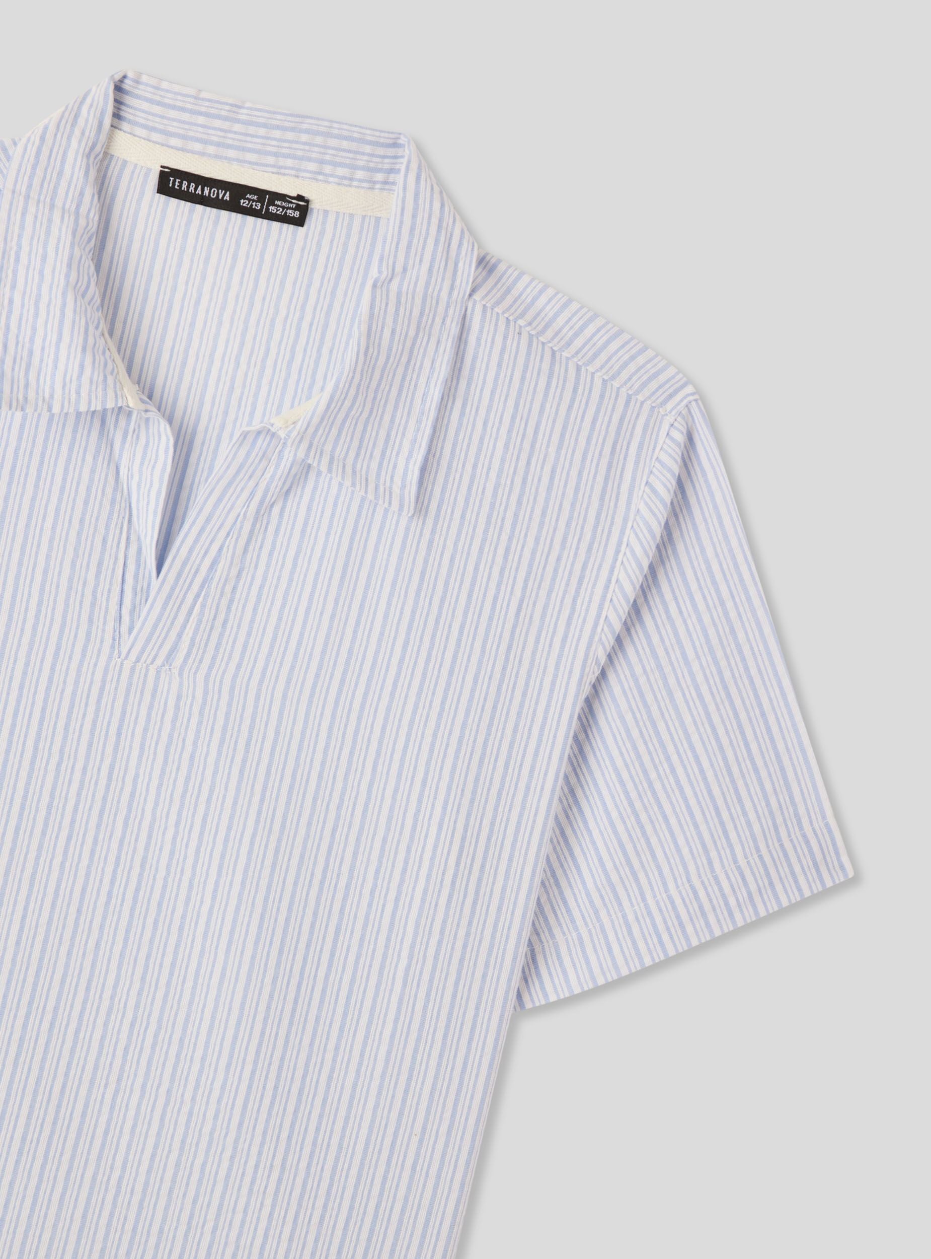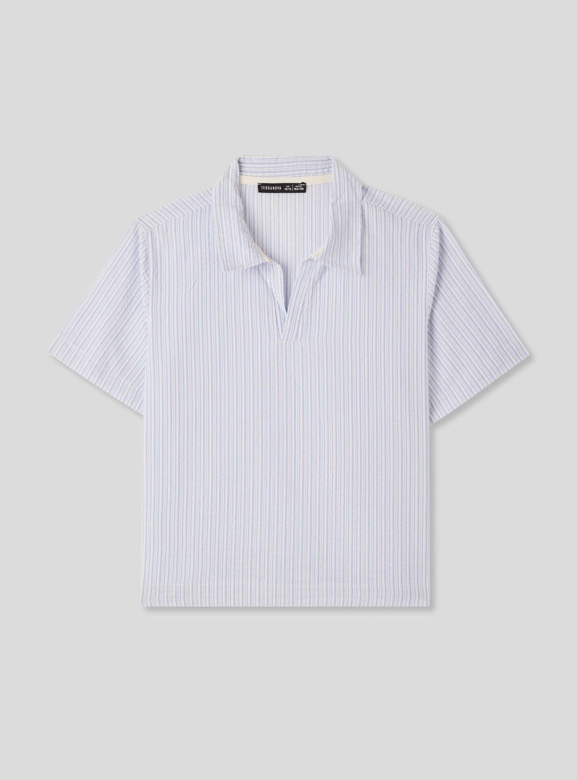 Maglietta da bambino con collo a polo, ideale per look casual e versatili. Il tessuto leggero effetto lino con fantasia a righe verticali aggiunge un tocco moderno, perfetta per abbinamenti con jeans o bermuda nelle giornate di scuola o tempo libero. Le maniche corte e la vestibilità regolare garantiscono comfort e libertà di movimento, mentre il design senza bottoni rende il capo pratico da indossare.