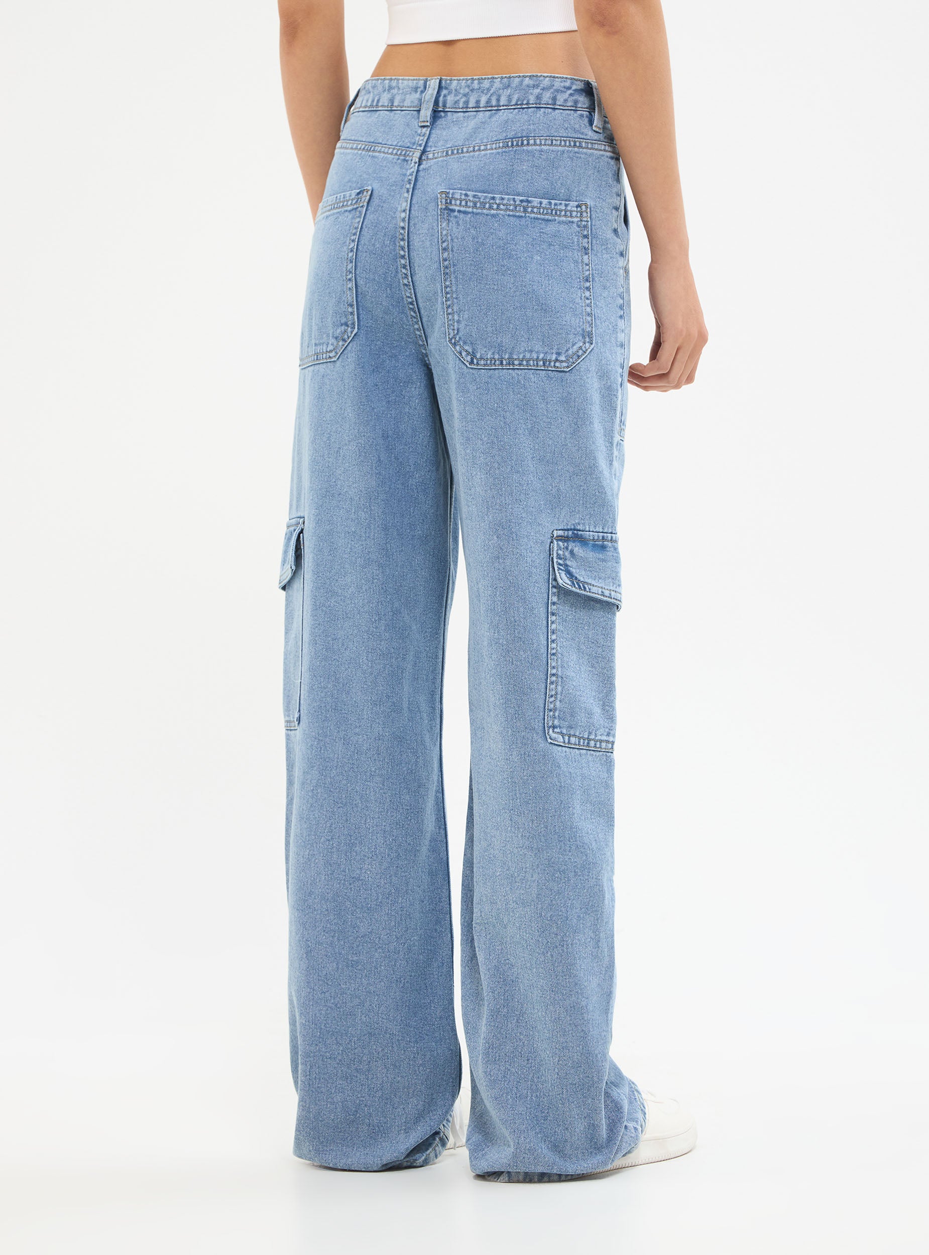 Jeans cargo da donna. Vita alta, patta con cerniera e bottone. Tasche laterali applicate sulle gambe, tasche posteriori. Tessuto fisso. Vestibilità  ampia.La modella è alta 1,81 e indossa la taglia S.