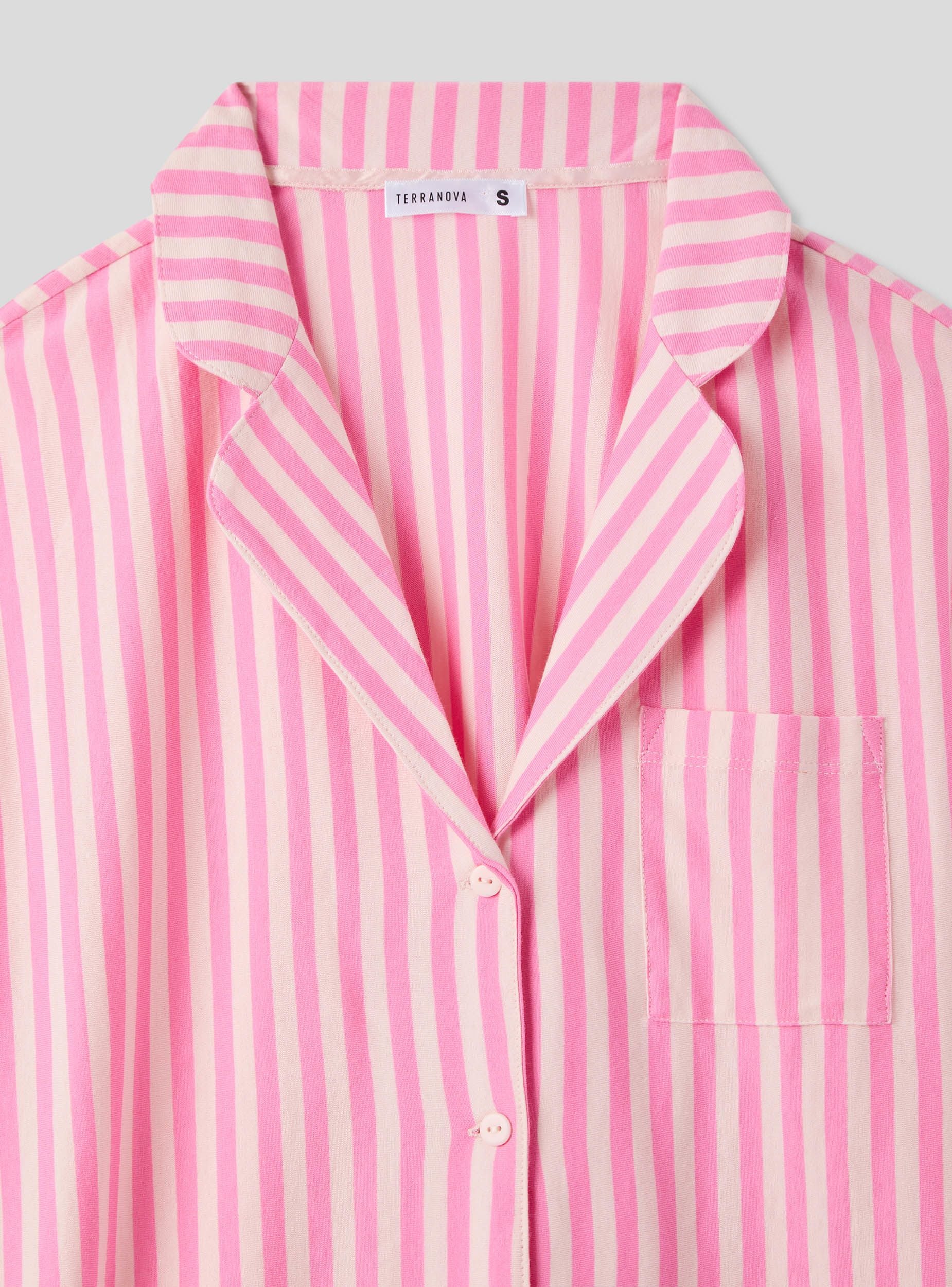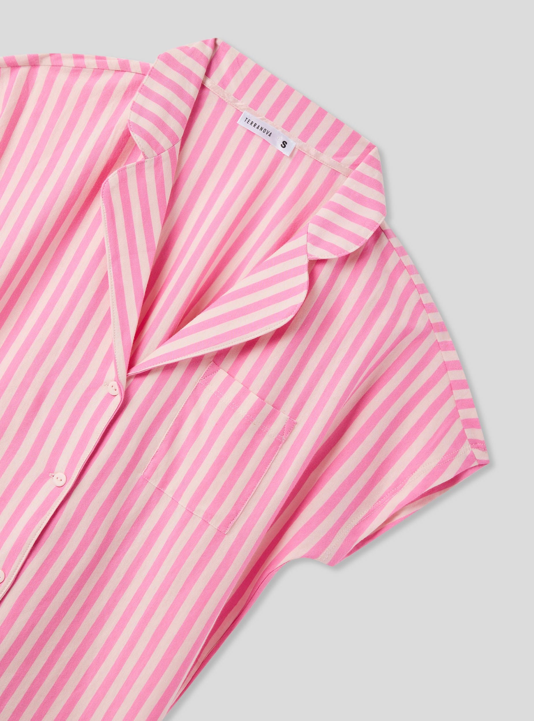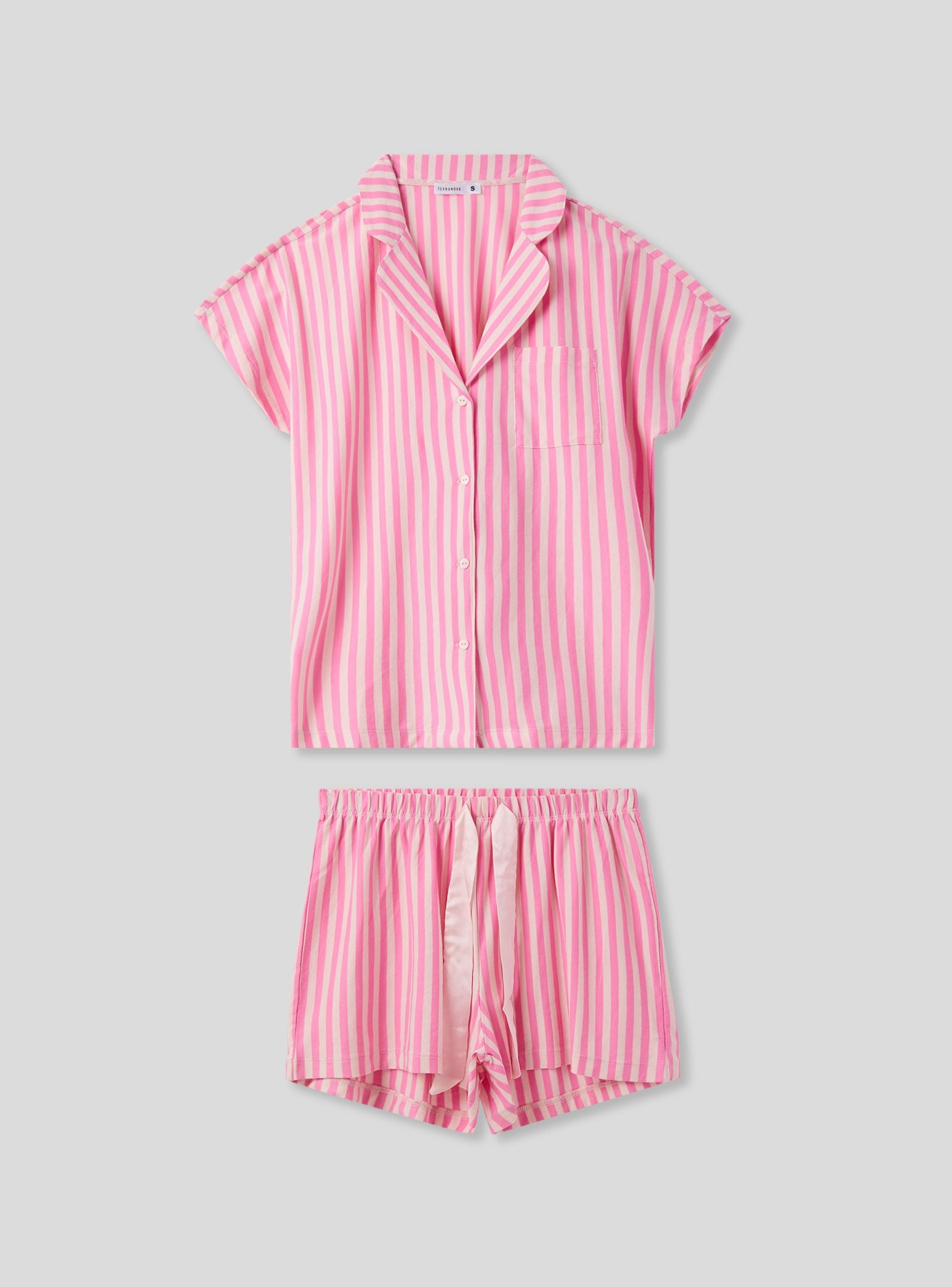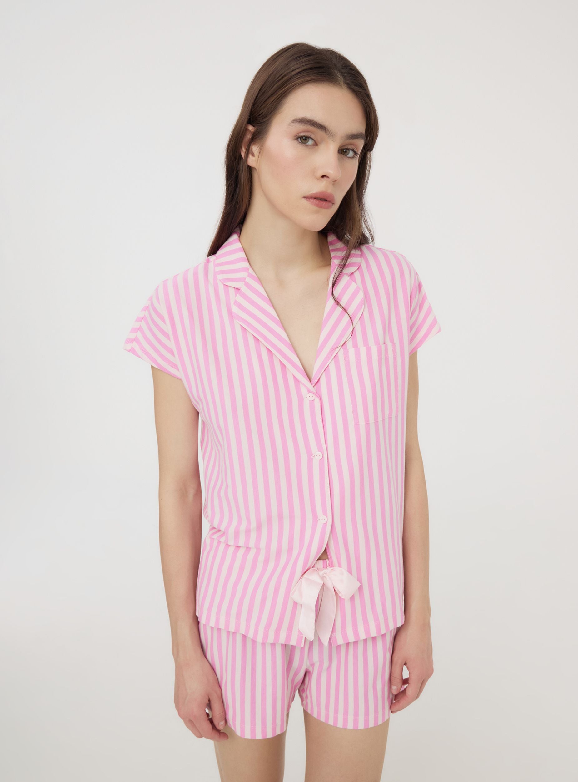 Pigiama corto da donna perfetto per le calde notti estive. Composto da una camicia a righe con maniche corte, colletto, bottoni frontali e un comodo taschino. I pantaloncini coordinati presentano una pratica coulisse per una vestibilità regolabile. Un'ottima scelta per un look fresco e raffinato durante il relax o il riposo.