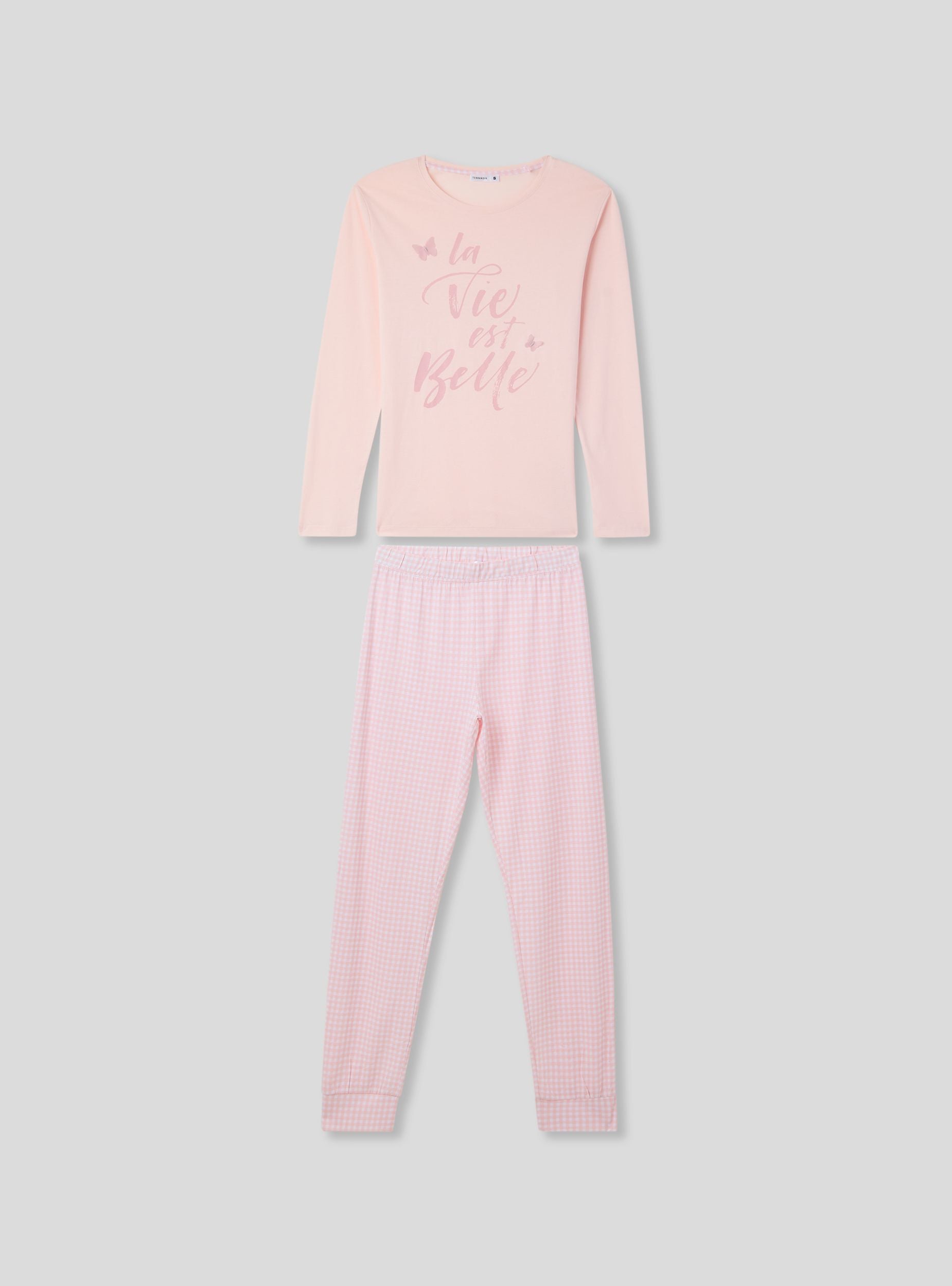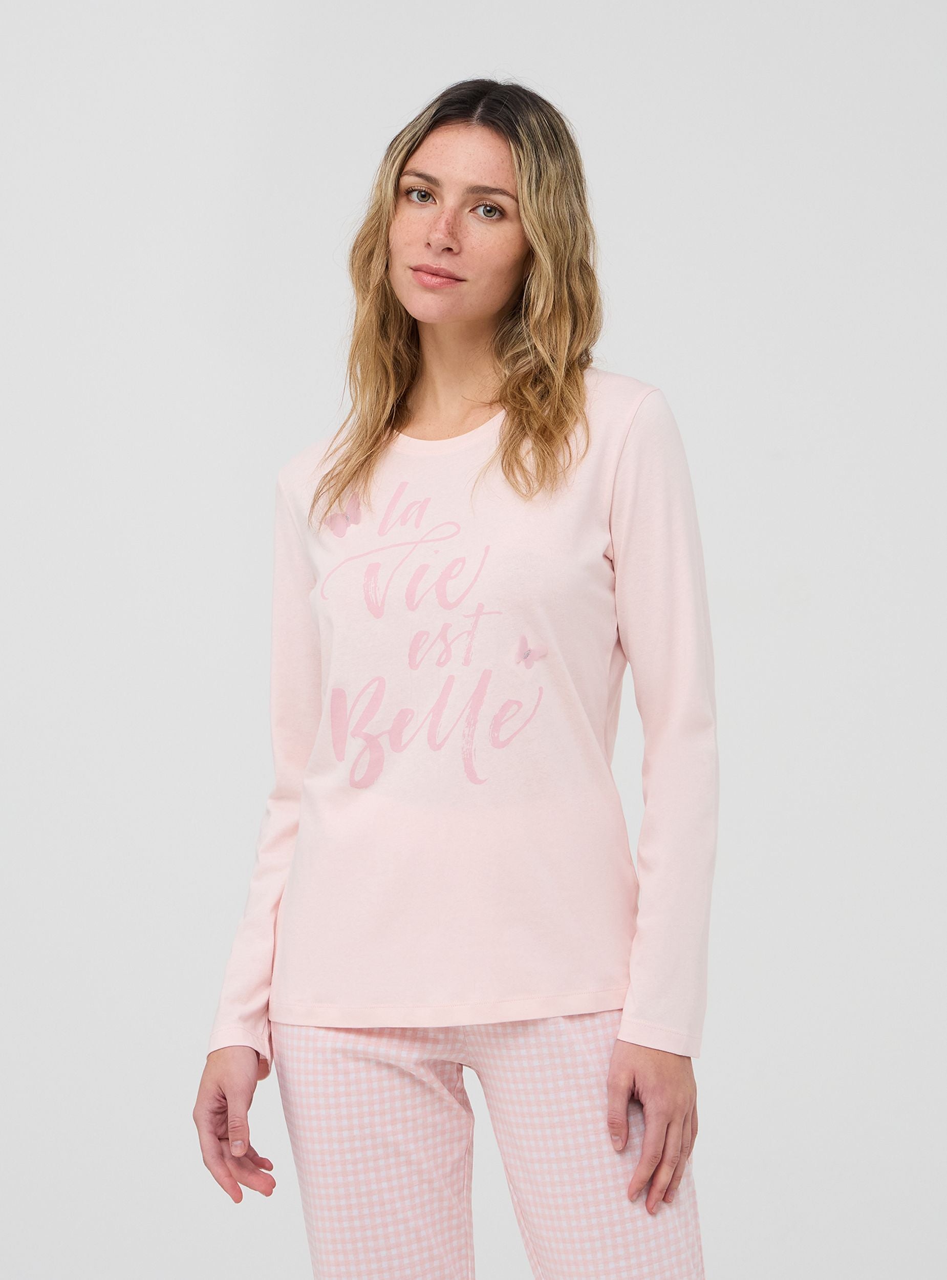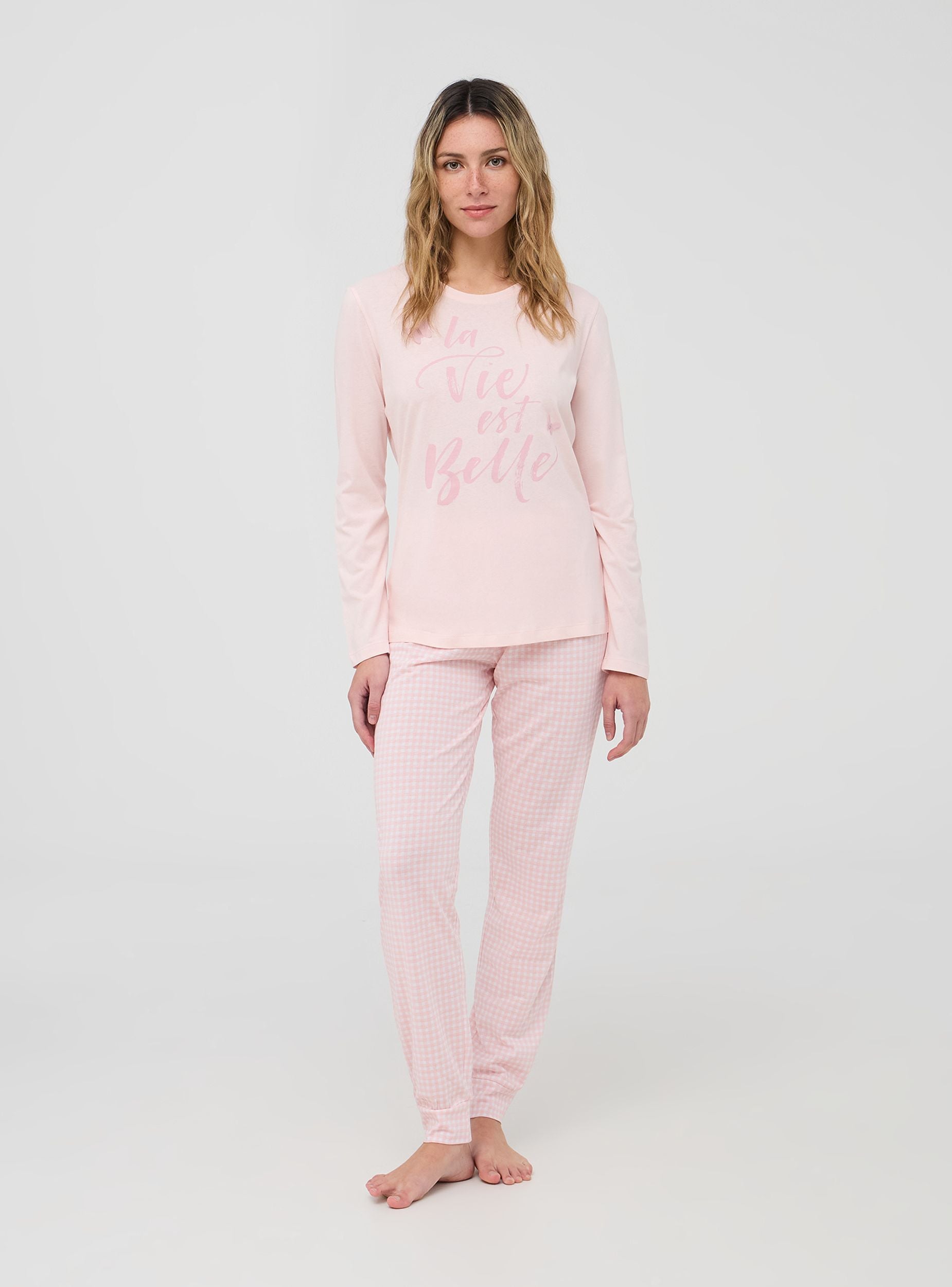 Pigiama da donna composto da una maglia a maniche lunghe con girocollo e scritta decorativa sul davanti, dal carattere romantico e delicato. I pantaloni abbinati presentano un motivo a quadretti, con vita elasticizzata e polsini al fondo per una vestibilità pratica e confortevole. Un set ideale per un look rilassato e femminile, perfetto per i momenti di riposo.Dettagli